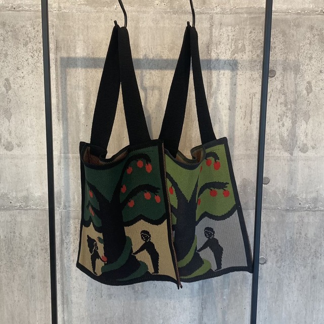 【French Bull】スウィングバッグ/ 風で揺れるお花がモチーフのニットバッグです。 綿糸で度詰めに編み立てたジャガード柄で、表裏両面で異なった配色なので気分やコーディネートに合わせて使い分けれる2way仕様です。 ショルダー部分の紐は幅広で安定感のある持ち心地です。 マチはないのですが、デイリーに使いやすいサイズ感で、A4サイズの書類等も入れていただけます。 ナチュラルな雰囲気やカジュアルスタイルにおすすめのバッグです。 (画像モデル身長:150cm) 素材:綿100% サイズ:Free(高さ:約42cm、幅:約40cm、ショルダー長さ:約65cm) 日本製 ※商品の色味は、ご閲覧いただく環境や照明によって現物と異なる場合がございます