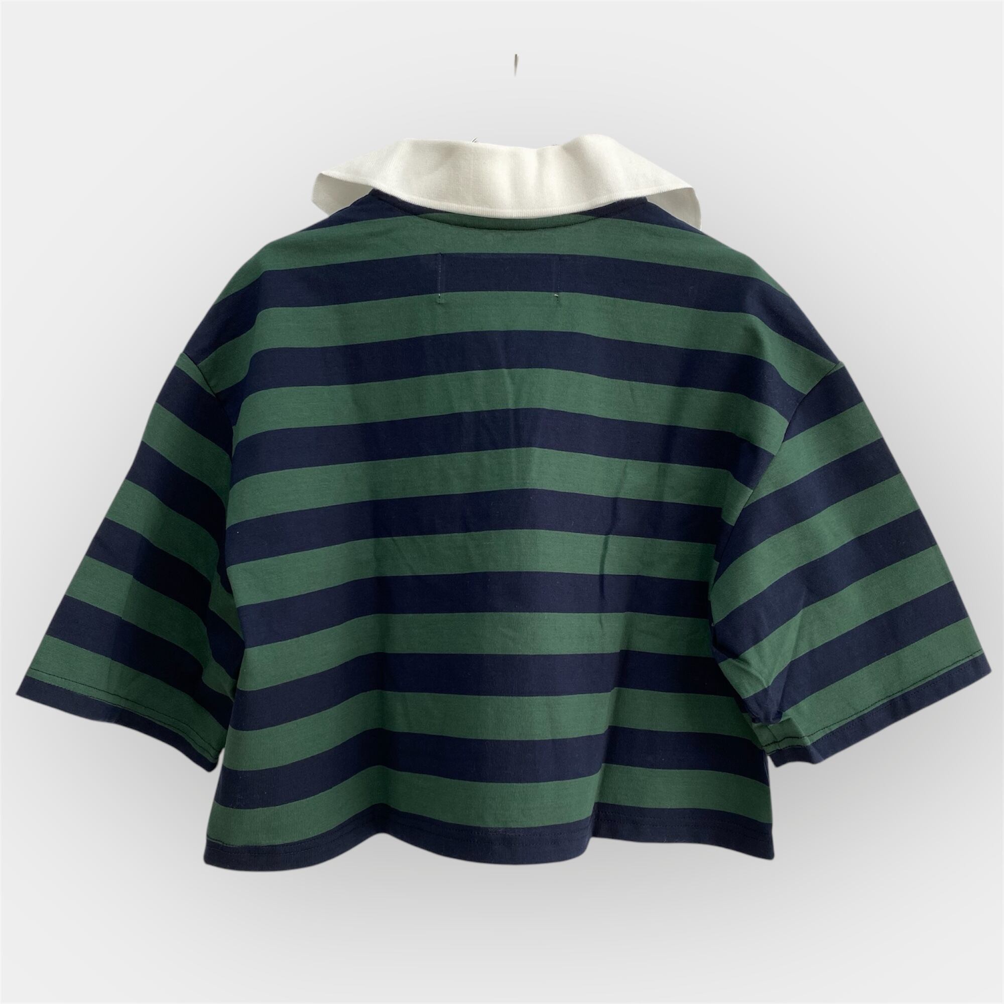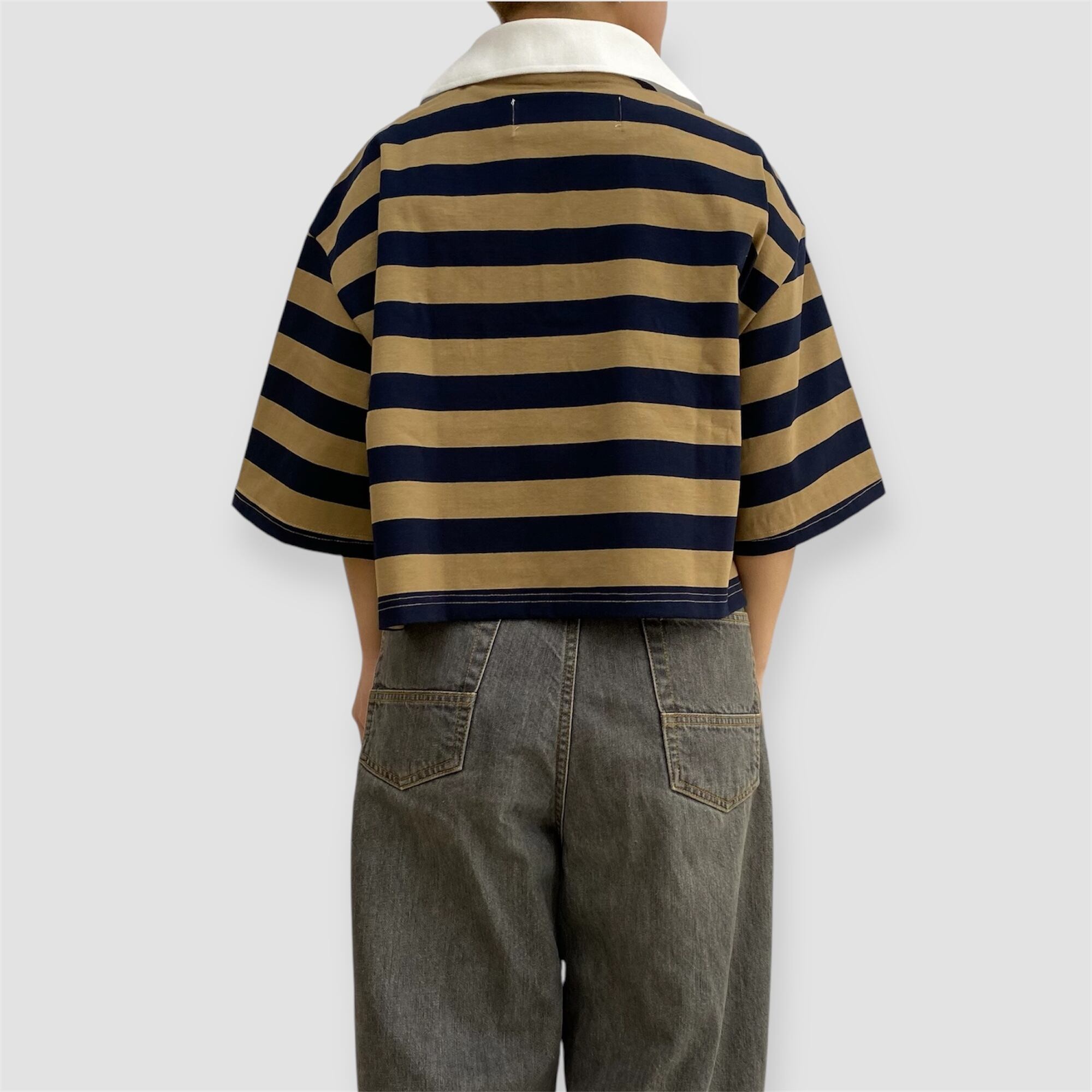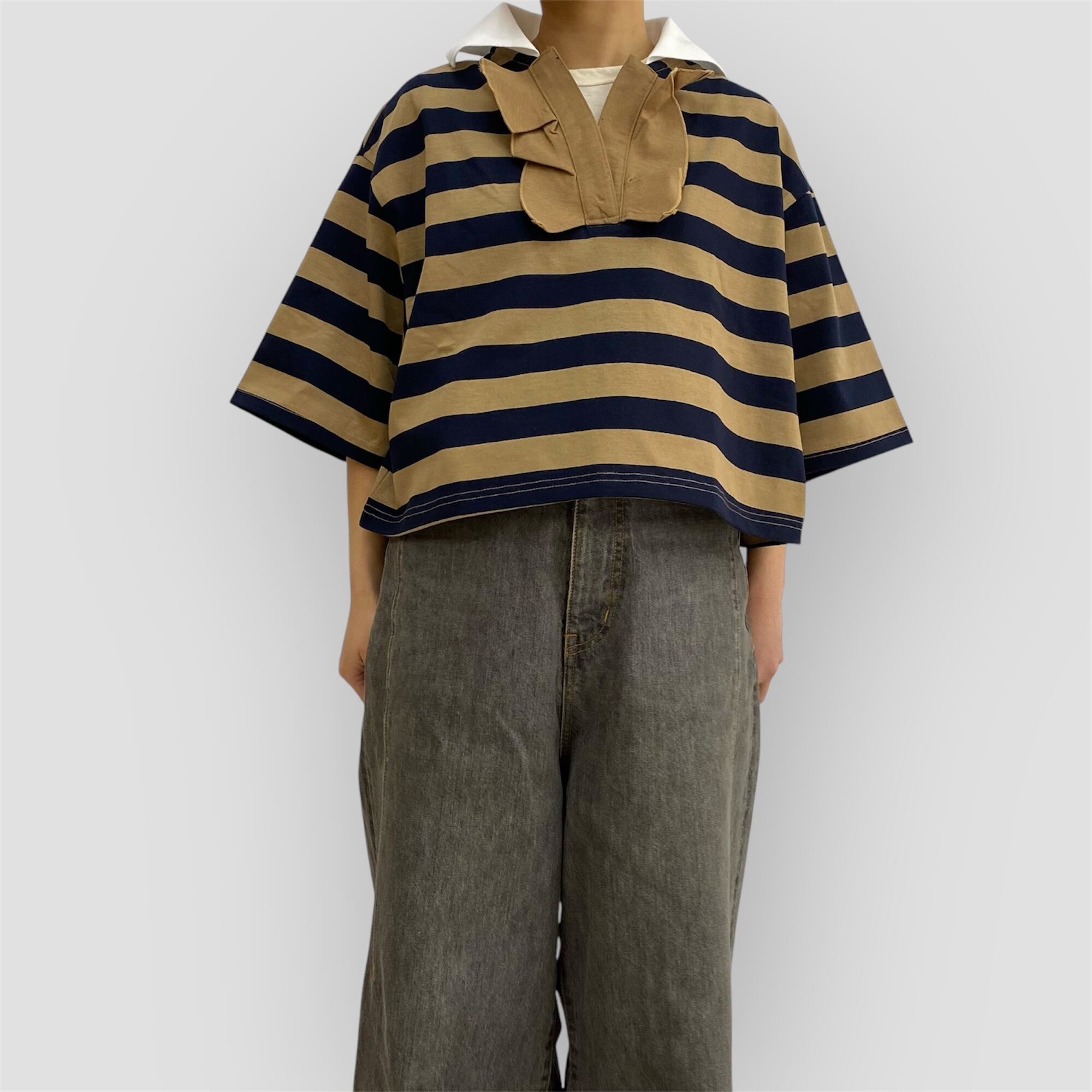 カジュアルなラガーシャツにフリルをプラスしたユニークな一枚です。日本製ならではの丁寧な作りで、デザイン性が高く、スタイリングにも馴染みやすい配色が魅力です。着丈が短めなので、バランスの良いスタイリングが簡単に楽しめます。ボーダー柄がアクセントになり、スタイリングのポイントとして個性的な印象を与えてくれます。普段のコーディネートにちょっとした遊び心を加えたい方におすすめです!(画像モデル身長:150cm)