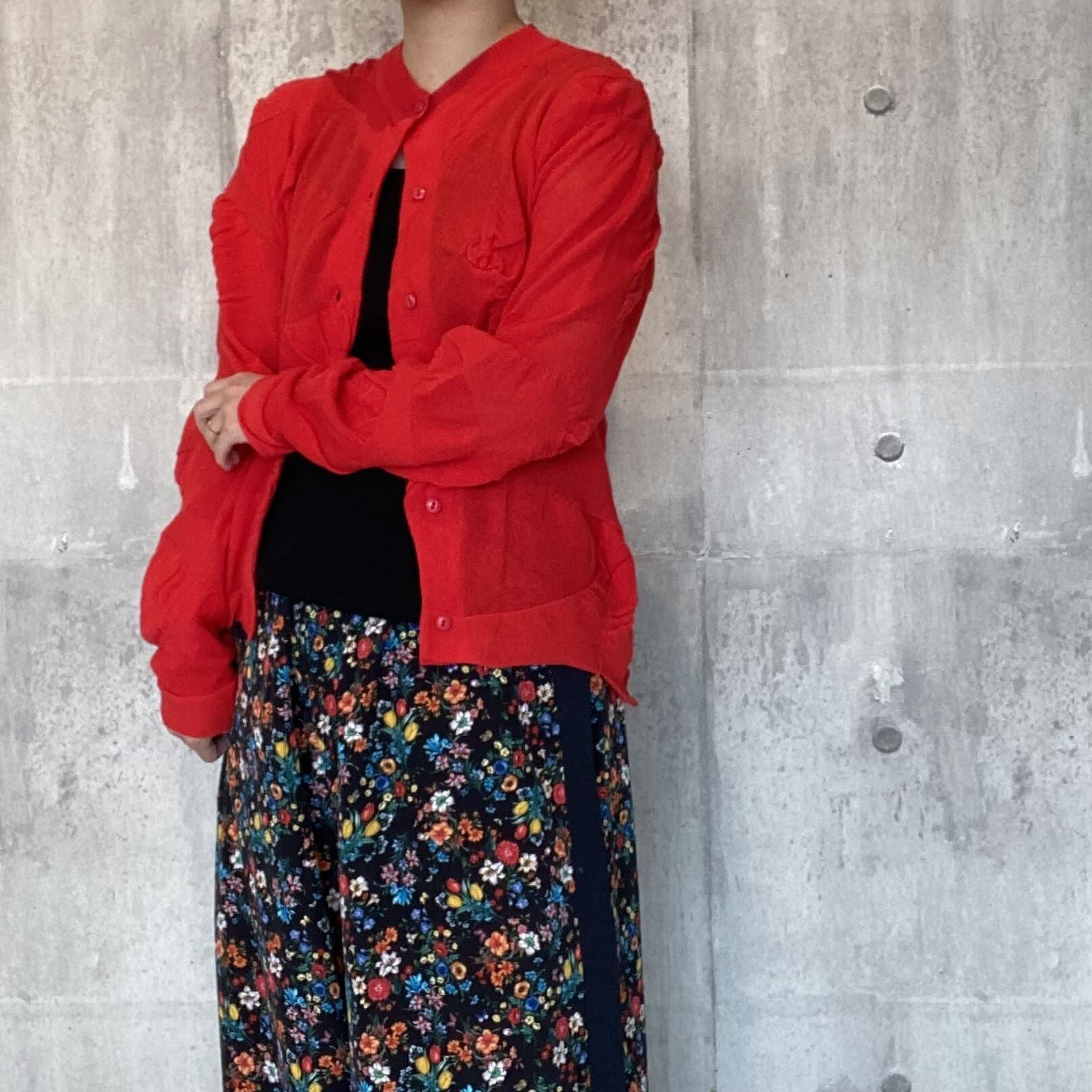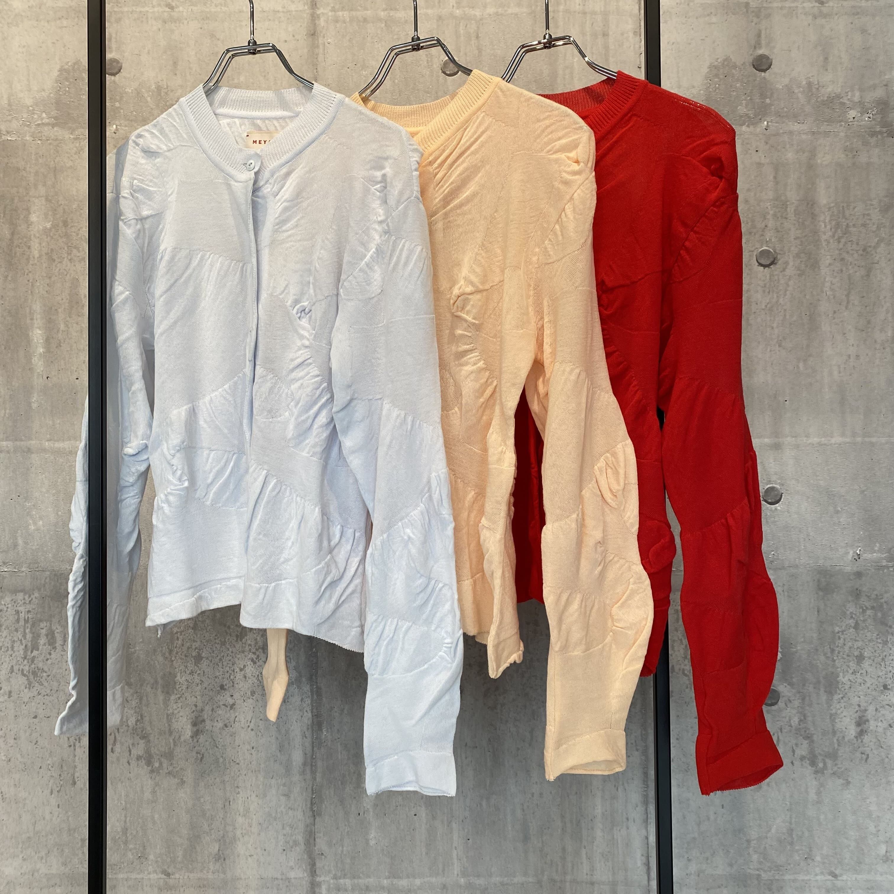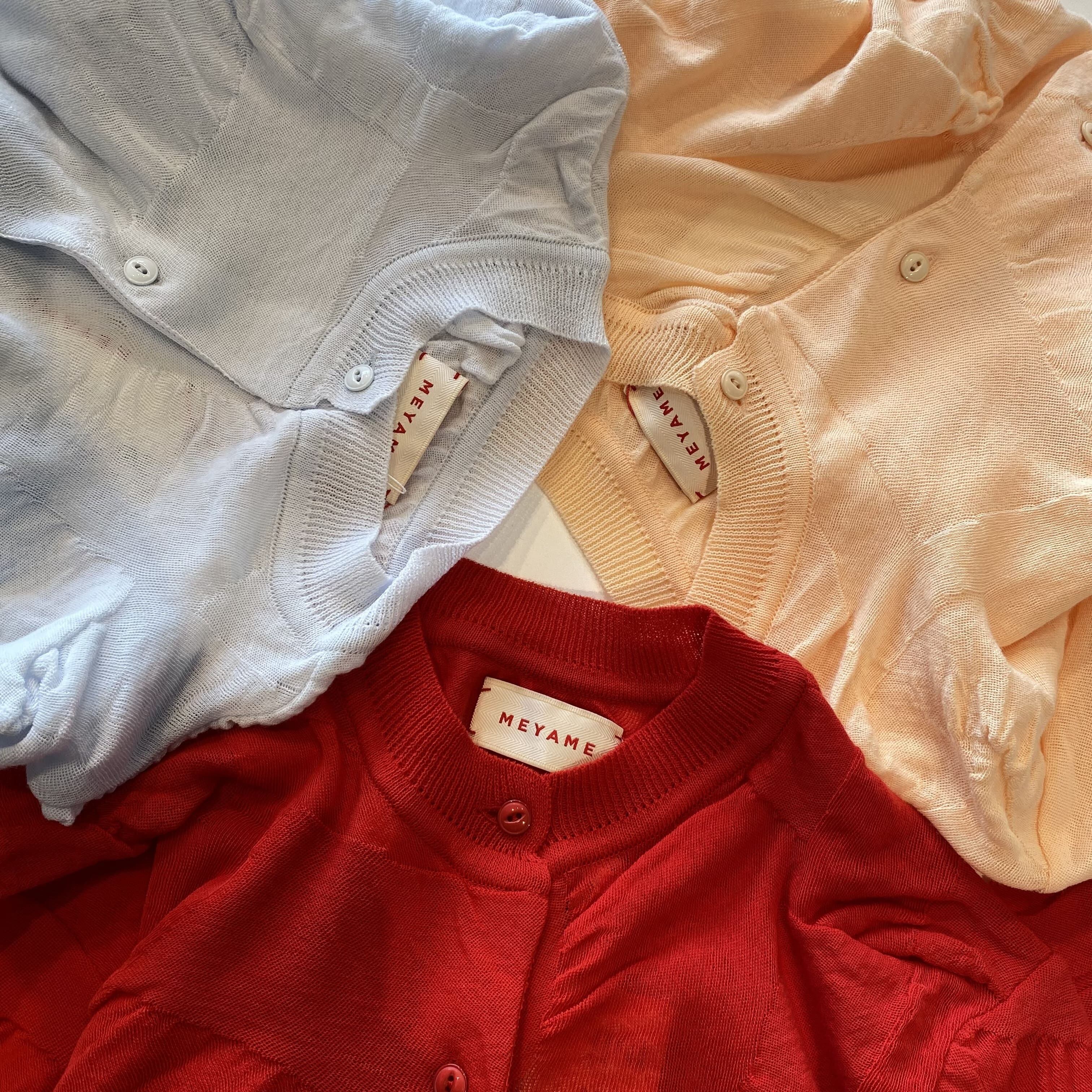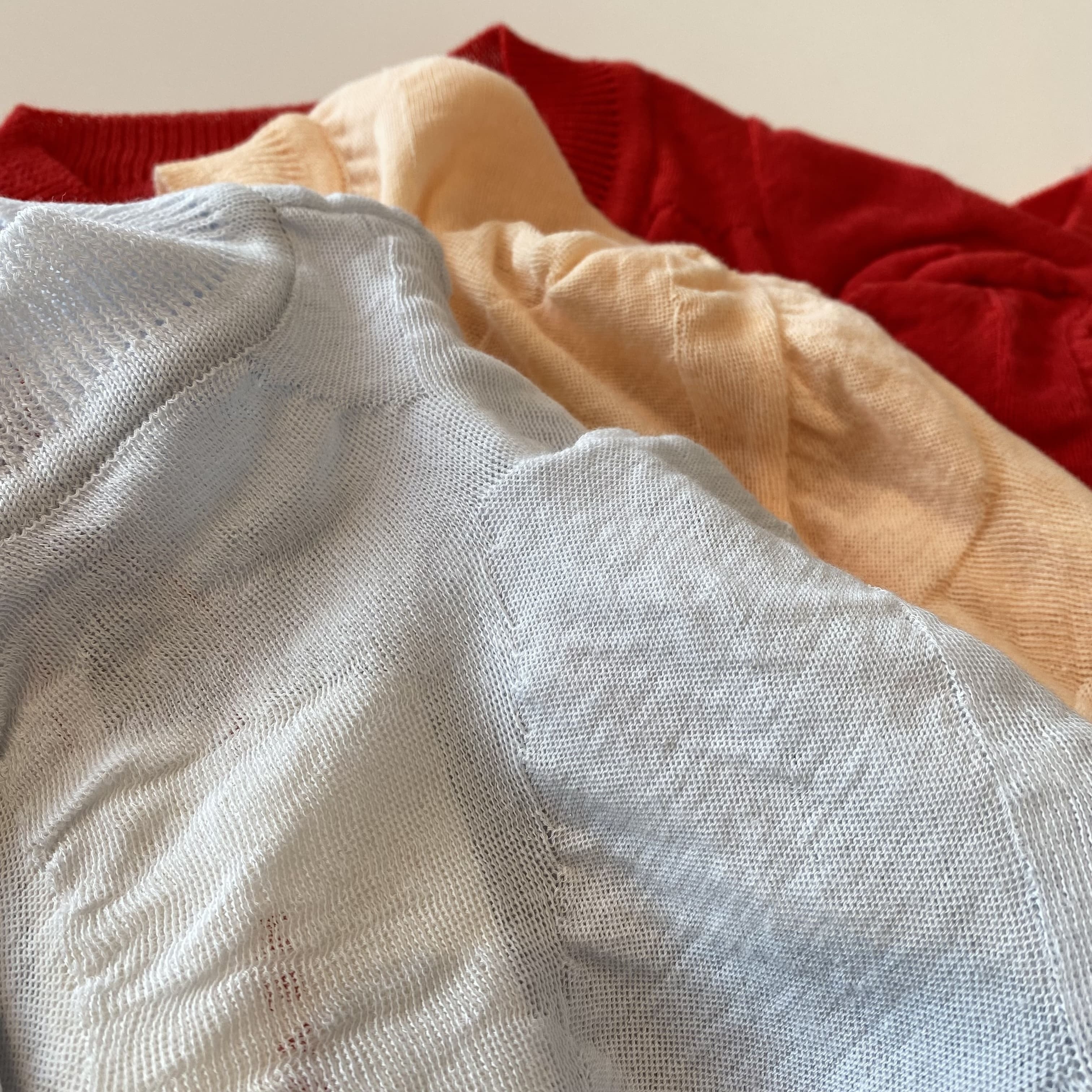 波のように凹凸感のあるとても珍しい編み方をしているニットです。反対方向に斜めに進む糸を互いちがいに編むことでこういった編み地になります。一見コンパクトに見えますが、伸縮性がある生地なので窮屈な感じはなく快適な着心地です。肌触りの良いサラッとしたコットンで春から夏まで長く着用でき、暑い時期は日除け対策や冷房対策としても活躍します。カラーは柔らかい淡色のオレンジとブルー(画像では白に近いですが、薄っすらとしたブルーです。)、パキッとした発色が綺麗なレッドの3色展開です。洗濯可能です。(画像モデル身長:150cm)