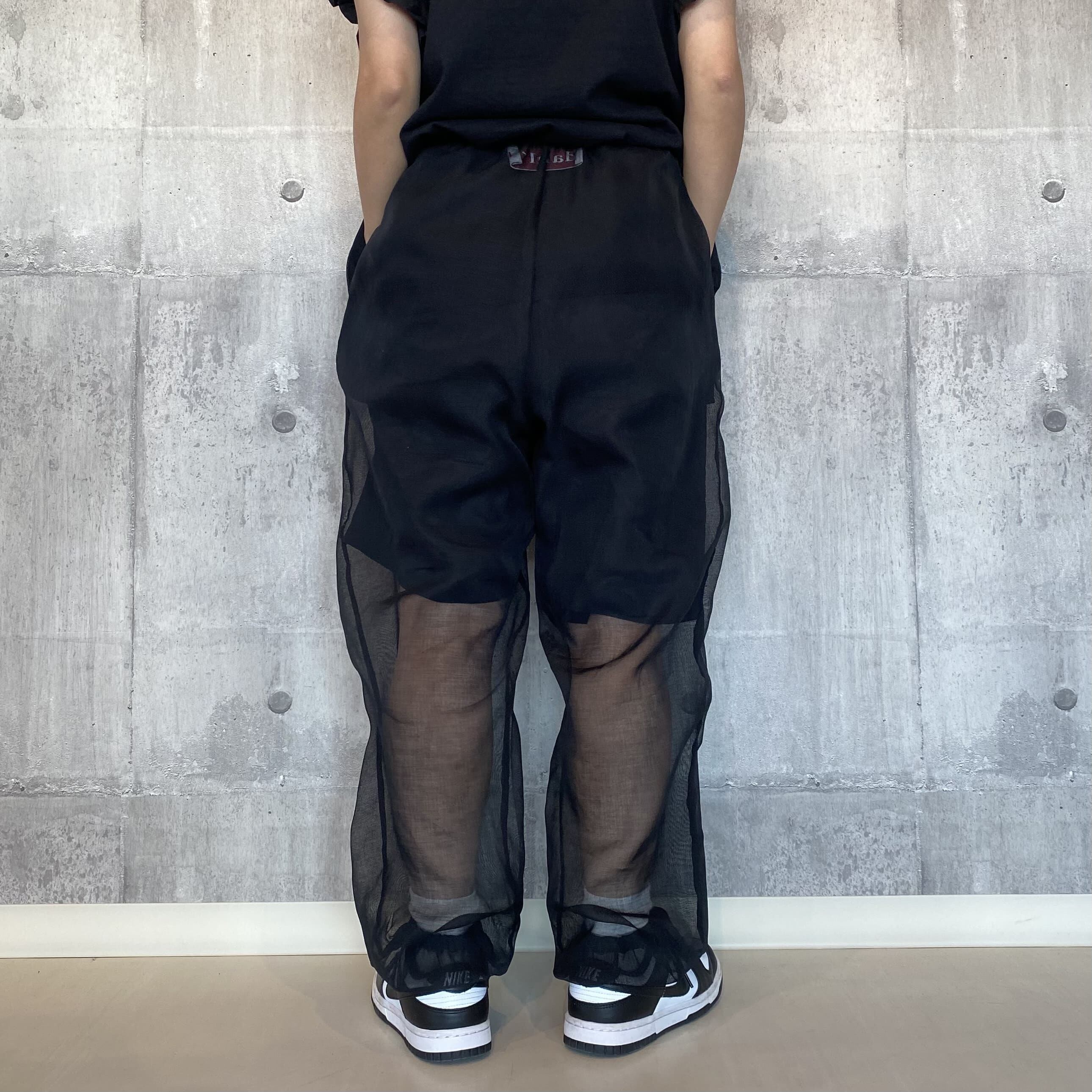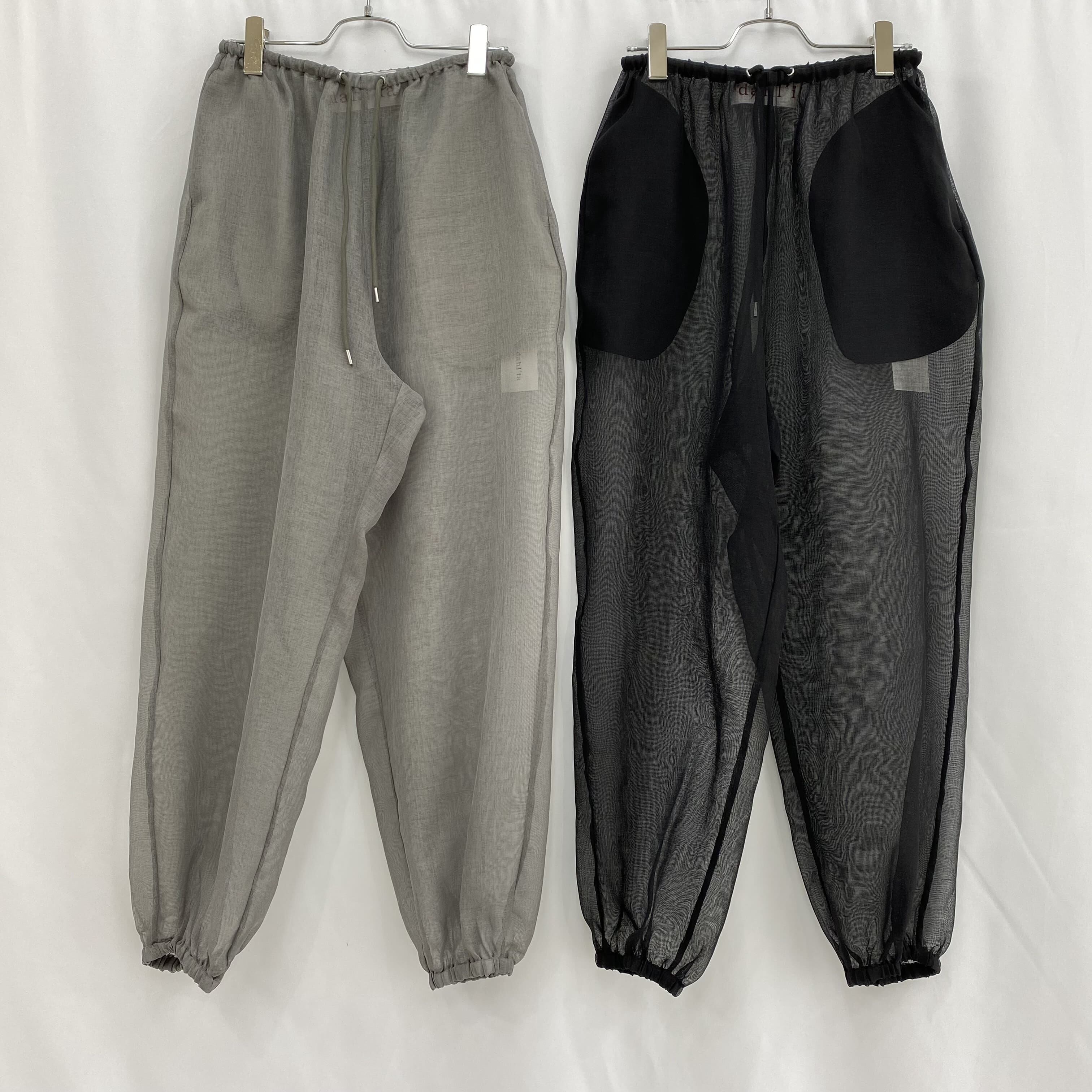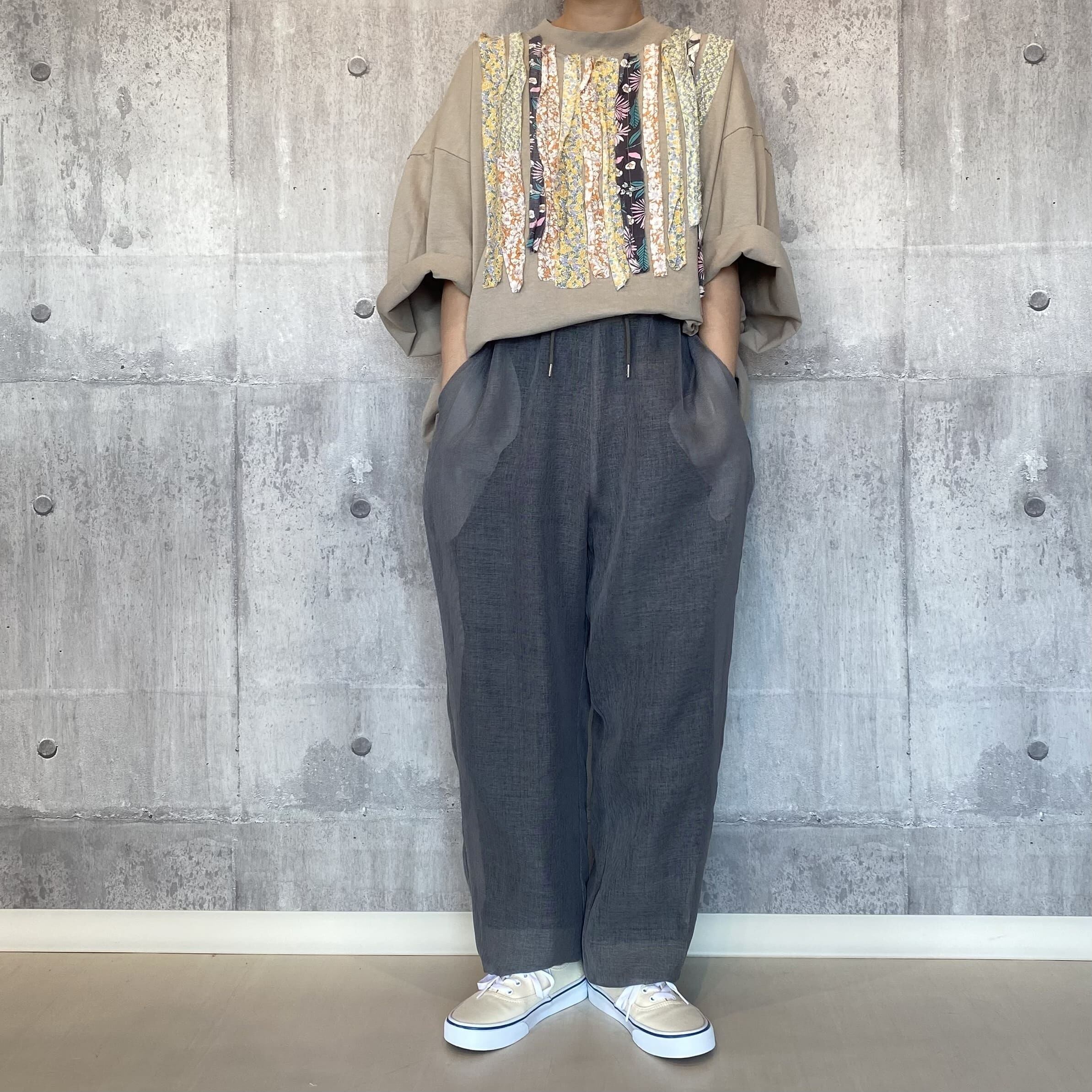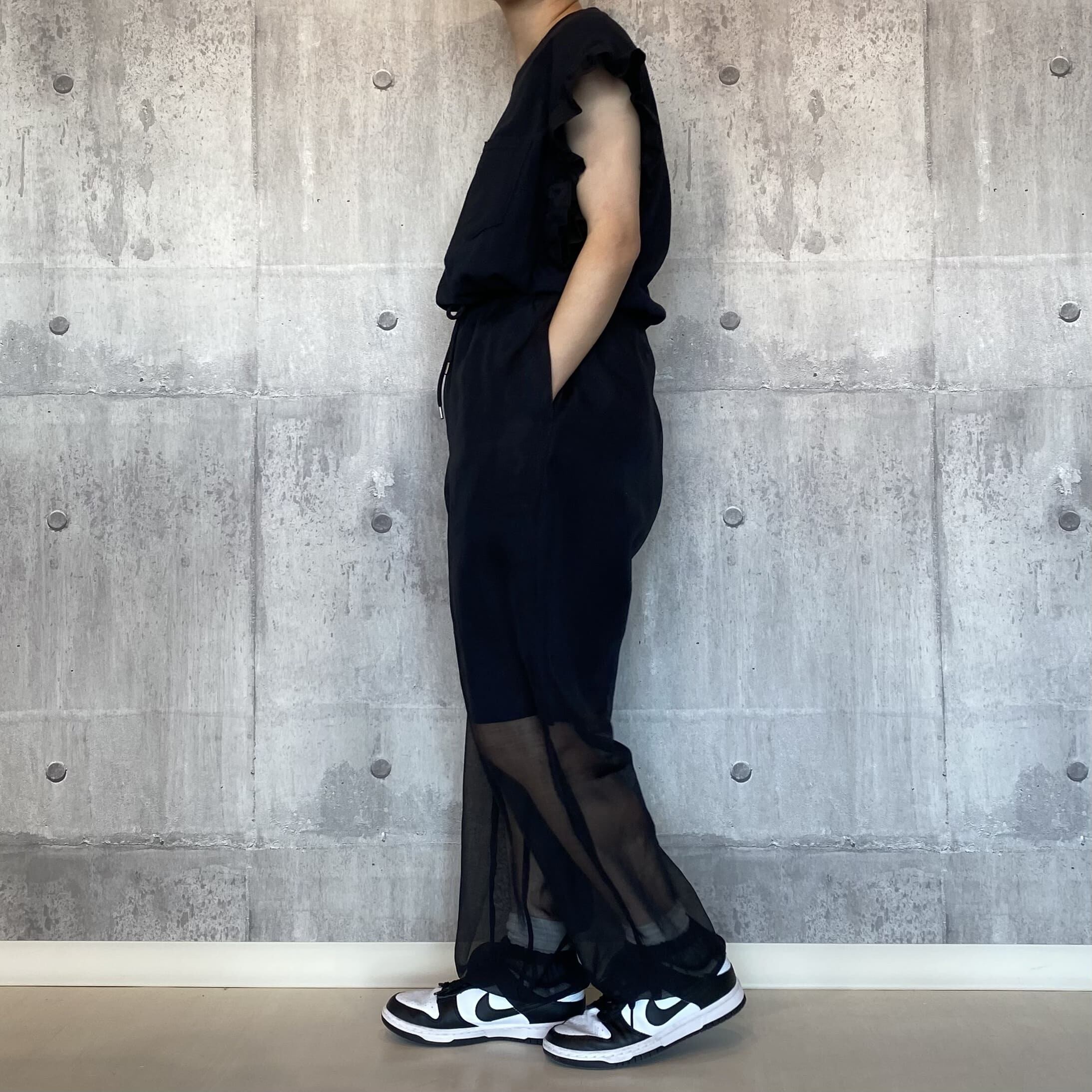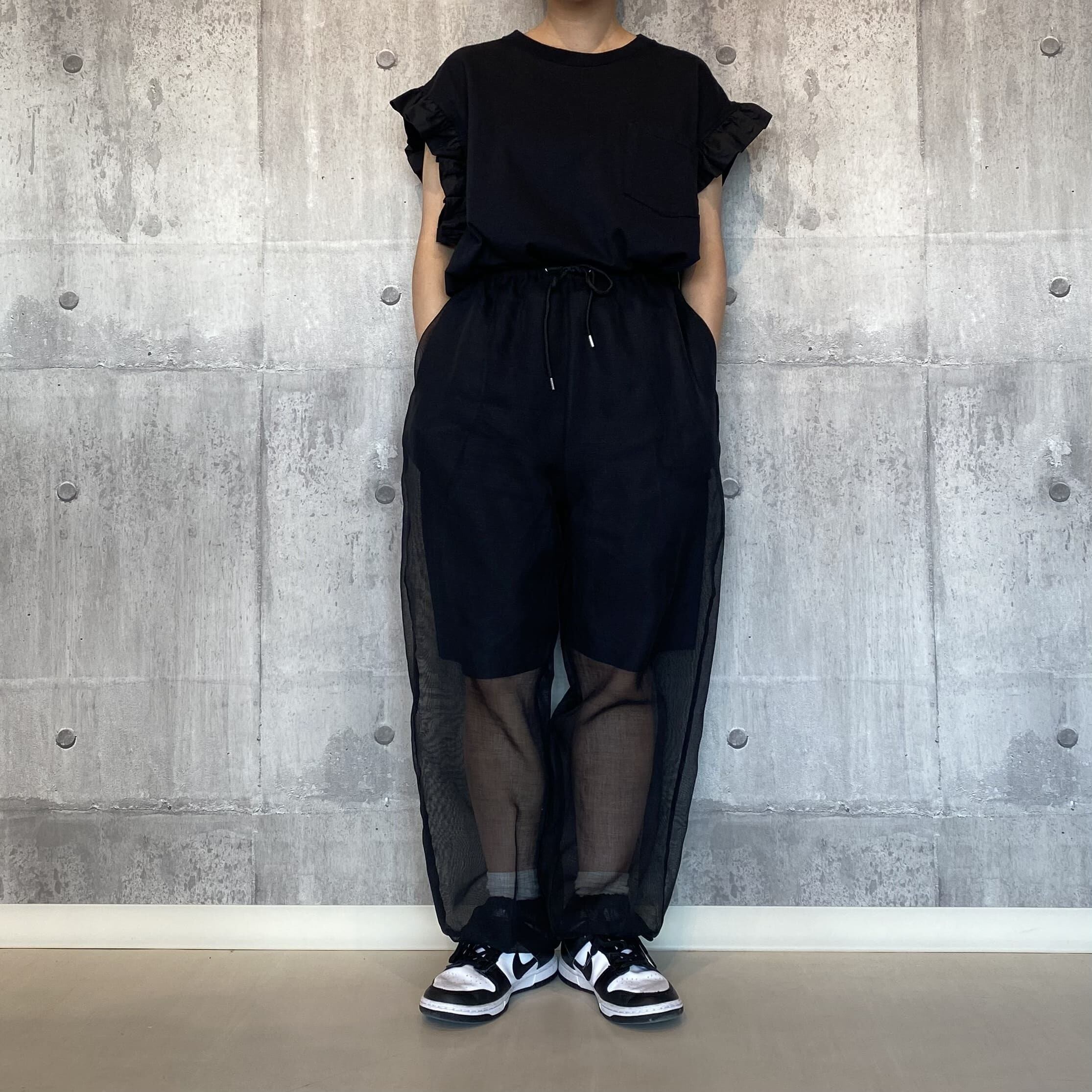 透け感がポイントで、ウエストはドローコードで調節可能◎ゆったりとした穿き心地で、裾はゴム仕様で絞っている為、膨張し過ぎずすっきりとした軽い印象です。レギンスやショートパンツなどインナーと合わせて様々なレイヤードスタイルを楽しめます。