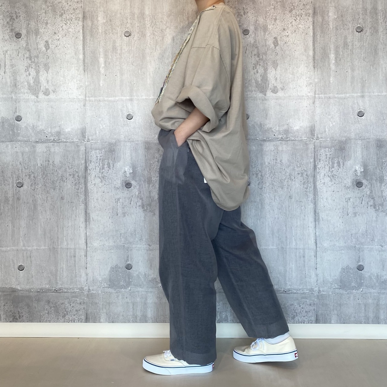 ・スタイリング画像グレーはインナーにデニムパンツを重ねています。