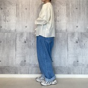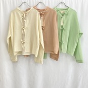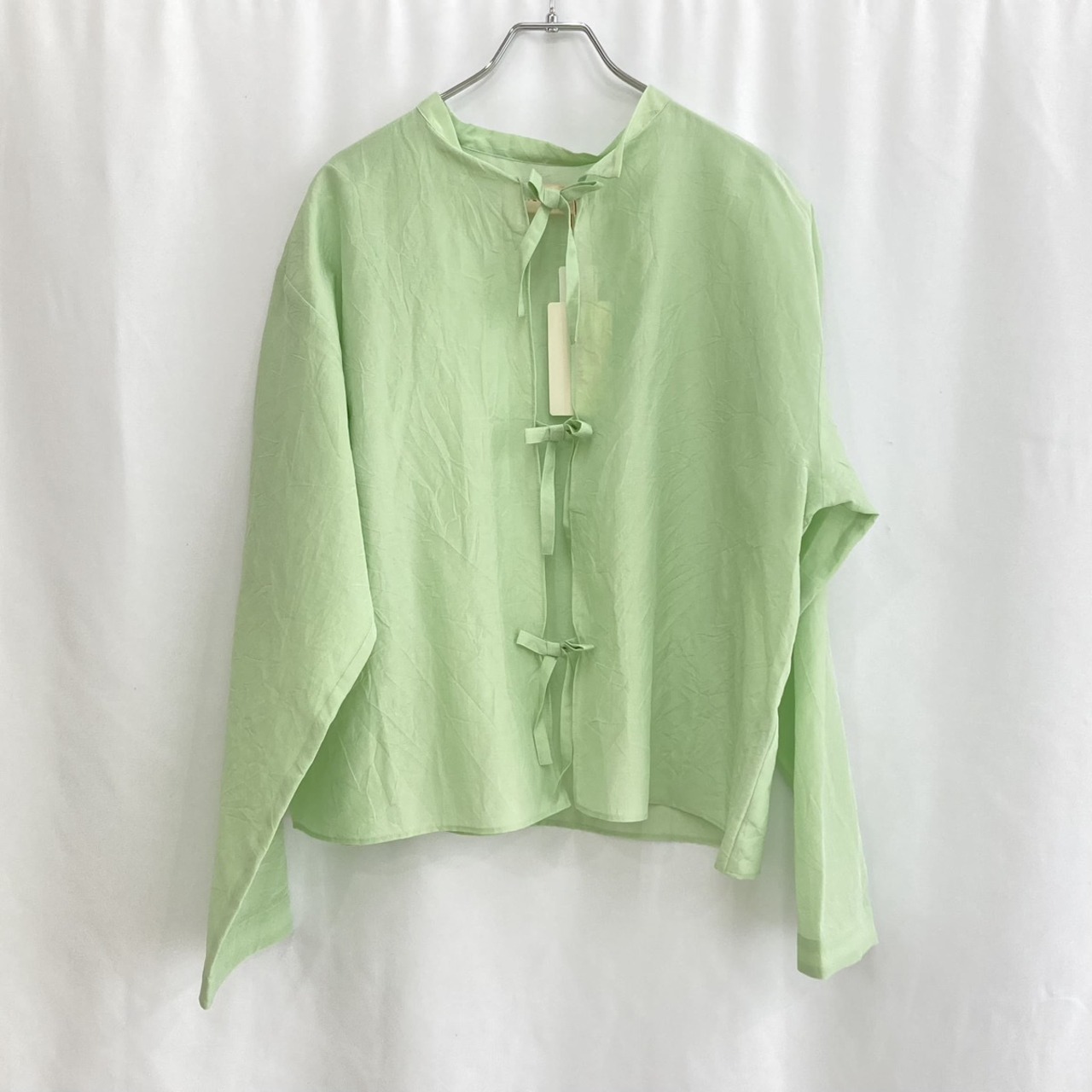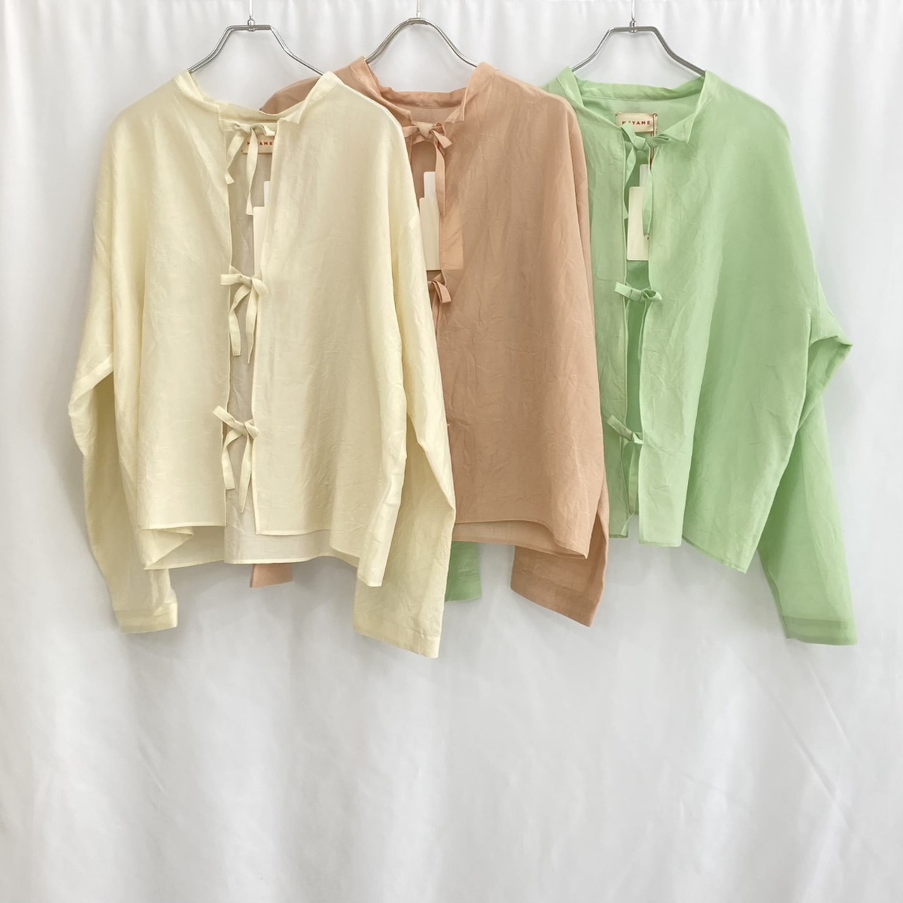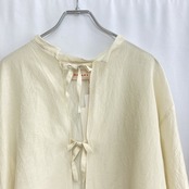 年間を通して長い期間着られる、ブラウスとジャケットの中間のようなアイテムです。羽織として、冷房対策、日除け対策にと、とても便利な一枚です。少し光沢と透け感のある生地は、軽く肌あたりの良いやや薄手のコットンシルクです。シワ加工を施すことで無地の中にも豊かな表情がある素材となっております。着ていることを忘れそうなほど軽く柔らかです。シワ加工されているので、くしゅくしゅと丸めてバッグに入れても大丈夫。旅行や出張などでもとても重宝します。やや広めの身幅にやや短めの着丈で、バランスを取りやすいシルエットです。フロントの紐は結ばずに垂らしたり、軽く一回だけ結んだり、色々な表情を楽しめます。少し長めの袖はシャツのようにロールアップしてもいい雰囲気に。お家で洗濯可能。