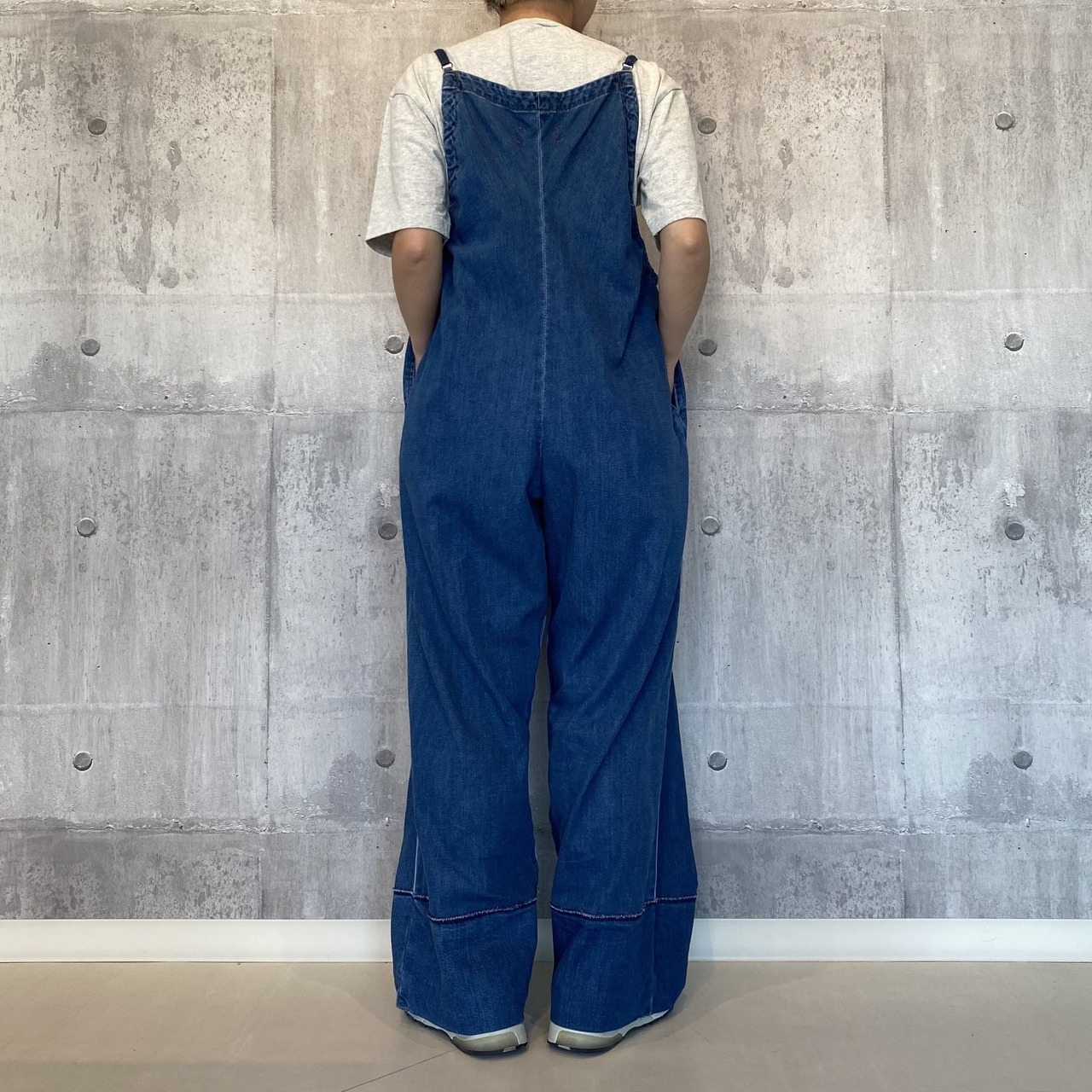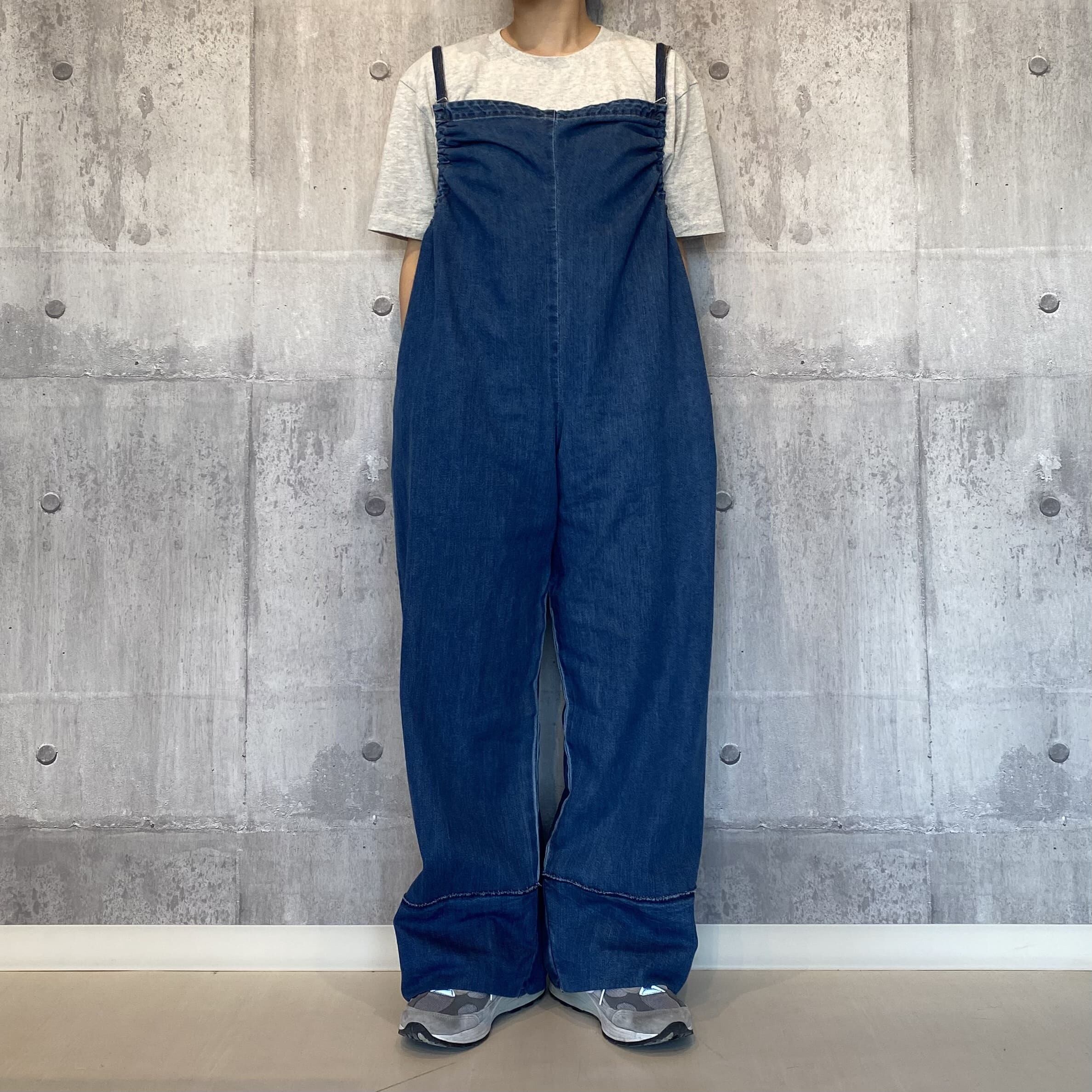 カジュアルさと上品さが絶妙なオールインワンです。ギャザーを寄せたややコンパクトなトップス部分と、ワイドなパンツ部分が自然に繋がった美しいシルエット。サイドから見たときのギャザーのカーブがとても自然で綺麗に作られております。深く折り返した裾が全体を引き締めてバランスを取りやすくしています。肩紐についたアジャスターで丈を調節できるので、幅広い身長の方に着用いただけます。デニム生地はポリエステルが入った薄手の生地を使用しており、とても軽量で柔らかいのもポイントです。(暑い季節も快適に着用できます。)