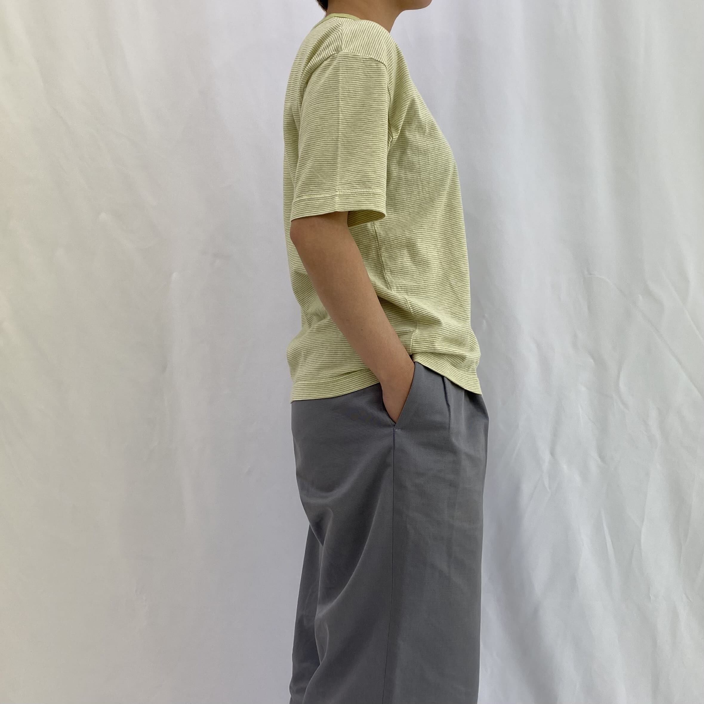 ボーダーはボーダーでも、少し離れて見ると無地に見える細かいボーダーは、カジュアルになり過ぎず、クリーンな印象でコーディネートを組んでいただけます。