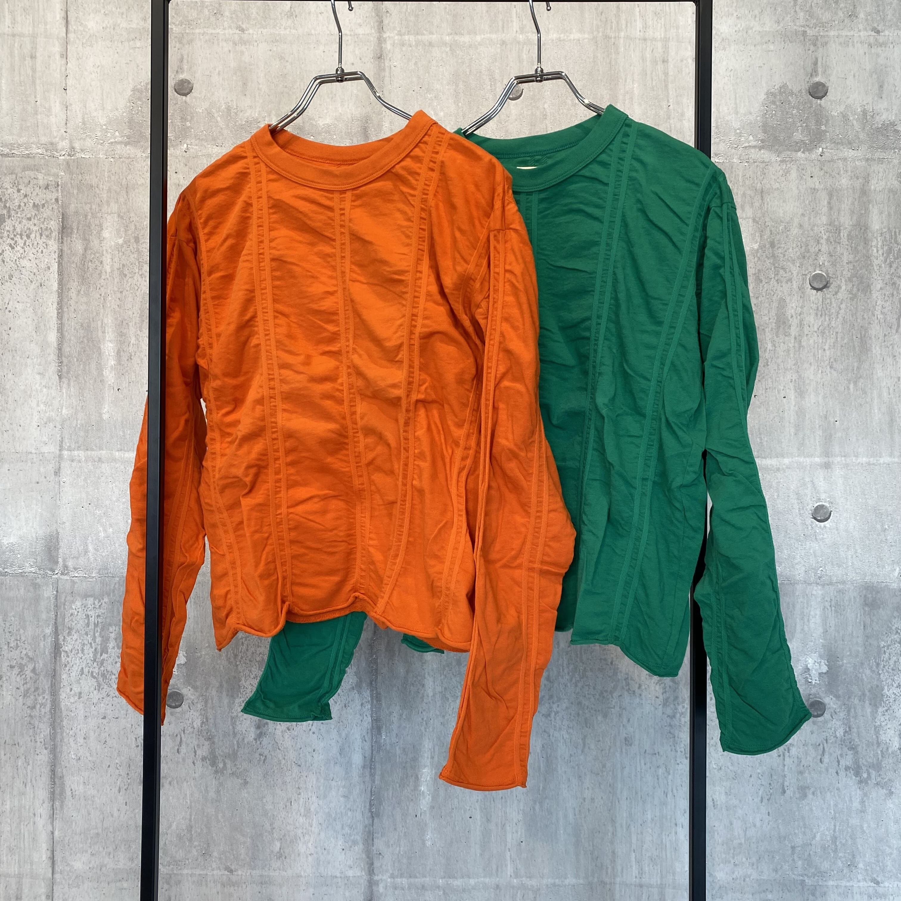 全体を斜行させ、縦に入ったジャガード部分とそれ以外の部分の対比で独自のシワを出したデザインが特徴です。鮮やかなカラー展開で、1枚でサラッと着ても良し、重ね着でインナー使いにしてもアレンジの効くトップスです。コンパクトな丈とやや広い身幅でバランスも良く、幅広いボトムスとの合わせを楽しめます。素材の持つ柔らかさを活かすために、裾と袖口を自然にくるっとロールアップした仕様です。