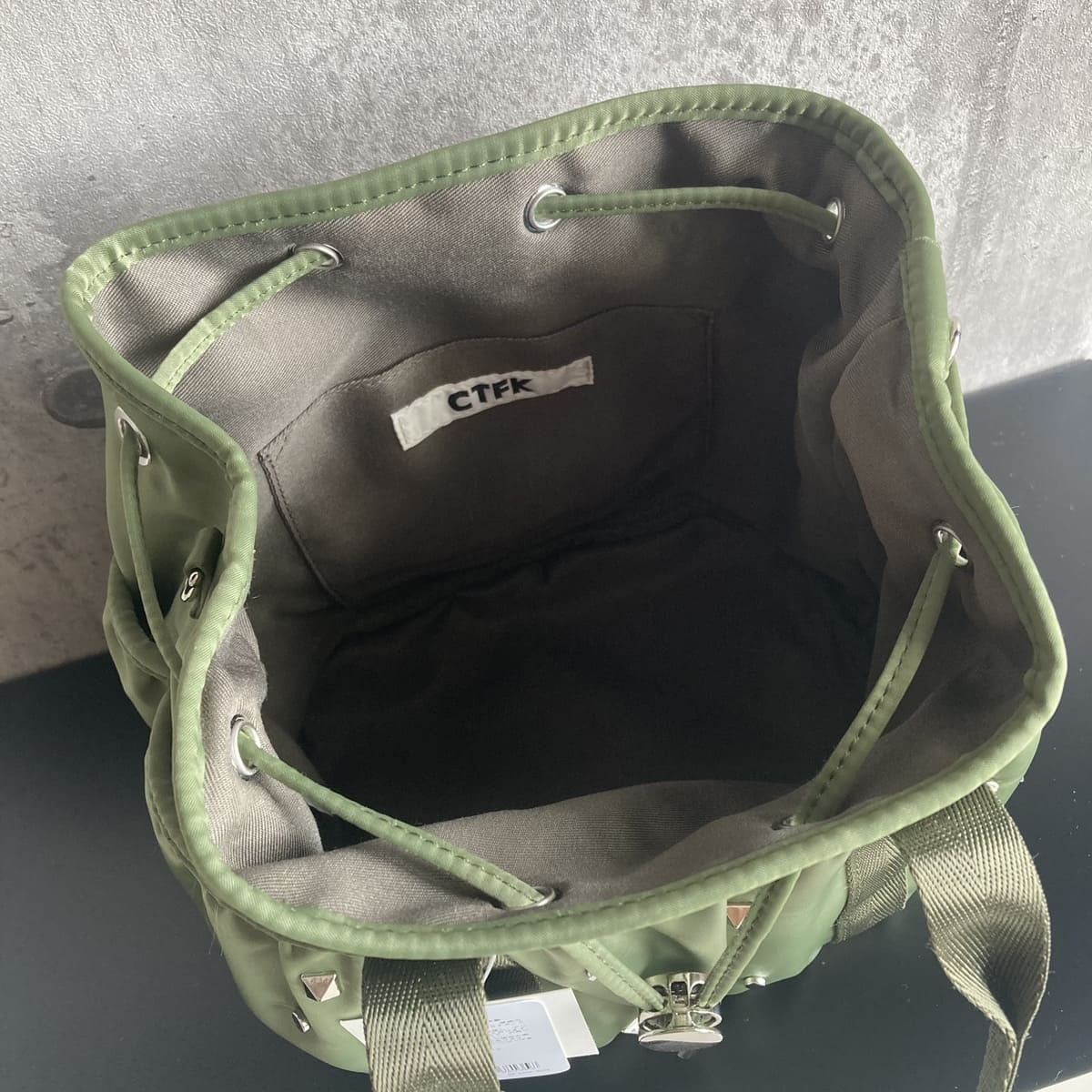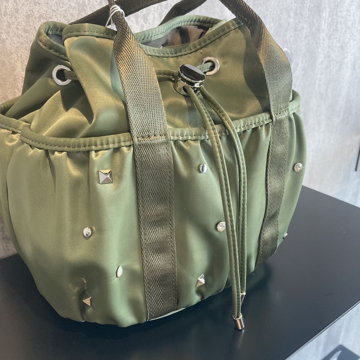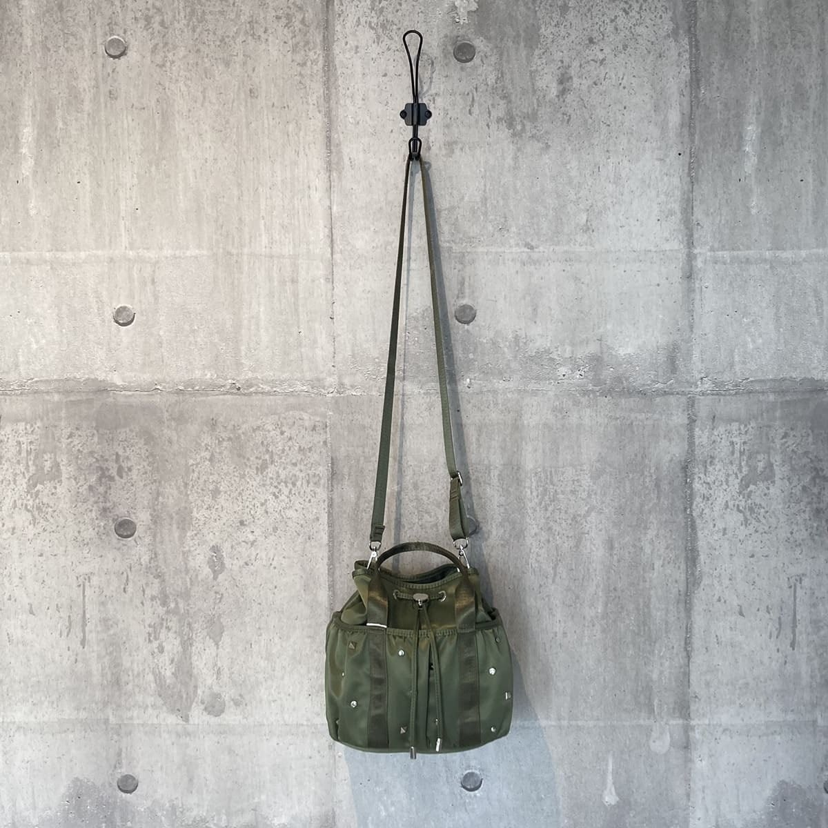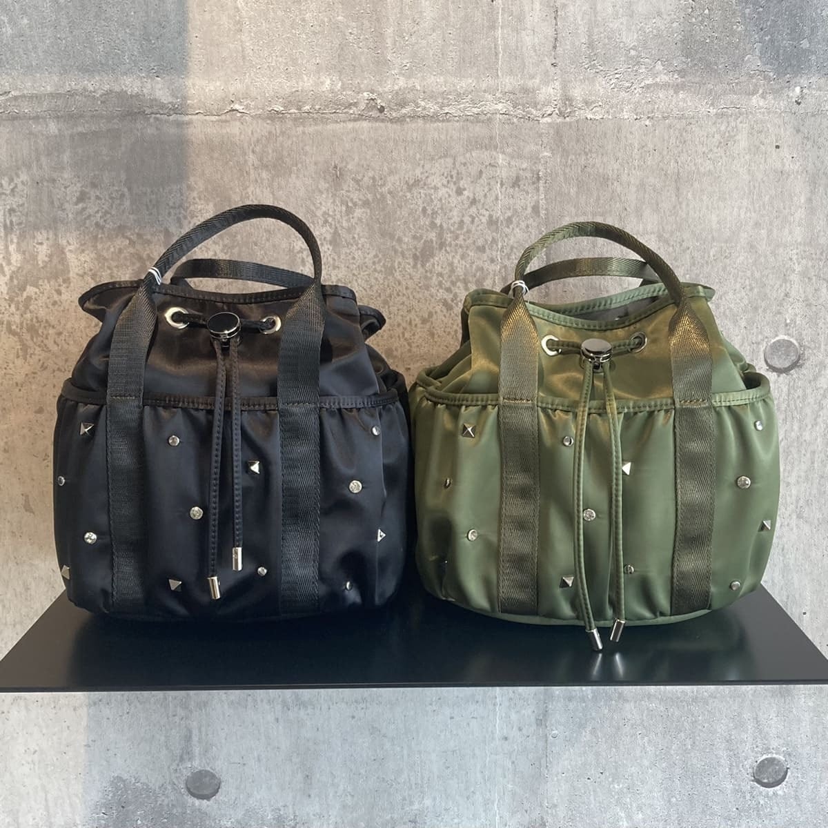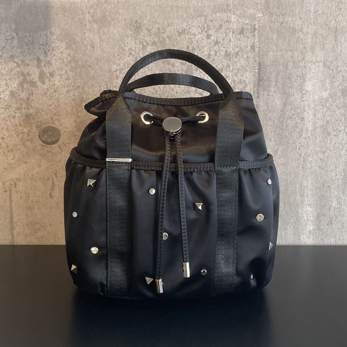 3種類のスタッズが散りばめられた巾着バッグです。ショルダーは取り外しができるので、ハンドバッグとしてもお使いいただけます。しっかりとした底マチと立体的なシルエットで、出し入れしやすいのが嬉しいポイント。前面・背面に便利なポケット付きです。