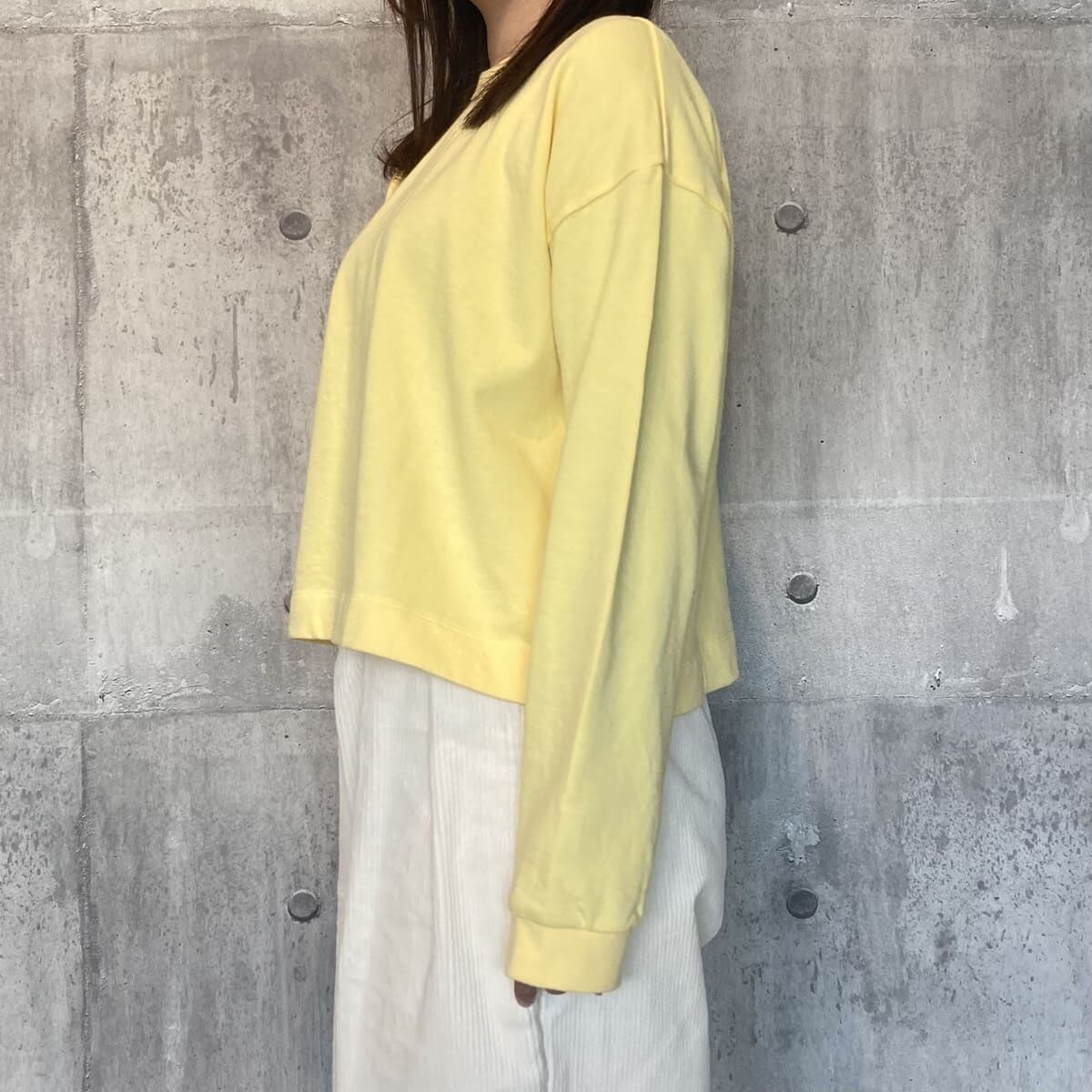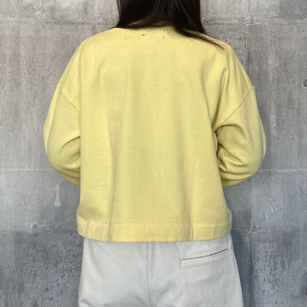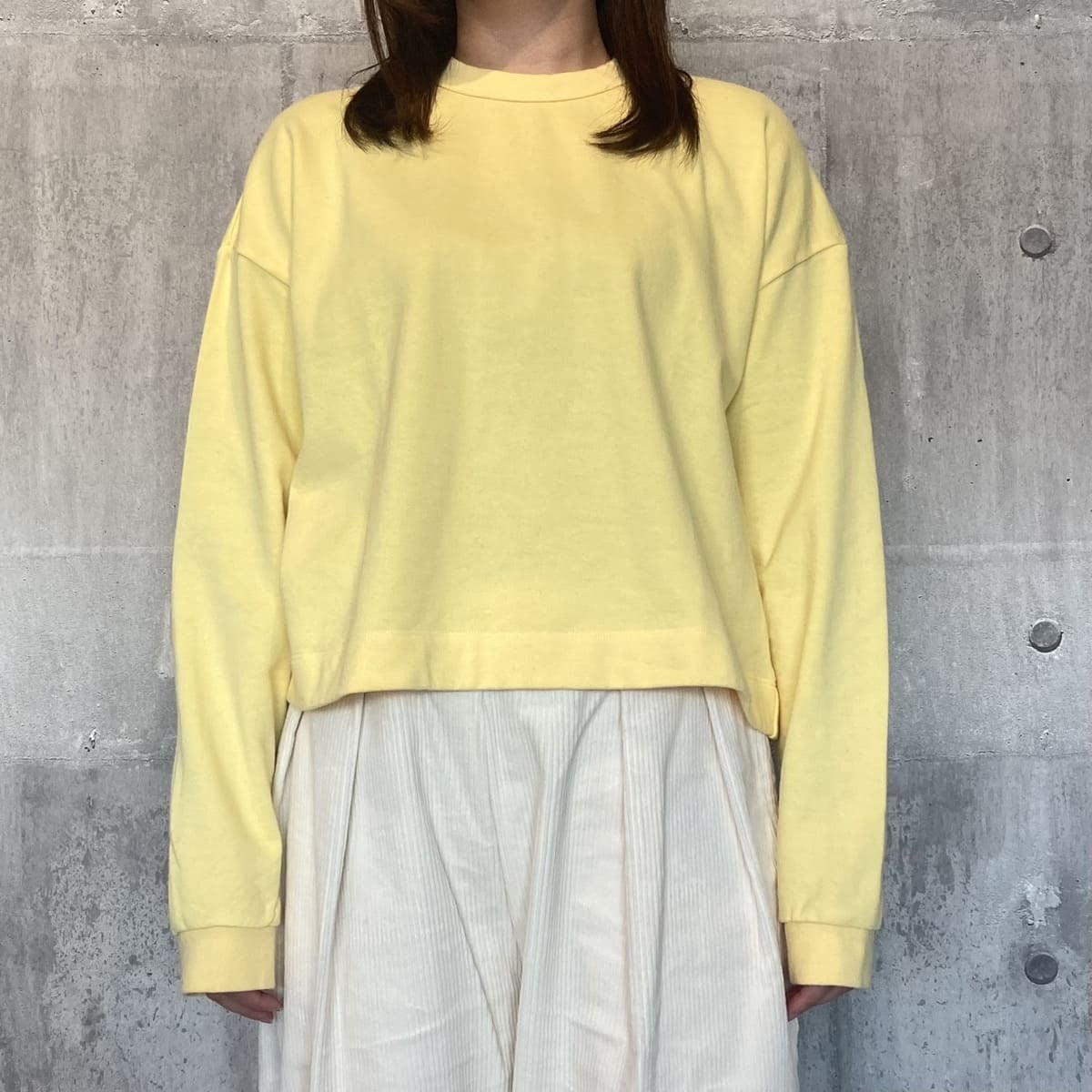 スエットとロンTの中間位の一年を通して着られる素材を MEYAME オリジナルで作りました。軽さと滑らかな肌触りを併せ持つ素材です。少し光沢があることでカジュアルになり過ぎません。形は着丈短め、身幅広め、袖やや長めのバランスが取りやすい、MEYAME のトップスの特徴が詰まった一枚です。お家で洗濯可能。