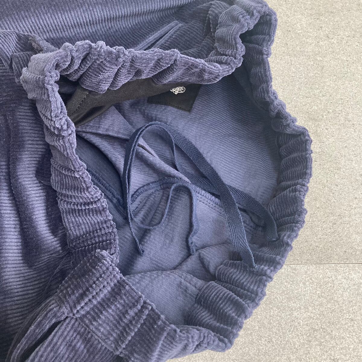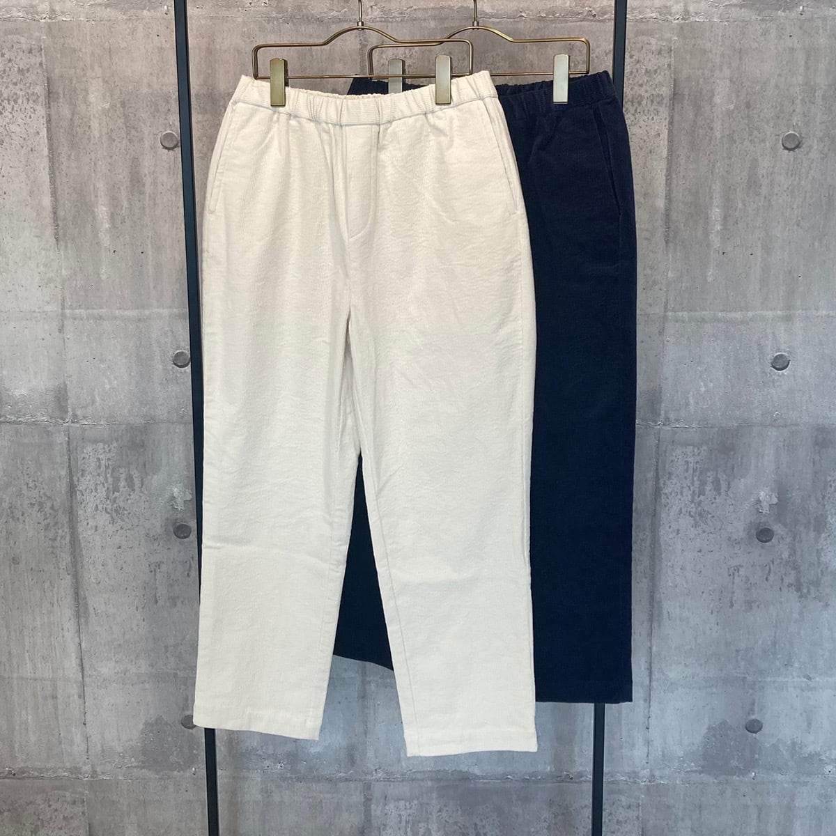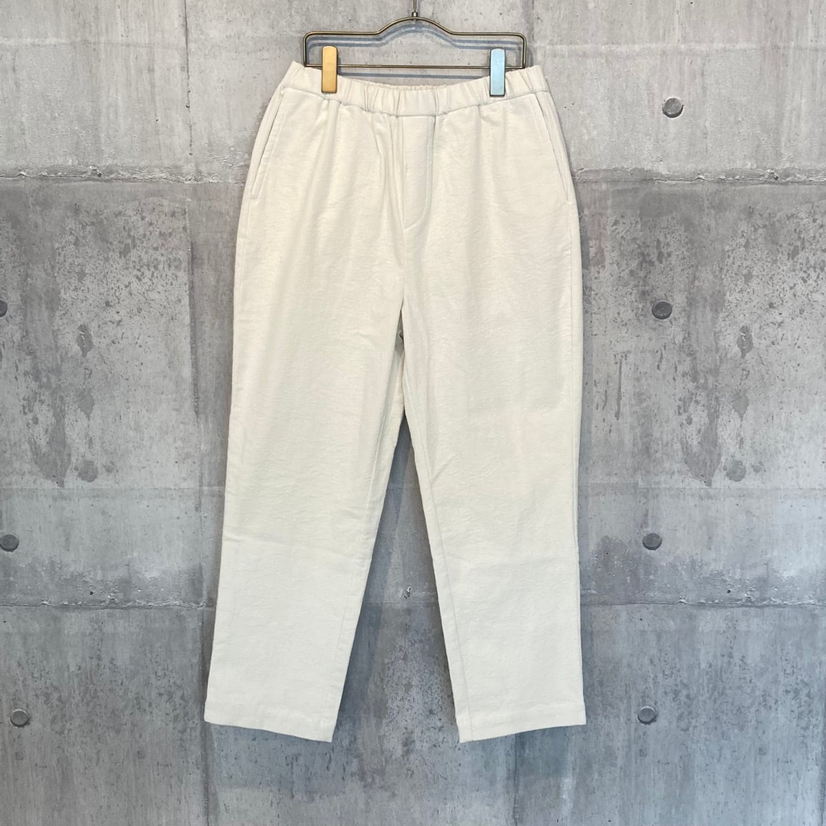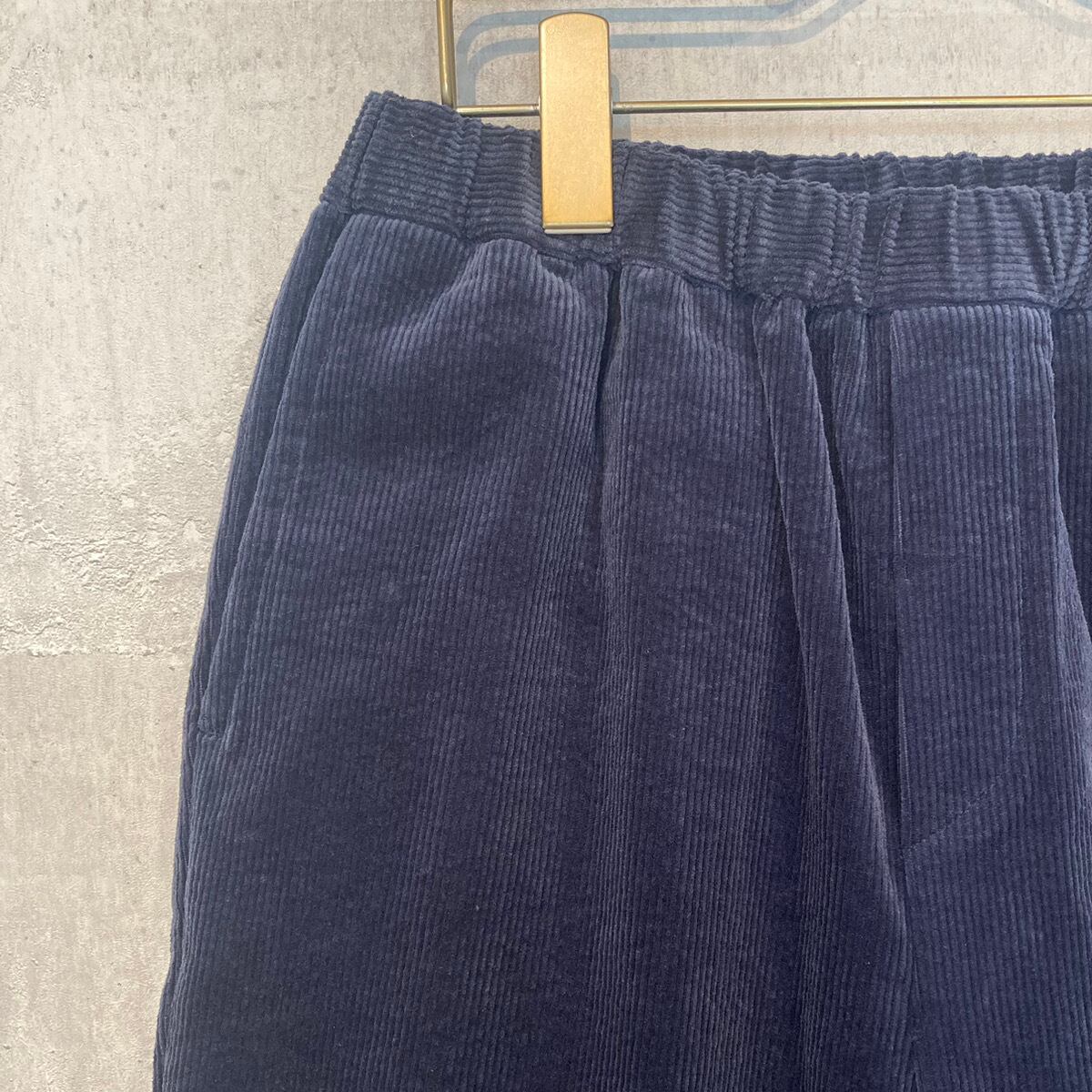 しっかりとした打ち込みのオーセンティックなコーデュロイ生地を使用し、ウエスト周りがゴワつかないよう、細畝のコーデュロイに仕上げています。程よくボリュームを抑えながらも、起毛感のある見た目で季節のあるボトムスです。こちらはウエスト部分全体にゴムが入っており、さらに内側から紐で調節が可能なイージー仕様のパンツです。腰まわりはゆったり、そして裾にかけて細くなるテーパードパンツは、すっきりとしたシルエットが特徴です。股下の長さを短めに設定することで、足首周りがもたつかず軽やかな足元を演出することができ、靴下やブーツなど、足元のレイヤードを楽しむのにもおすすめです。シャツやブラウスと合わせていただくのはもちろん、ボリュームのあるワンピースなどの下に合わせてもすっきりと着こなしていただけます。ウエストサイドにはスラッシュポケットが付いています。