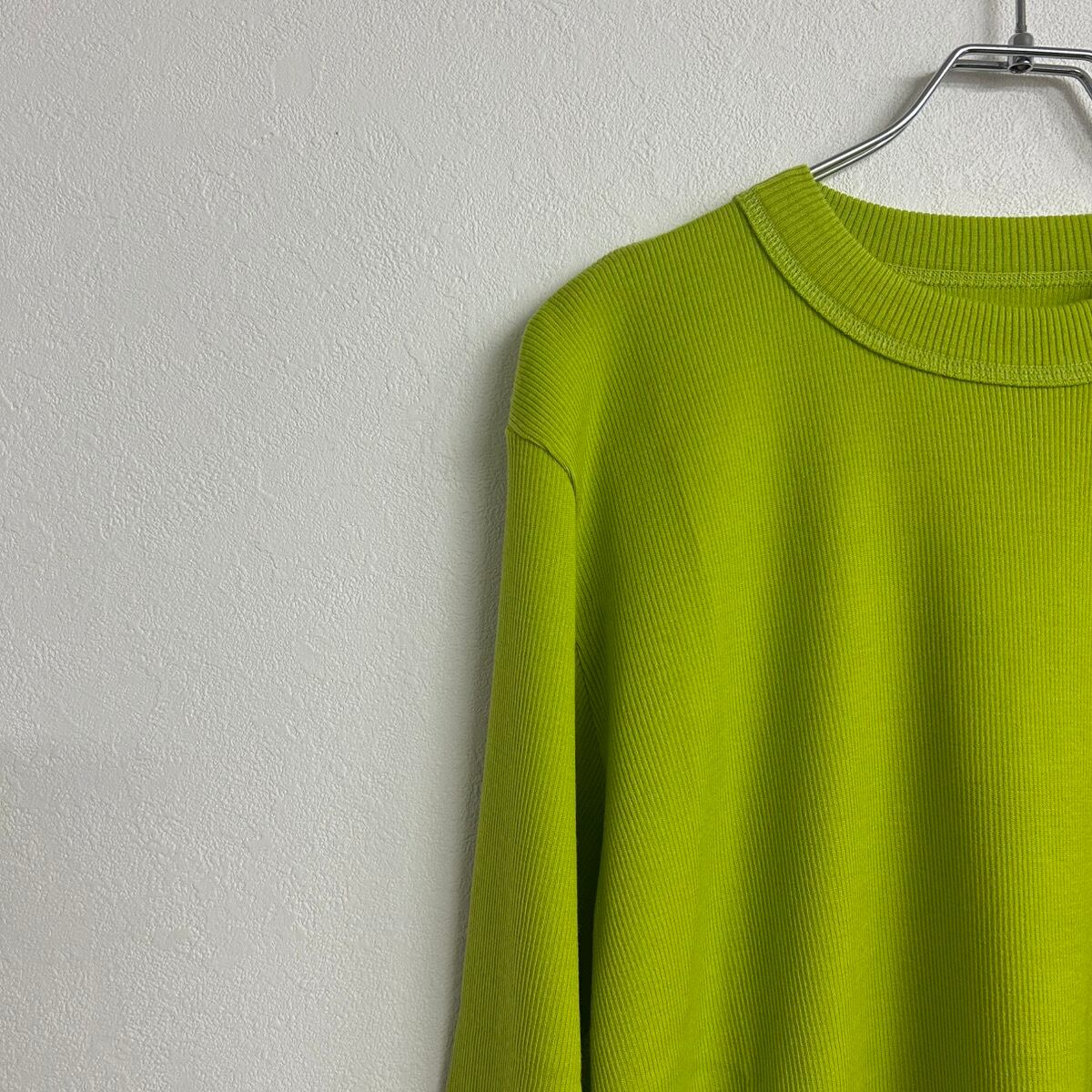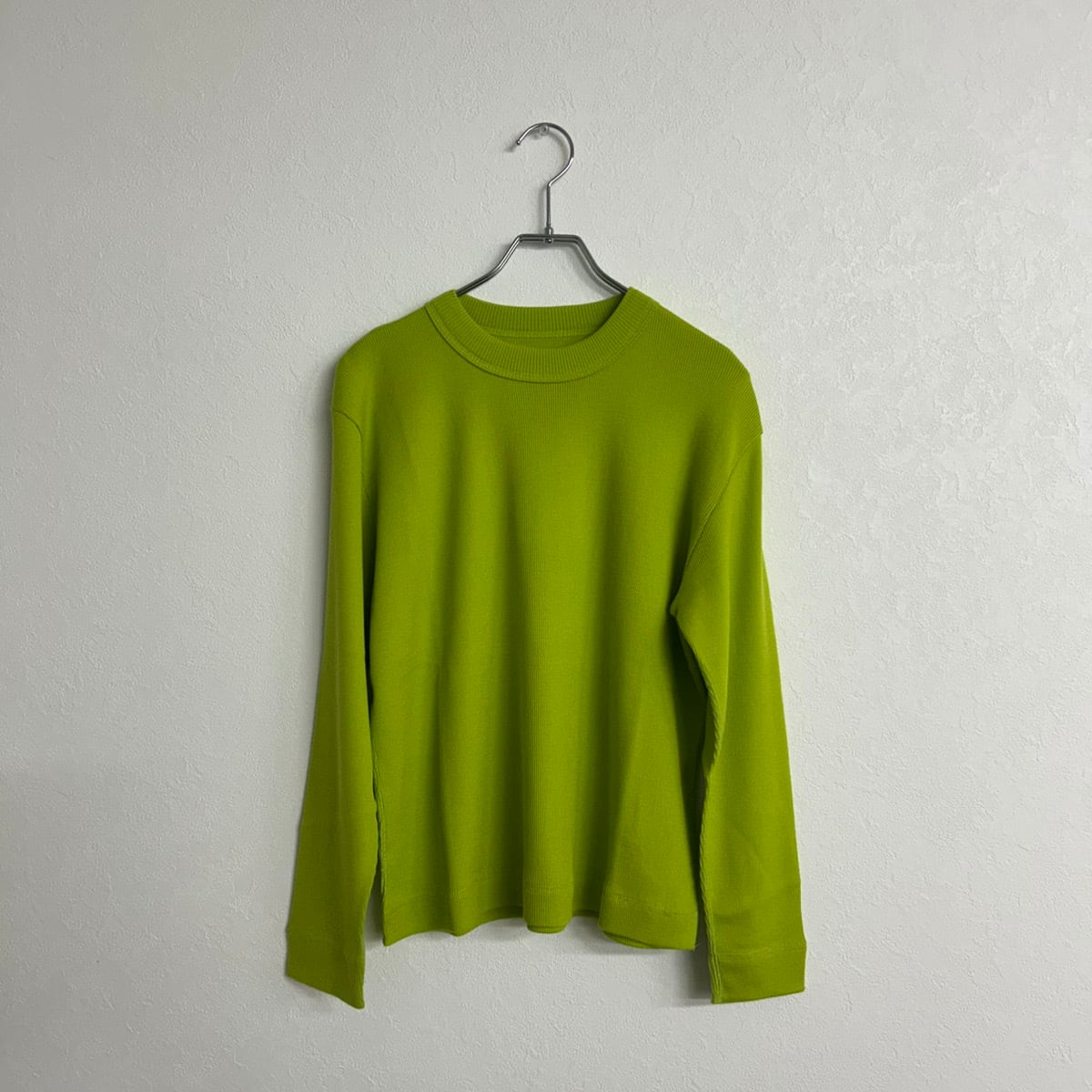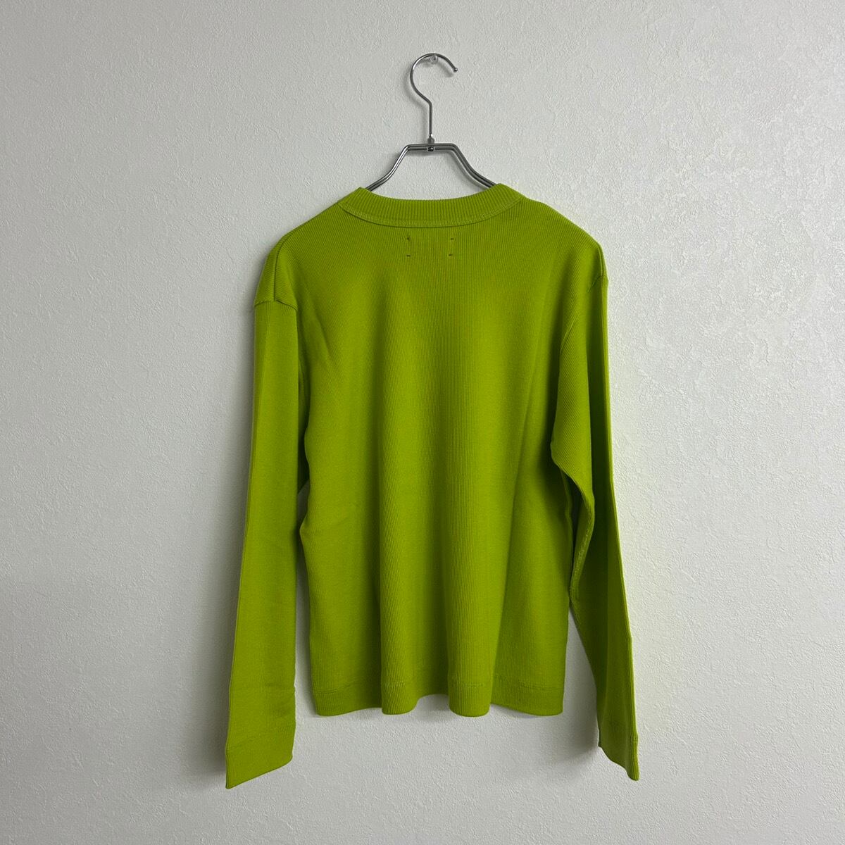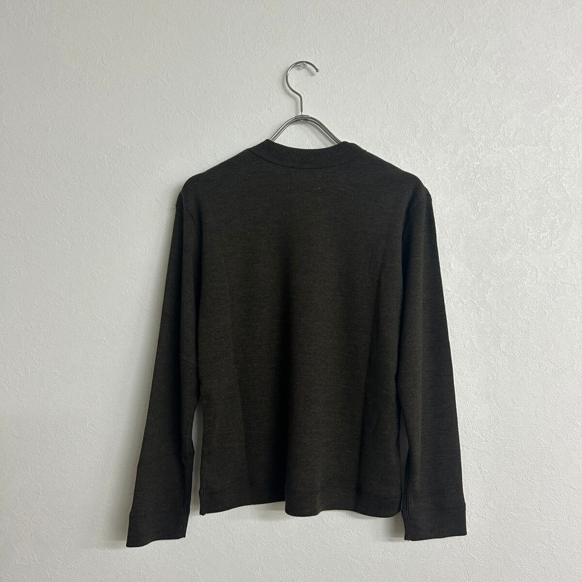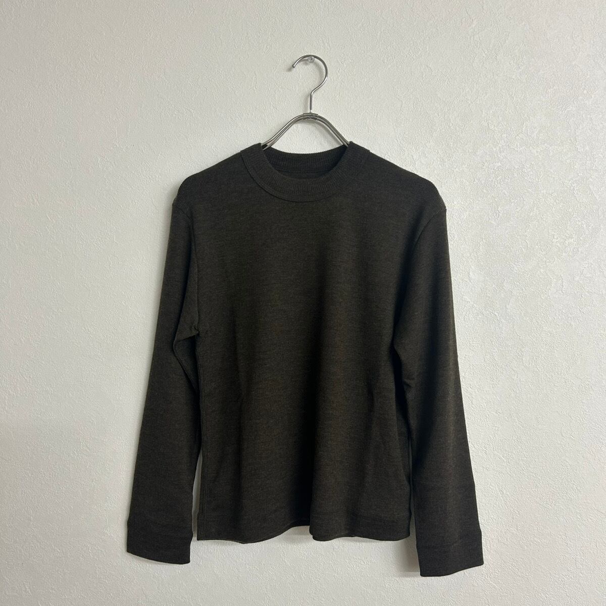 着丈短め、身幅広め、袖やや長めのバランスが取りやすい、MEYAME のトップスの特徴が詰まった一枚。とても細いウールの糸を使用しているため軽く、全くチクチクしない滑らかな肌触り、もちろん暖かさもバッチリなMEYAME オリジナルの素材です。少し細かい話ですが、ウール100%でもニットではなく、ウール100%の生地を使っているのでミシンで縫うことができます。そのためにこのクリーンな印象が出せます。色々言いましたがとてもオススメです。