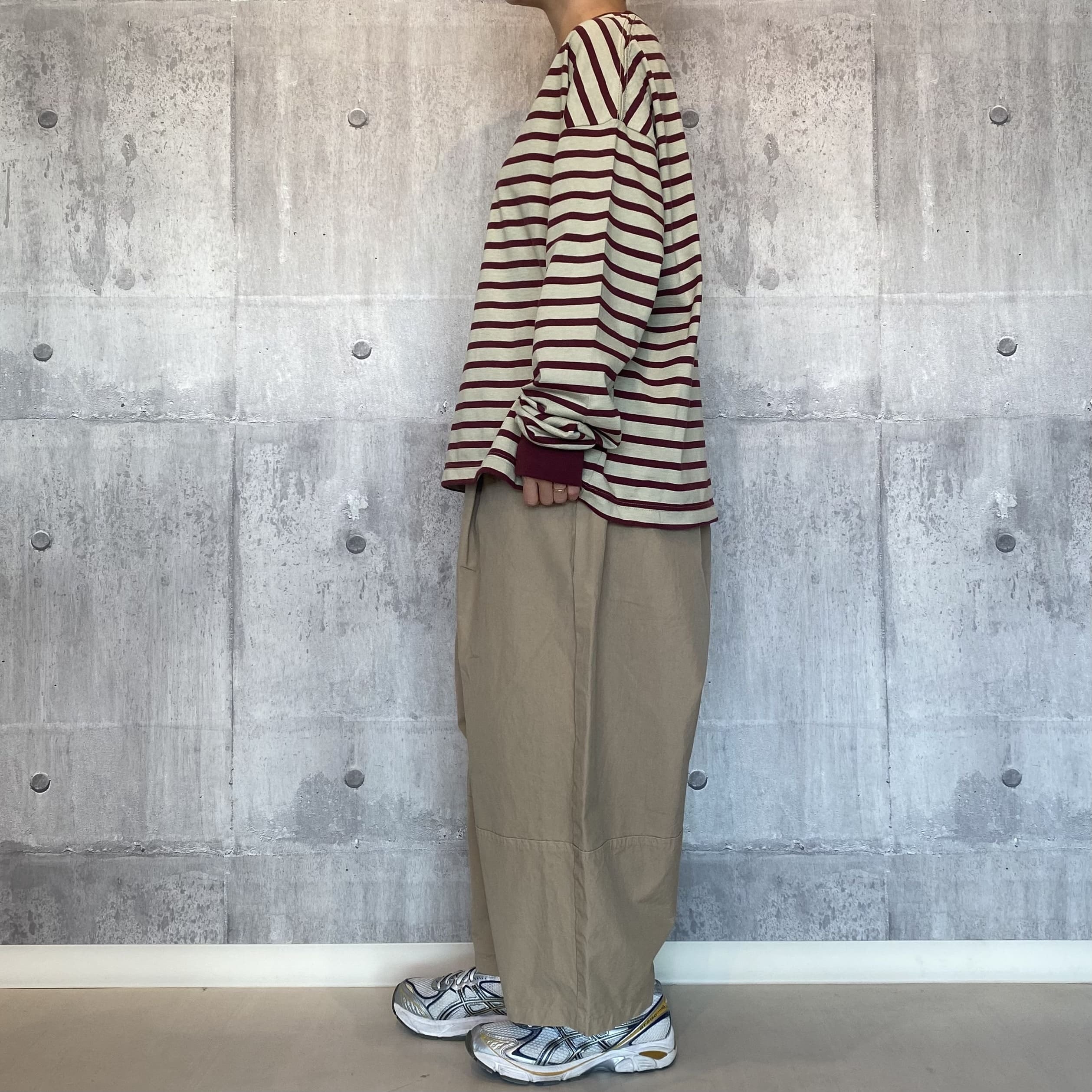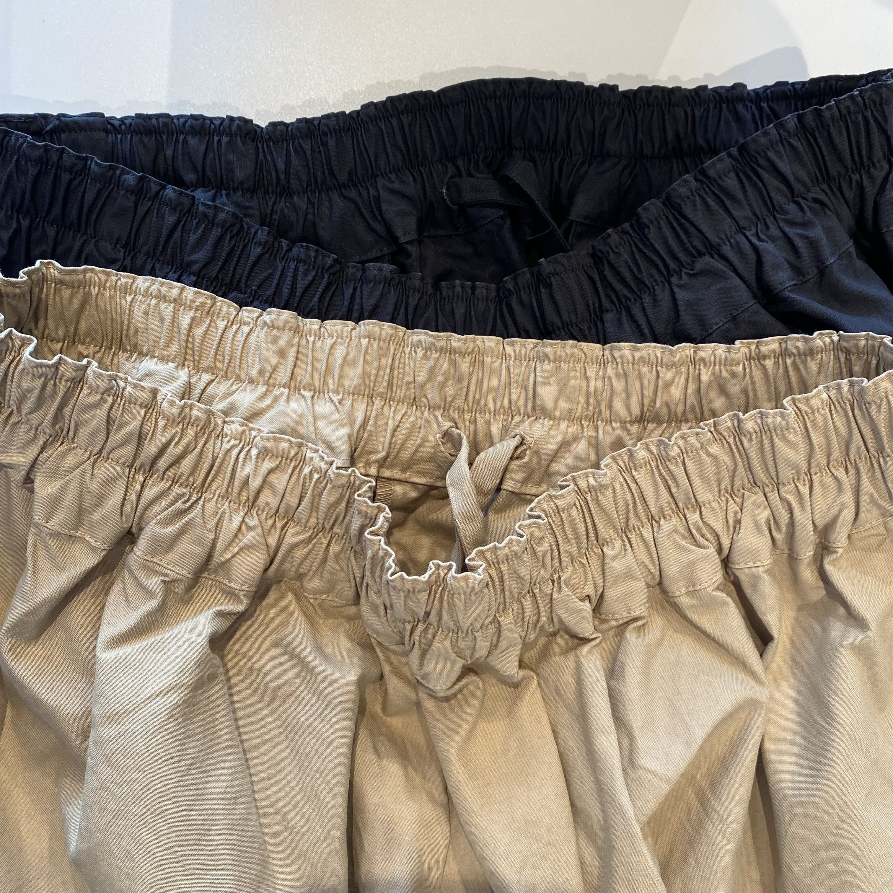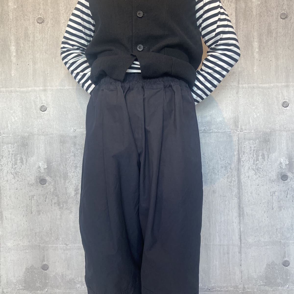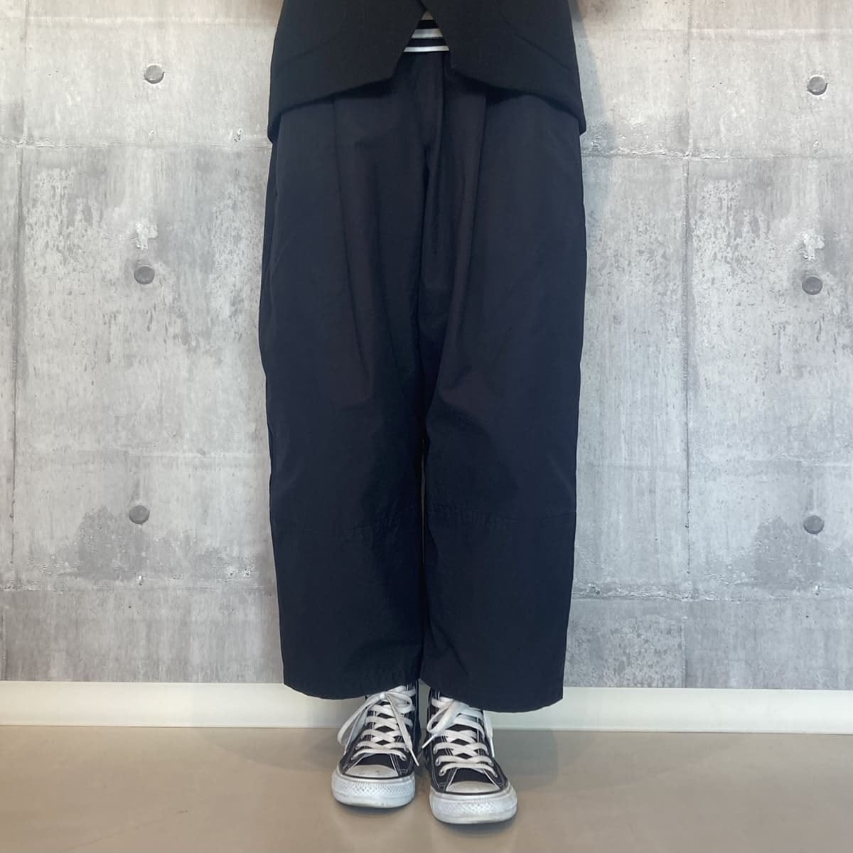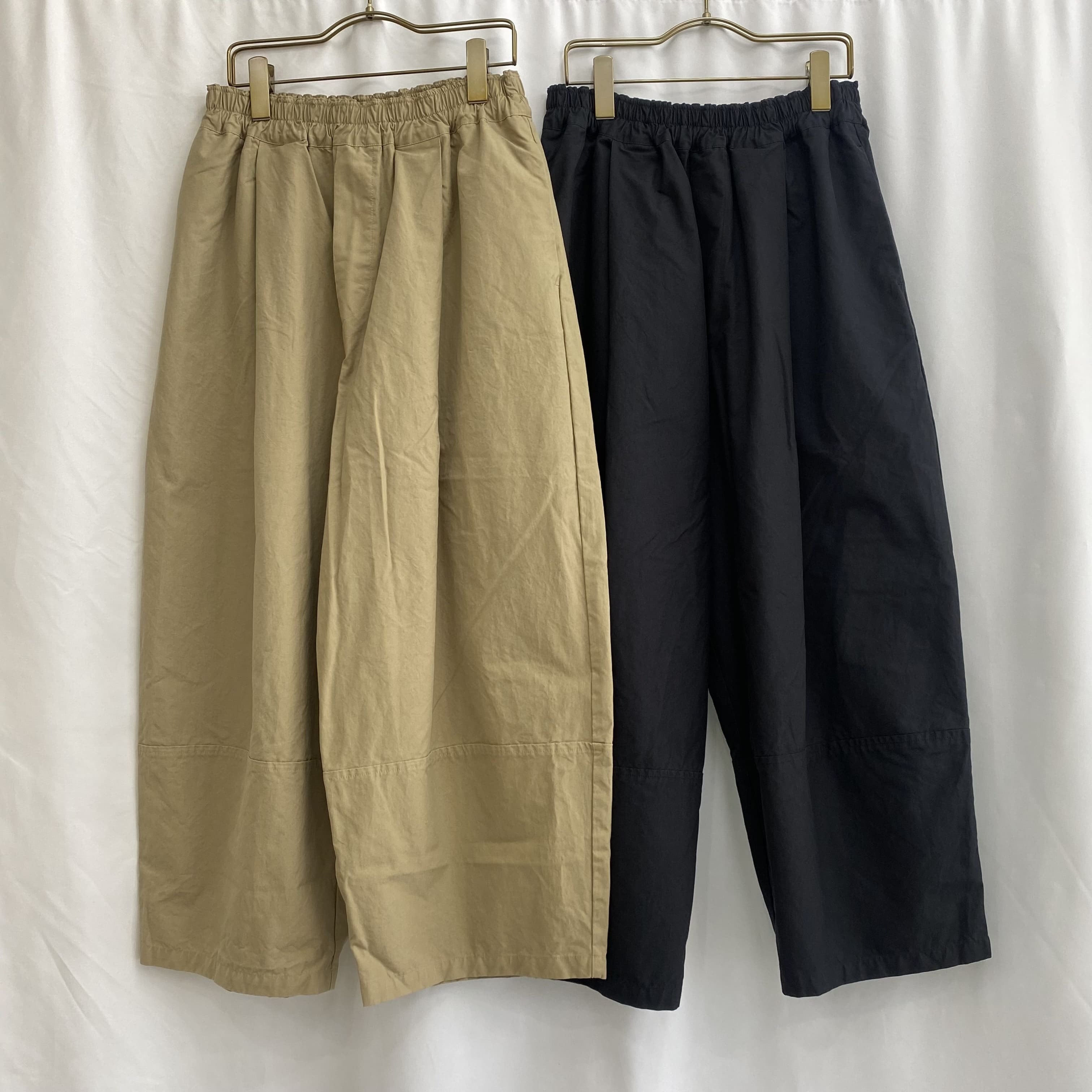 裾部分を切り替えた丸みのあるコクーンシルエットが特徴的なパンツです。フロントにタックを配し、腰回りにゆとりをもたせたリラックスフィット。ウエストはゴムと紐のイージー仕様です。