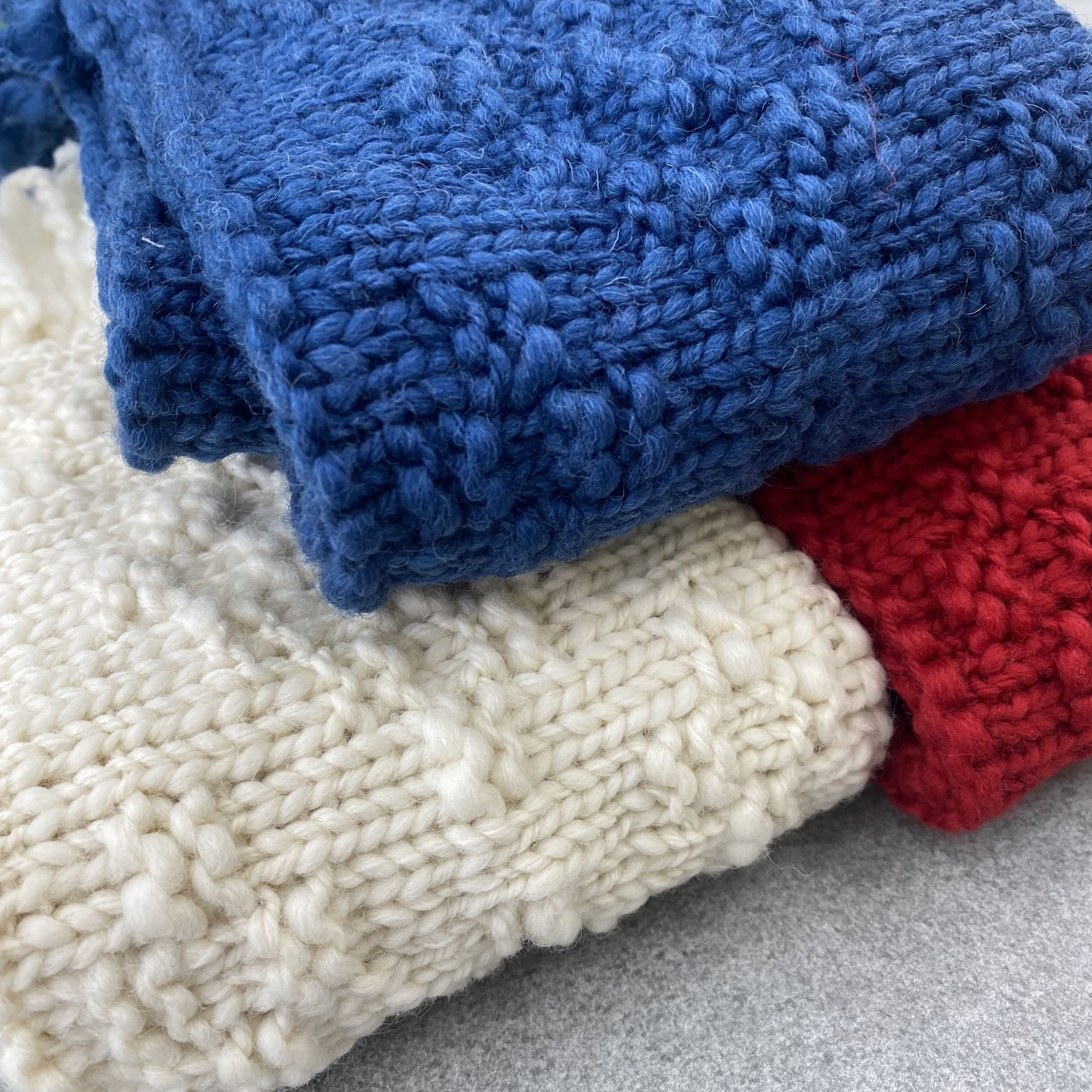 スラブ感のある太いウール糸を、ざっくりとした手編みのような風合いに編みたてたミニマフラーです。凹凸の編み柄が可愛い印象で、両端のボリューム感のあるループがポイント!