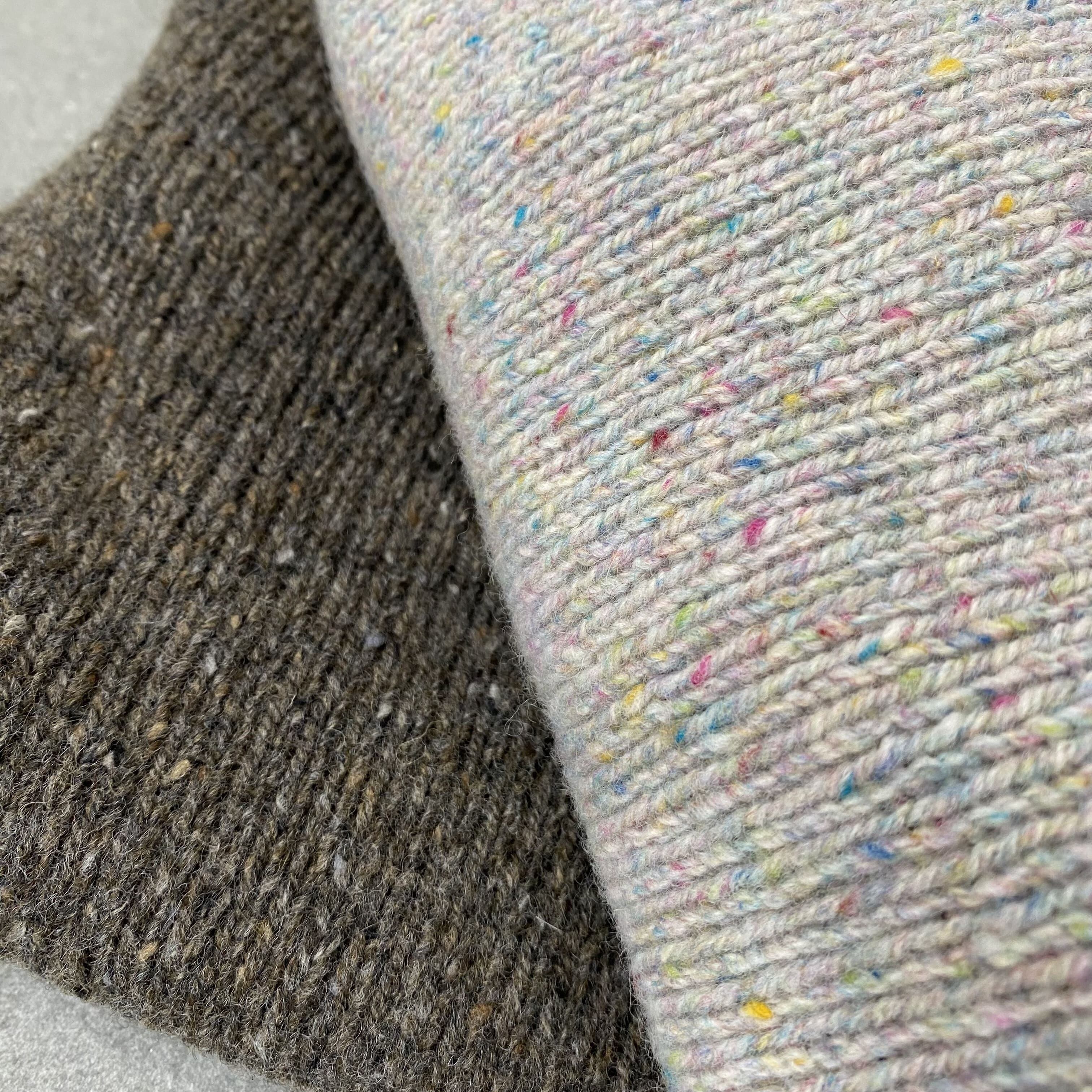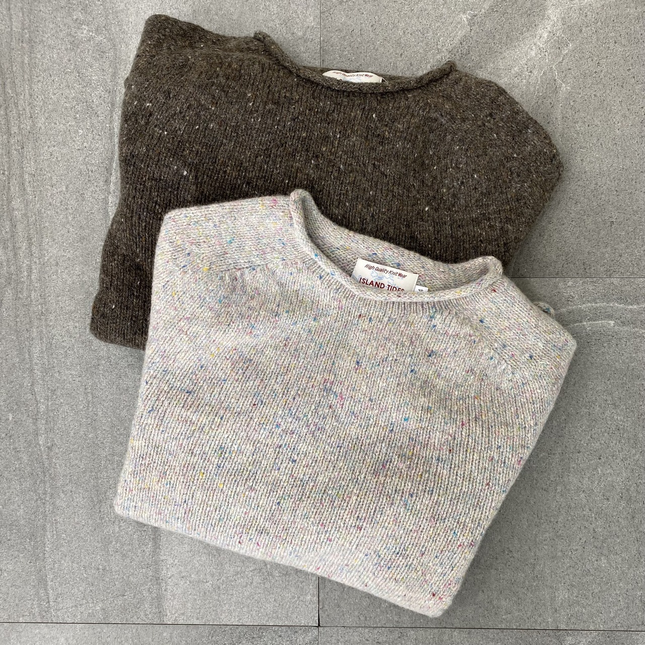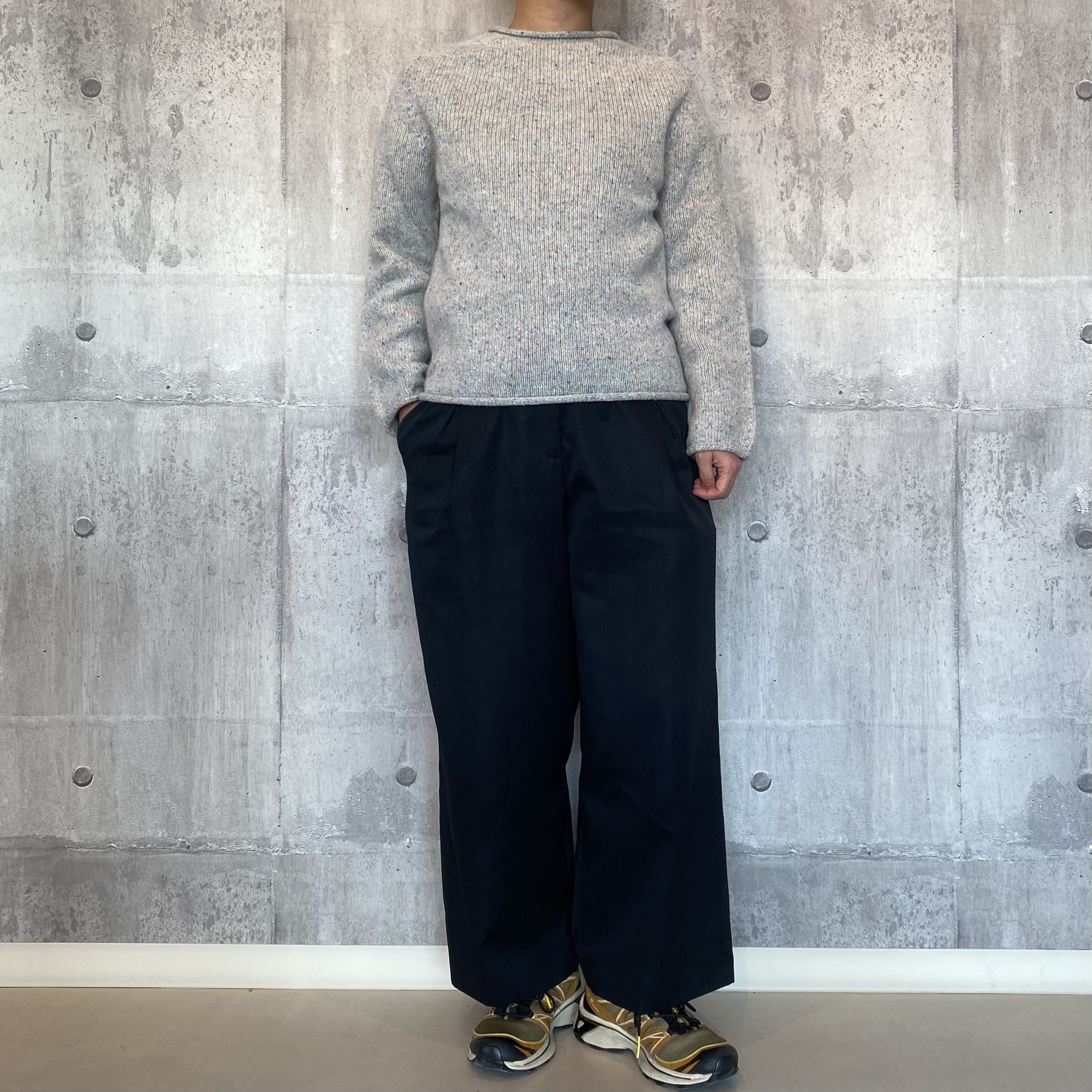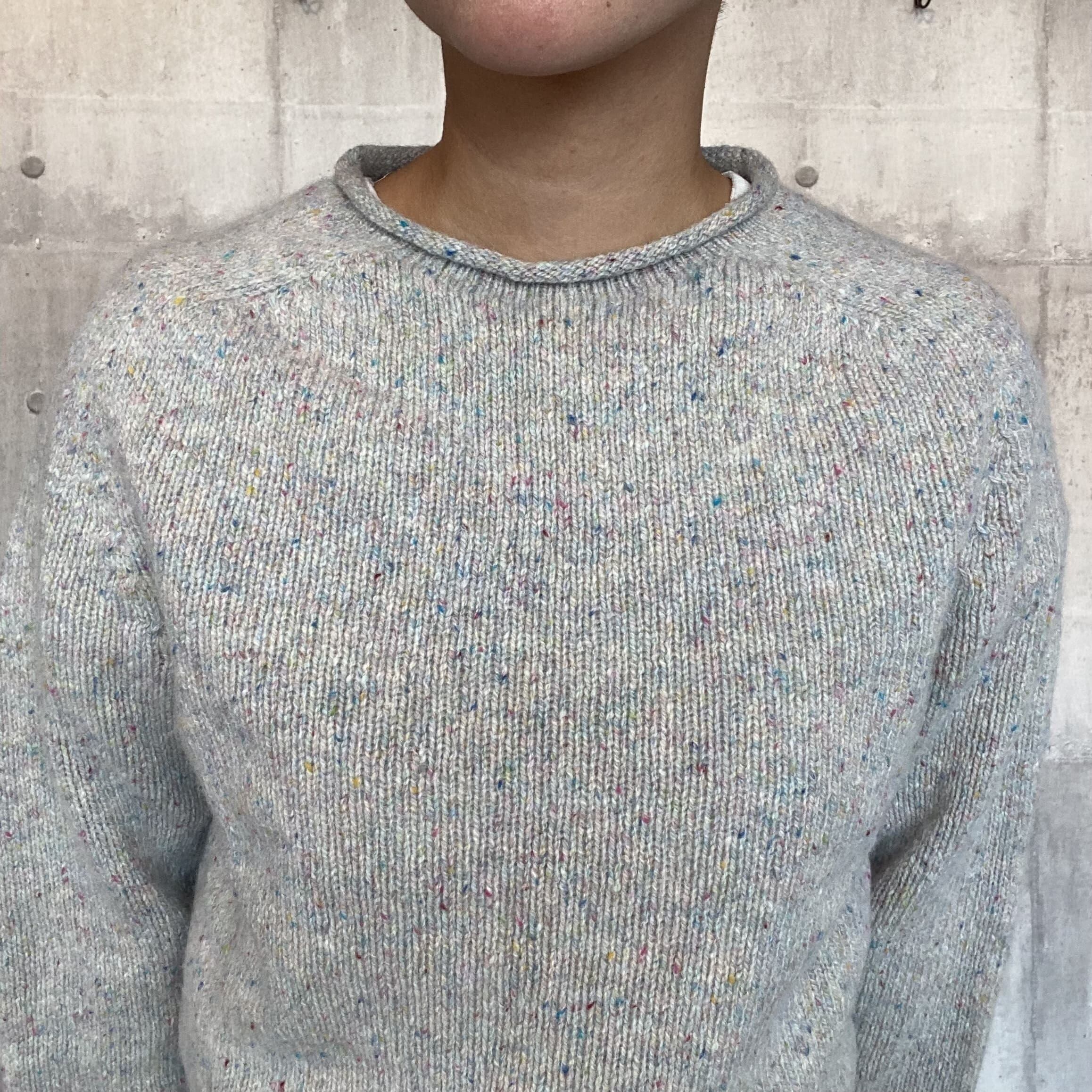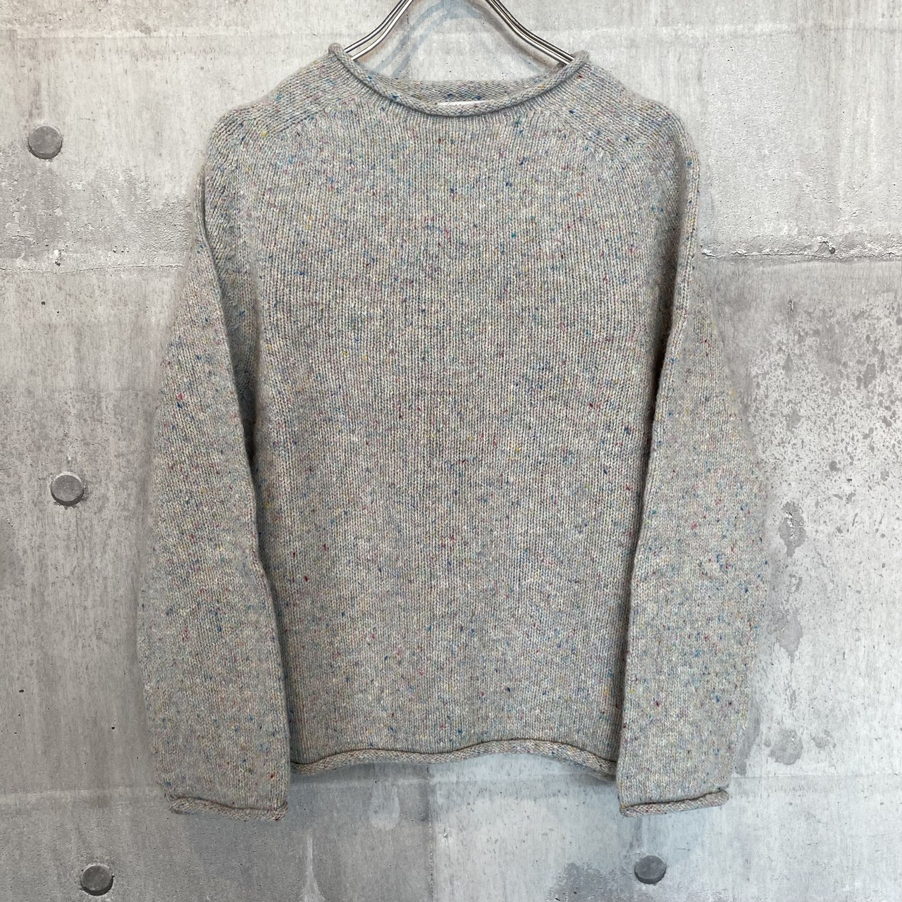 自然なミックスカラーのネップニットで適度な首の開きと、首元、袖口のロールがポイントです。