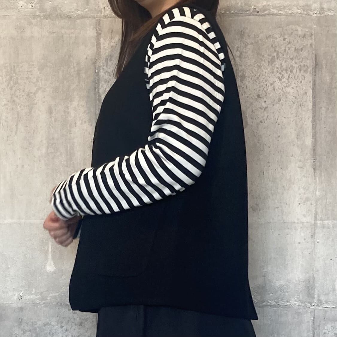 シャツやカットソーと合わせたり、ワンピースの上に羽織ったり、幅広く着回しの利く定番な1枚です。