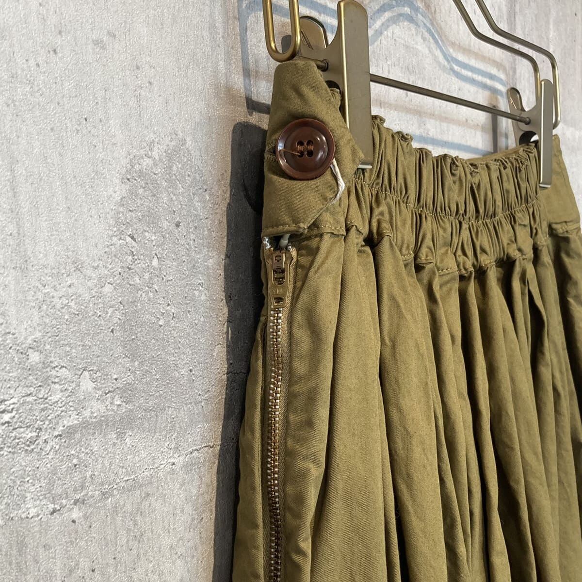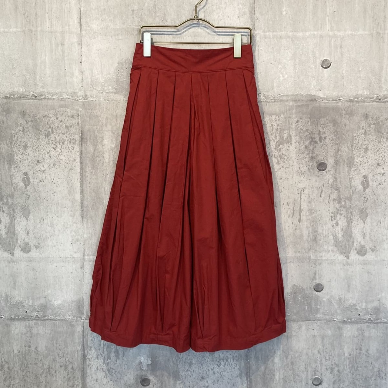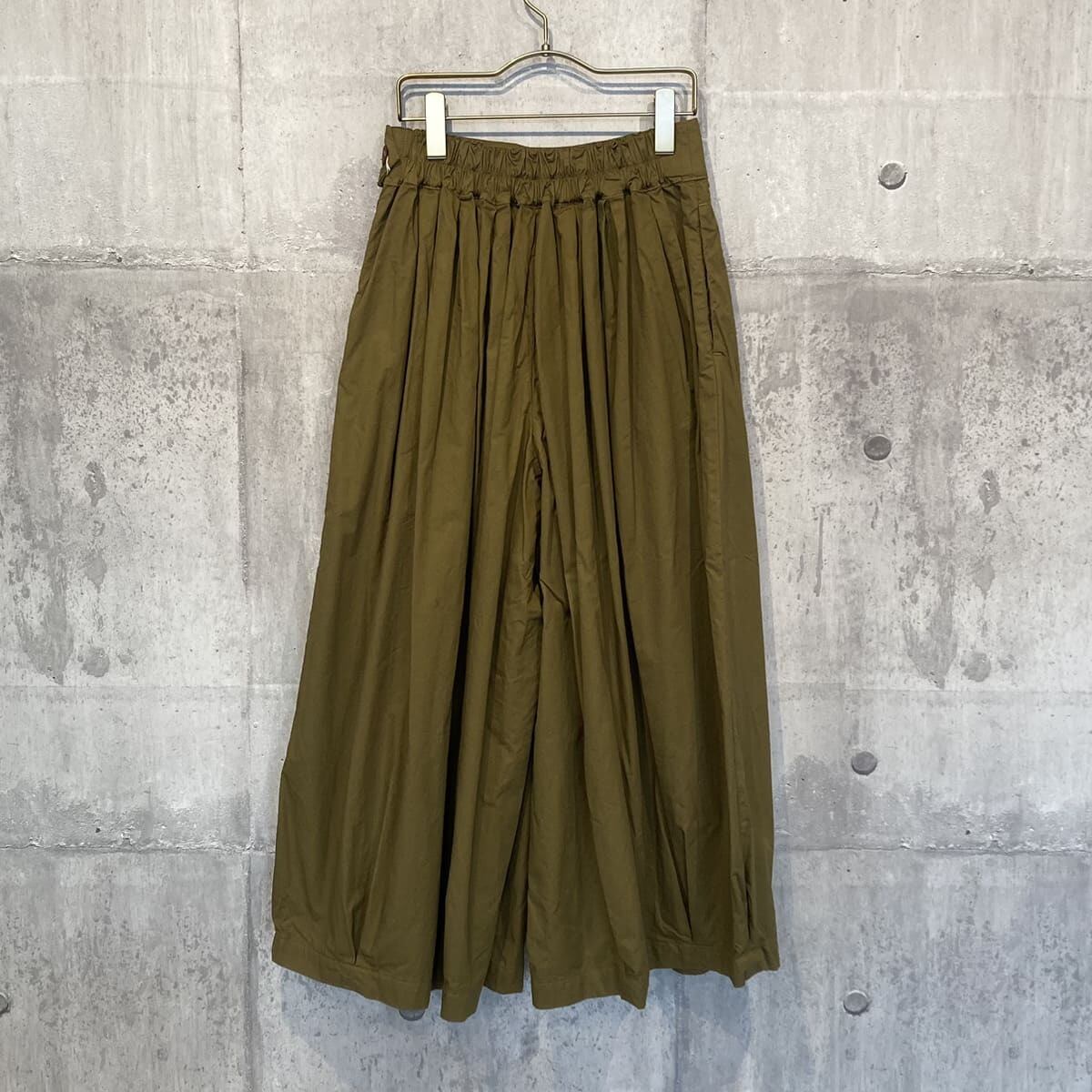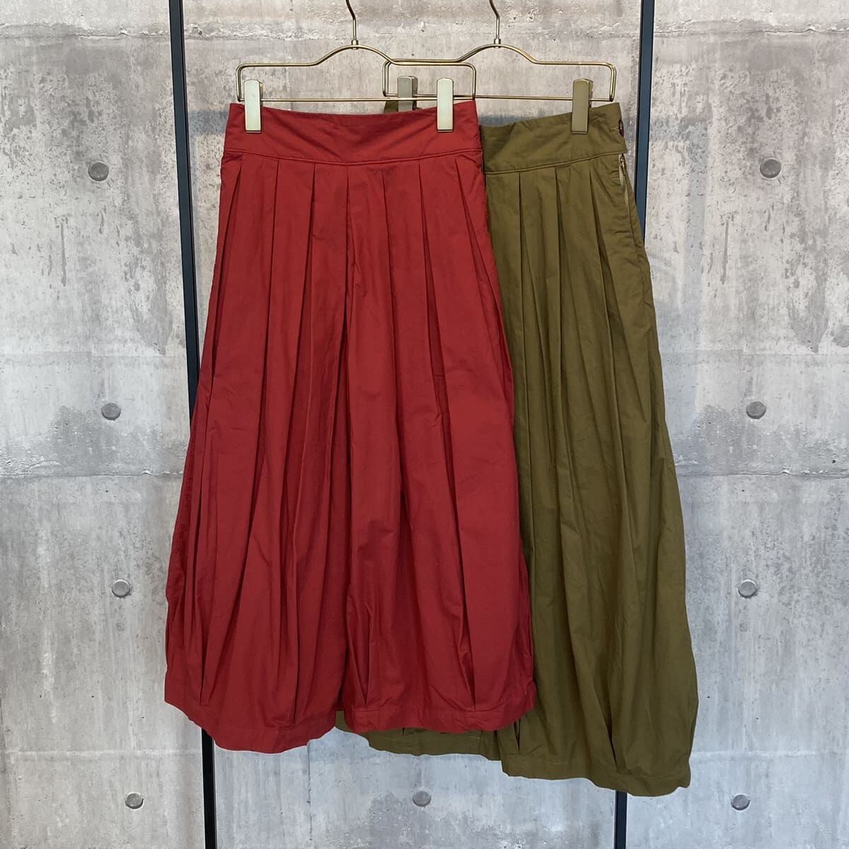 張りのあるツイル素材で、ウエストとスソのボックスプリーツがきれいなボリューム感を出しています。