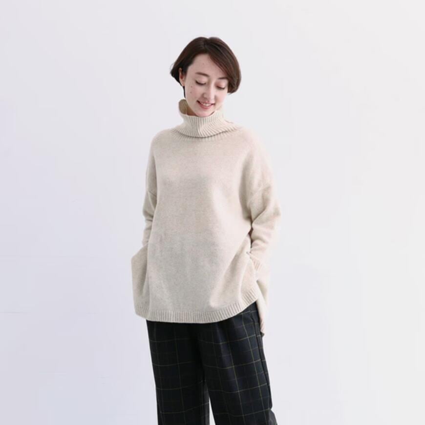 サイドにスリットを配置し、ビックシルエットでもすっきりとコーディネートができるデザインです。たっぷりと身幅をとることで、ドレープ性のある綺麗なシルエットに。ウール素材で暖かく、さらっとしたストレスフリーな着心地です。そのまま伸ばしてくしゃっとしたり、折っても使えるタートルネックです。着丈の前後差とサイドスリットで動きが出て、さりげなくヒップまわりをカバーしてくれます。
