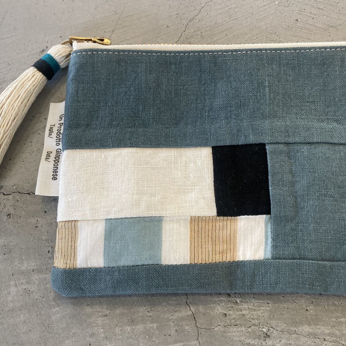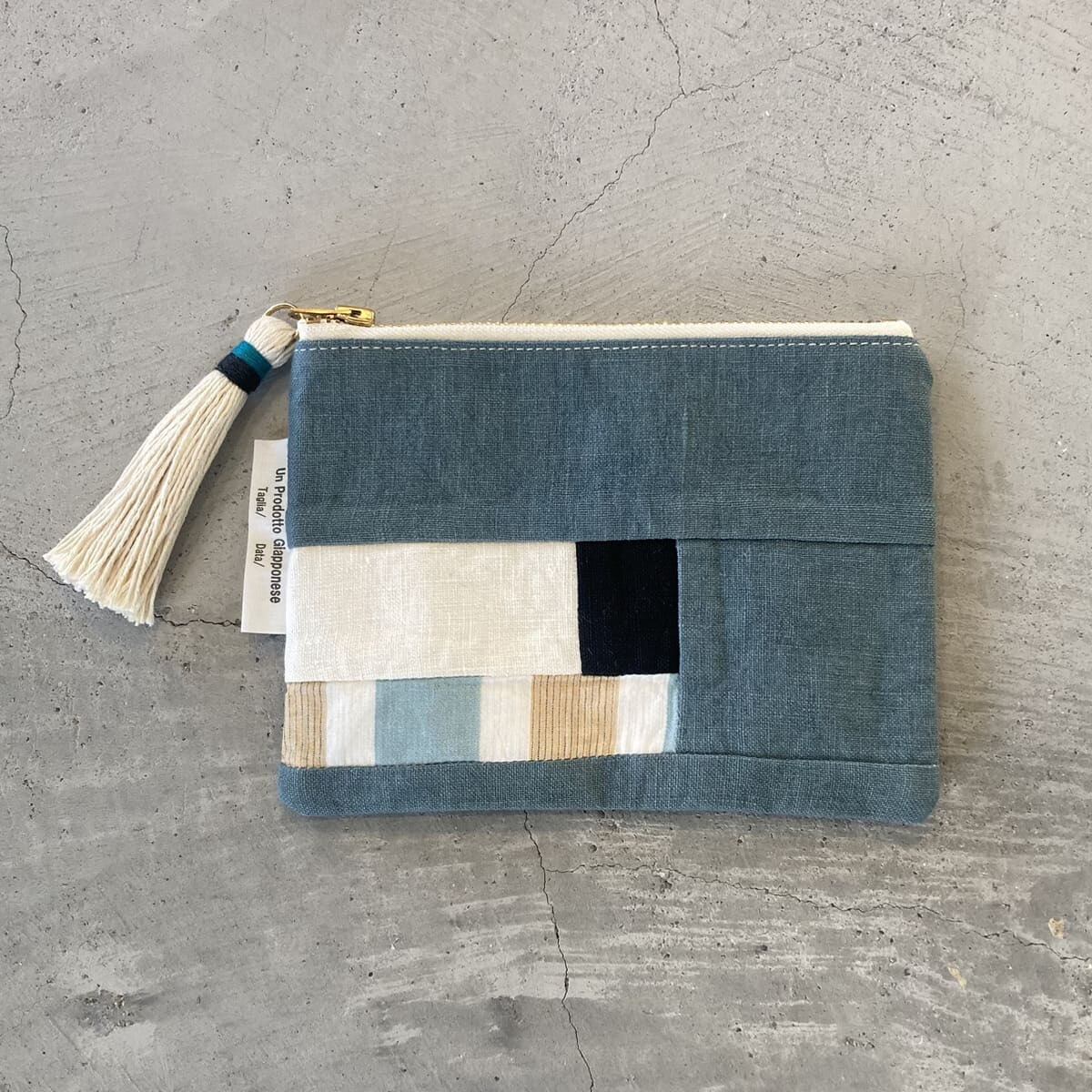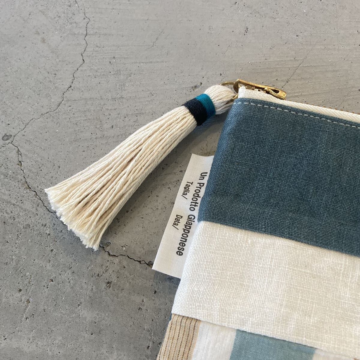 きれいな色目のリネンキャンバスとインドストライプ生地を切り替えて作成した定番型のポーチ(S)。持っているだけで楽しい雰囲気の人気シリーズです。地場の帆布残糸を使用して手作りした引き手のタッセルも目を引くポイントです。