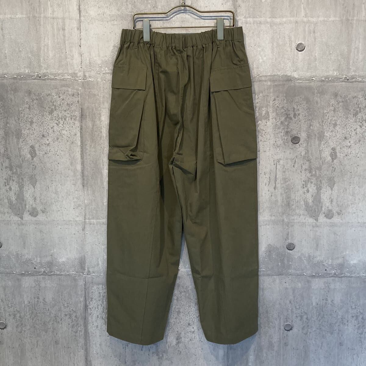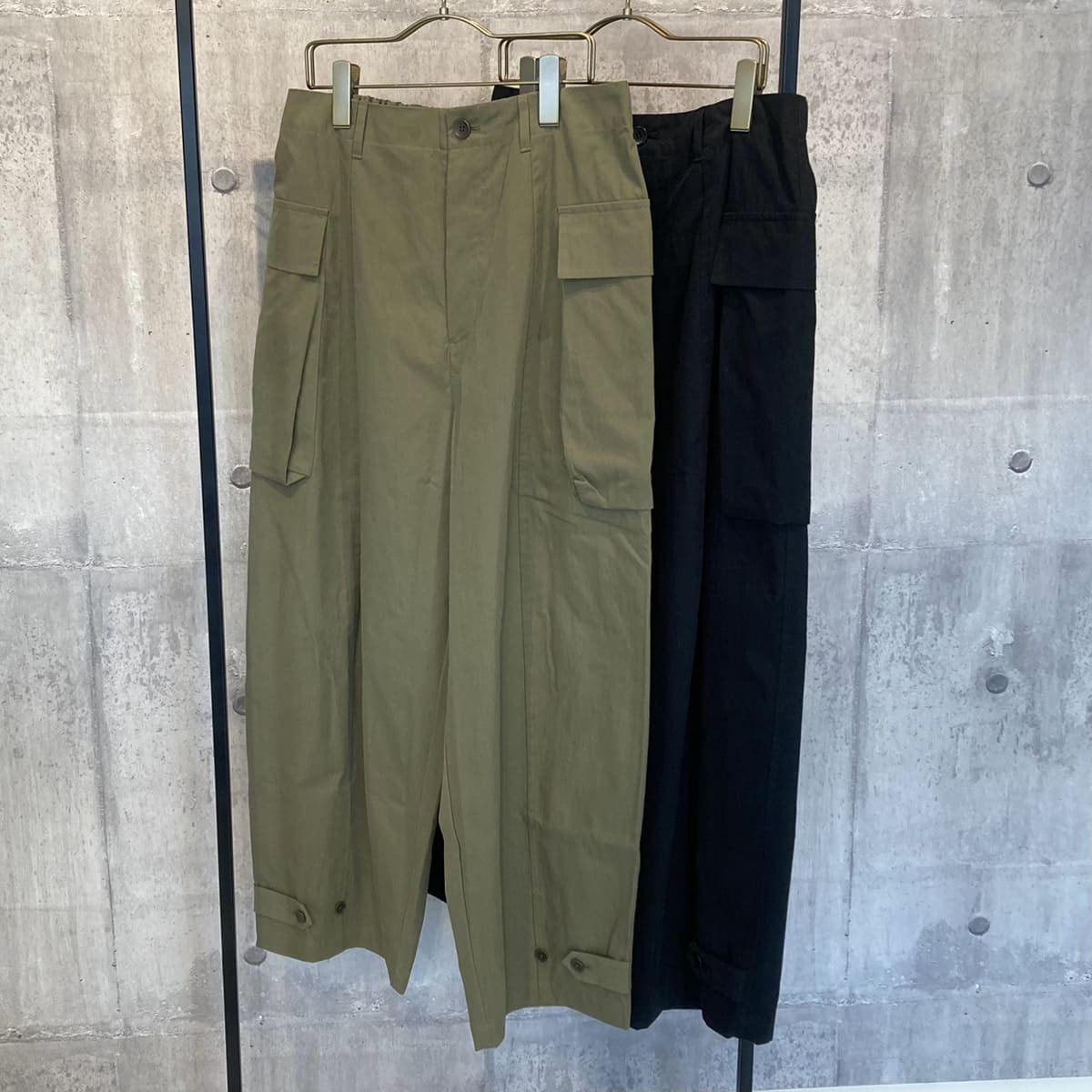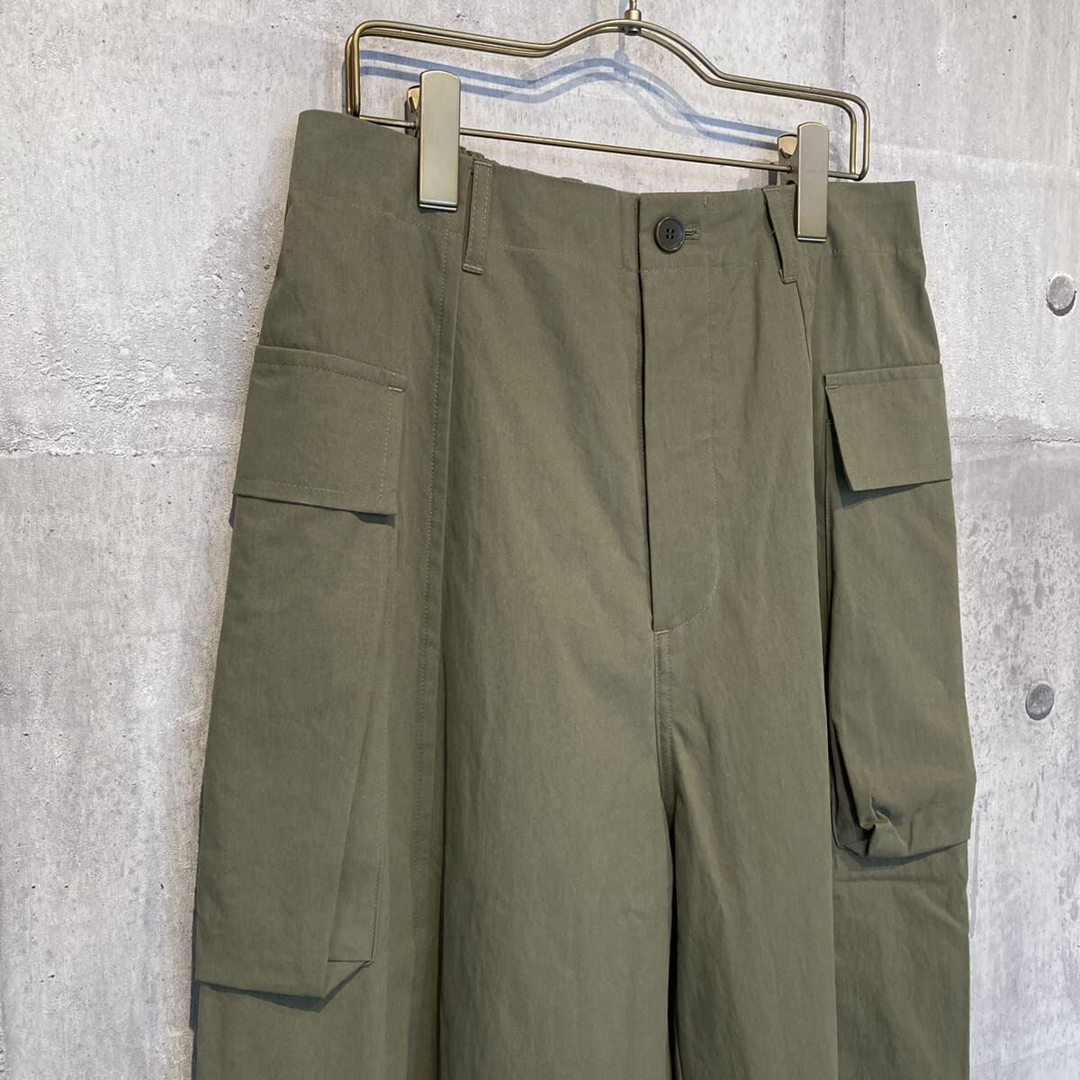 上品な生地の風合いをカジュアルなデザインに落とし込んだカーゴパンツ。中心を切り替えることで丸みを持たせたワイドシルエットです。裾にはタブが付いており、ボタンを留める位置によって絞ることが可能になっています。ウエストは後ろのみにゴムを通したイージー仕様。
