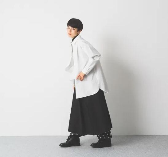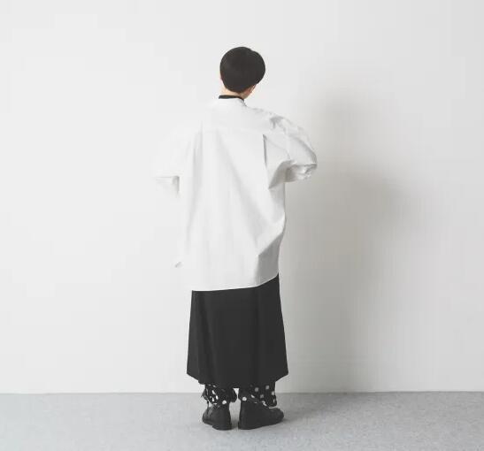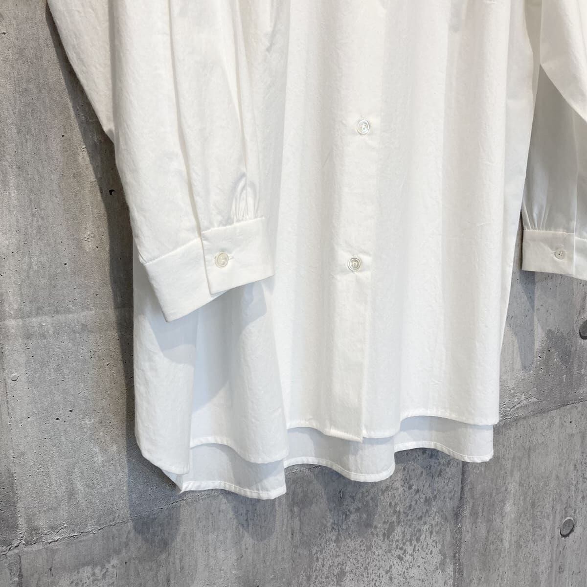 染色前に生地を繰り返し揉み込み、洗い晒しのシワ感とソフトで膨らみが特徴の滋賀県近江産地の「近江晒し」という染色技法を施した生地を使用したオーバーサイズのシャツです。前後ヨークの左右に入れた深めのタックと前後差をつけた丸みのあるヘムラインがポイントで、裾に向かって緩やかに広がるシルエットに仕上げました。ゆったりとした身頃と程よい厚みのある生地感で、羽織としても活躍する1着です。