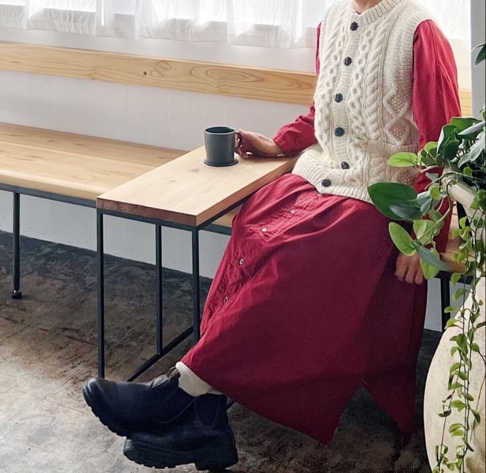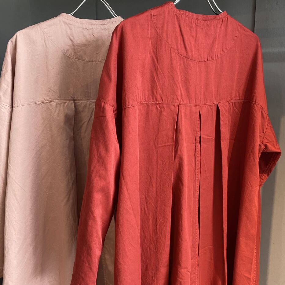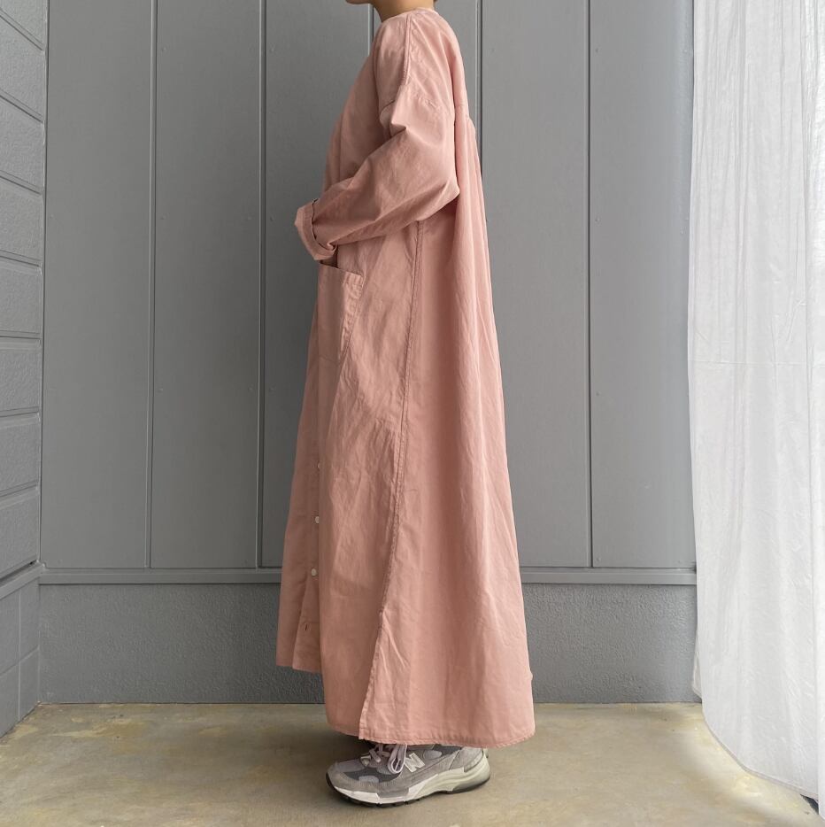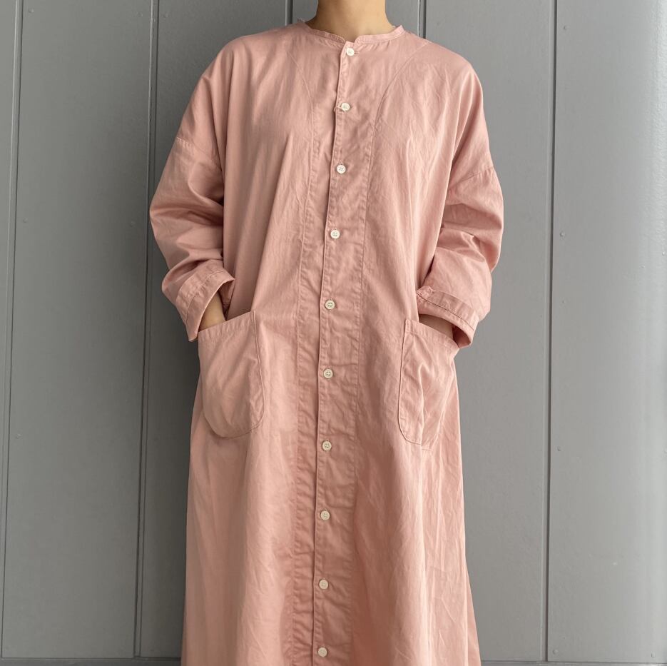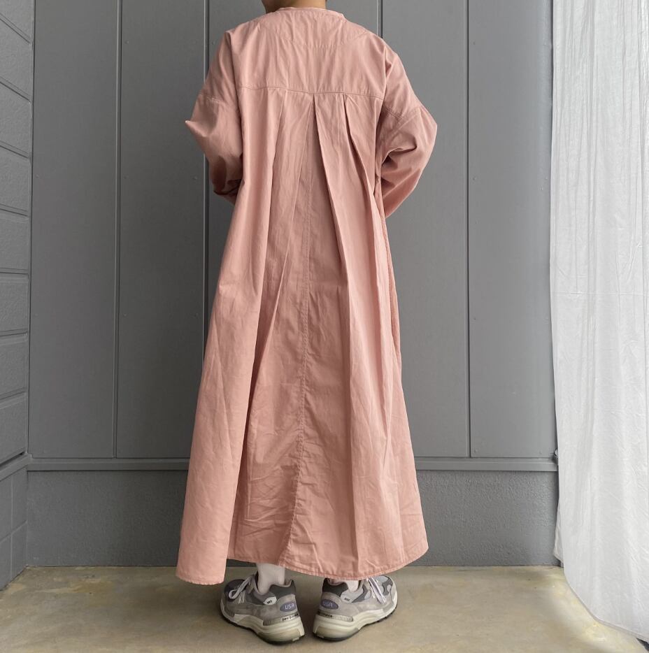 春夏や秋は1枚でサラッと着たり、羽織りで重ね着を楽しんだり、冬はインナー使いで上にニットやベストを重ねたりと、着回しをしっかり楽しめるワンピースです。小さな襟とゆったりロングなシルエットが特徴のアトリエローブ。