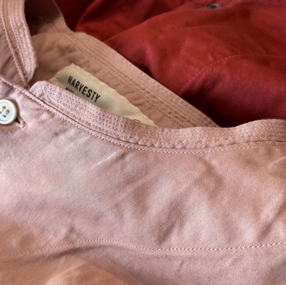 素材はサテンのシャツ生地で上品な光沢感があり、洗いざらしの風合いはアンティークの様な雰囲気を出しています。