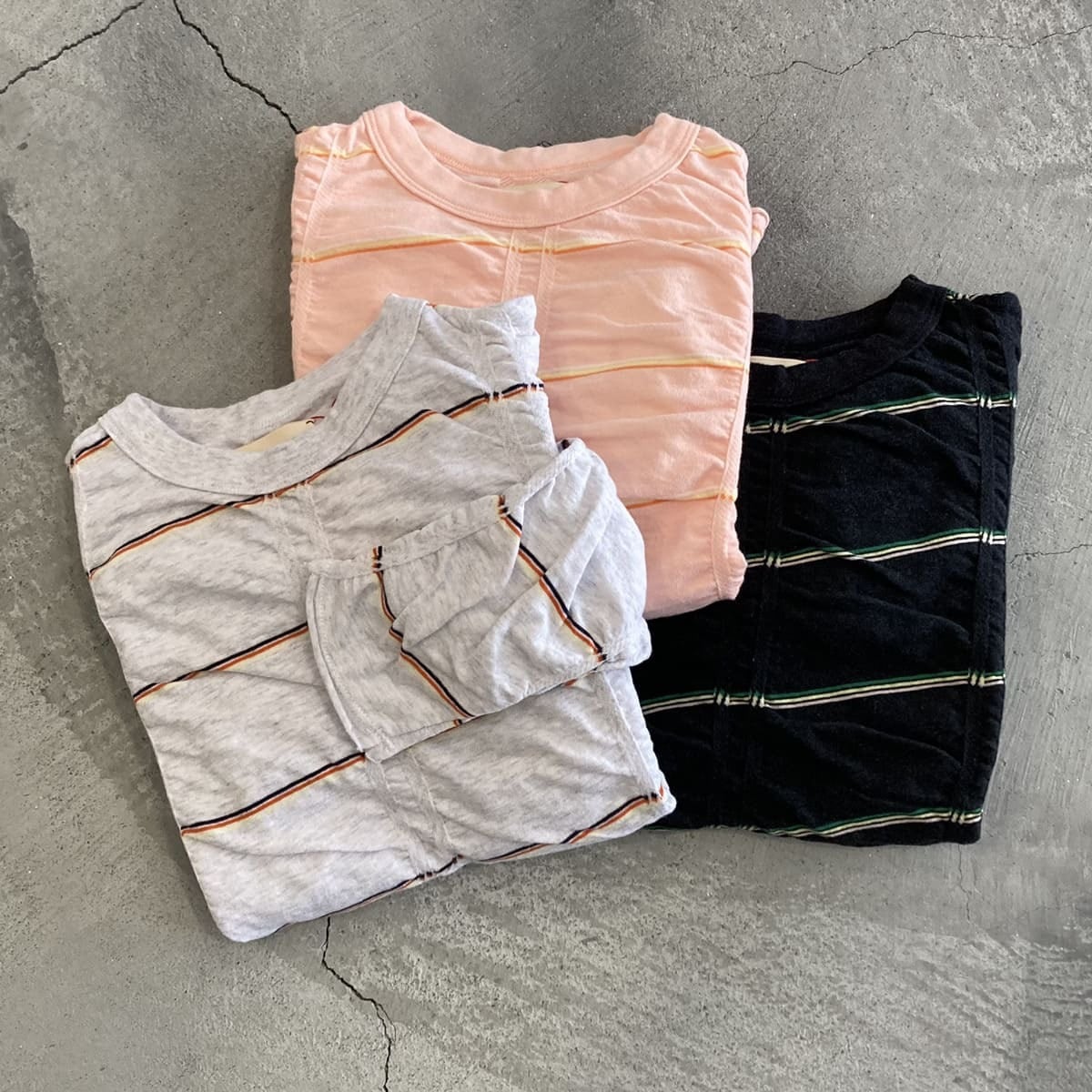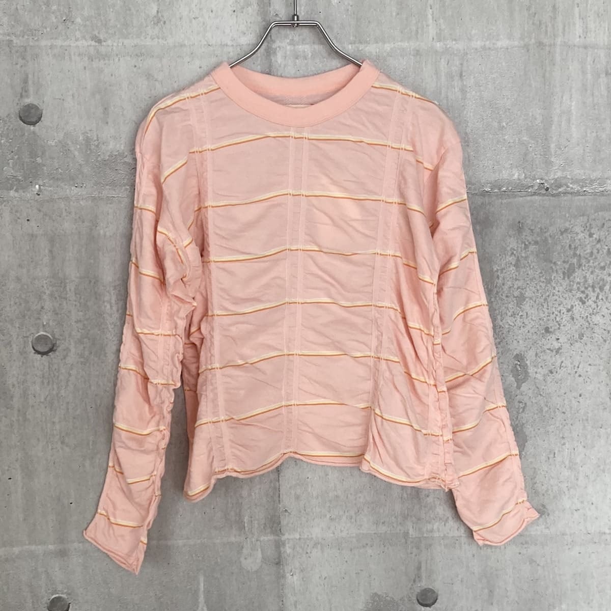 ボーダーが斜めになるように斜行させ、縦に入ったジャガード部分とそれ以外の部分の対比で独特のシワが出る仕様となっています。やや短めの丈とやや広い身幅でバランスが取りやすく、幅広いボトムスと合わせていただきやすいシルエットです。素材の持つ柔らかさを活かすために、裾と袖口を自然な流れでクルッとロールアップさせています。