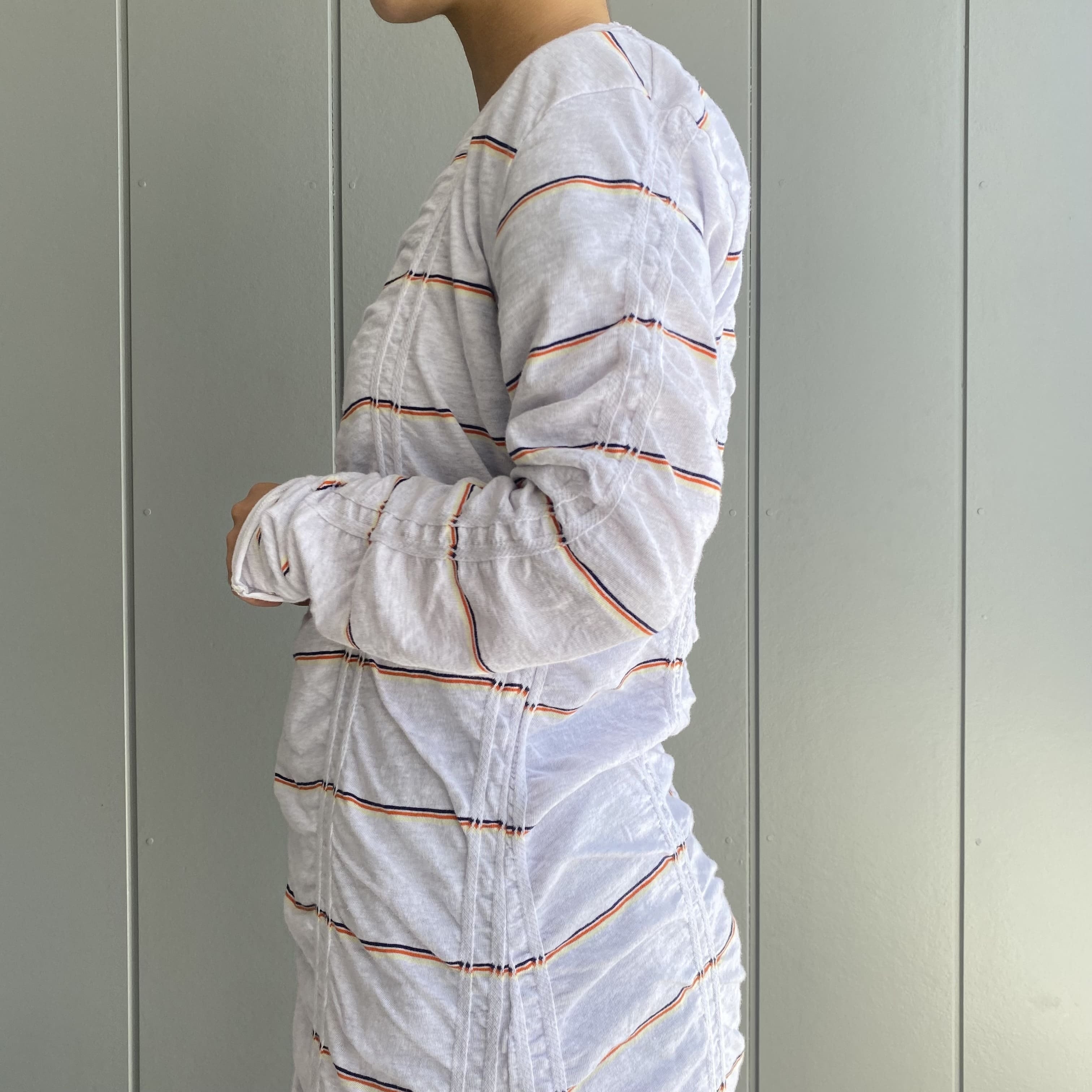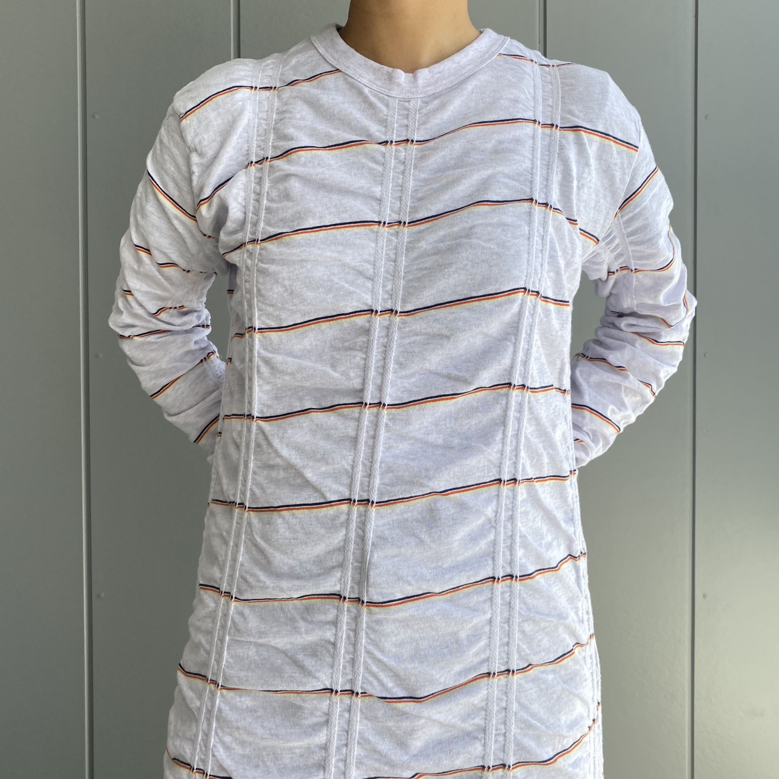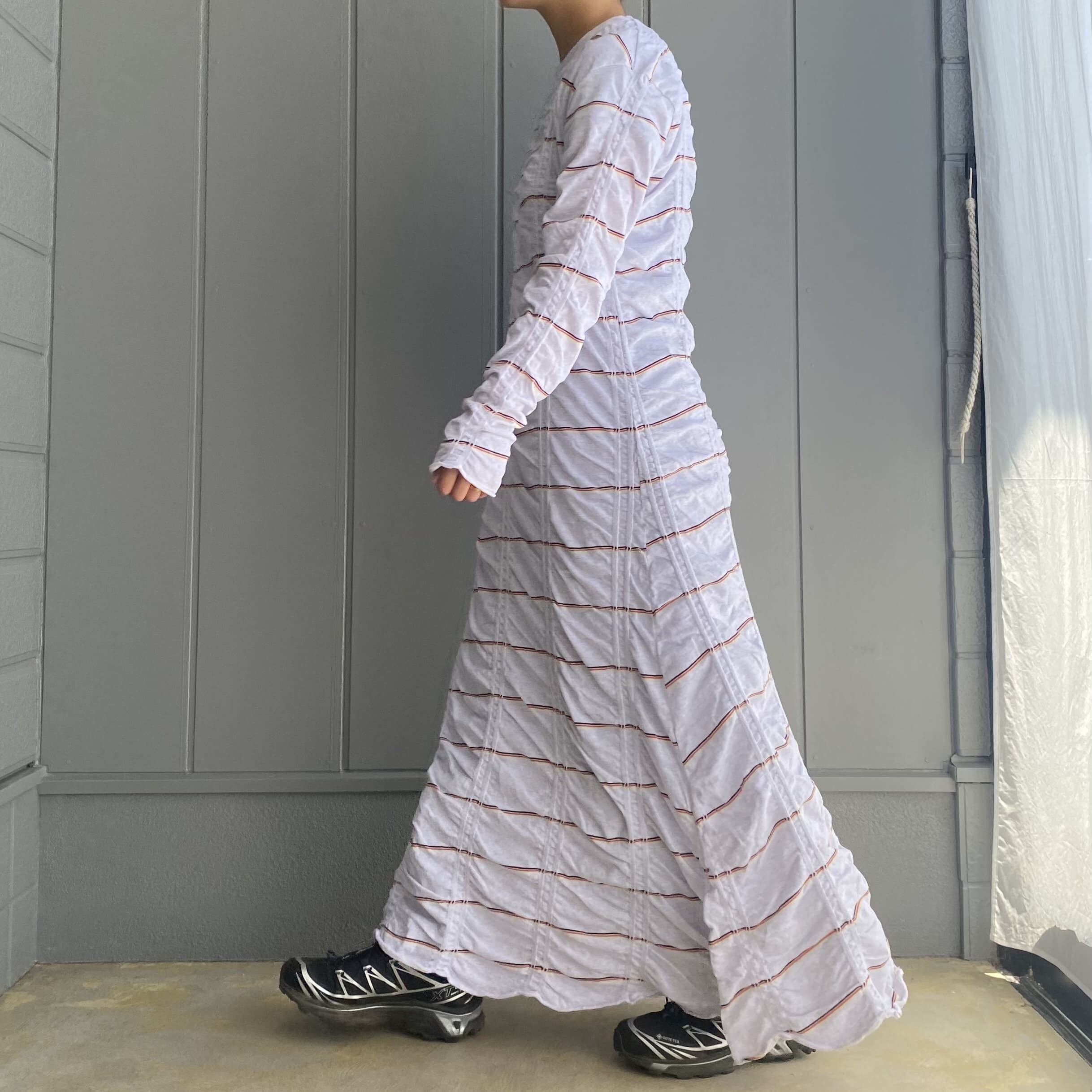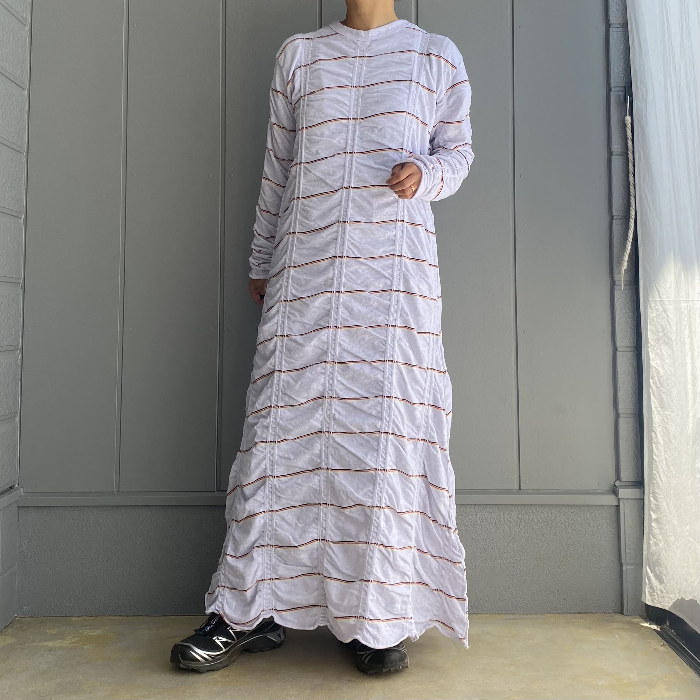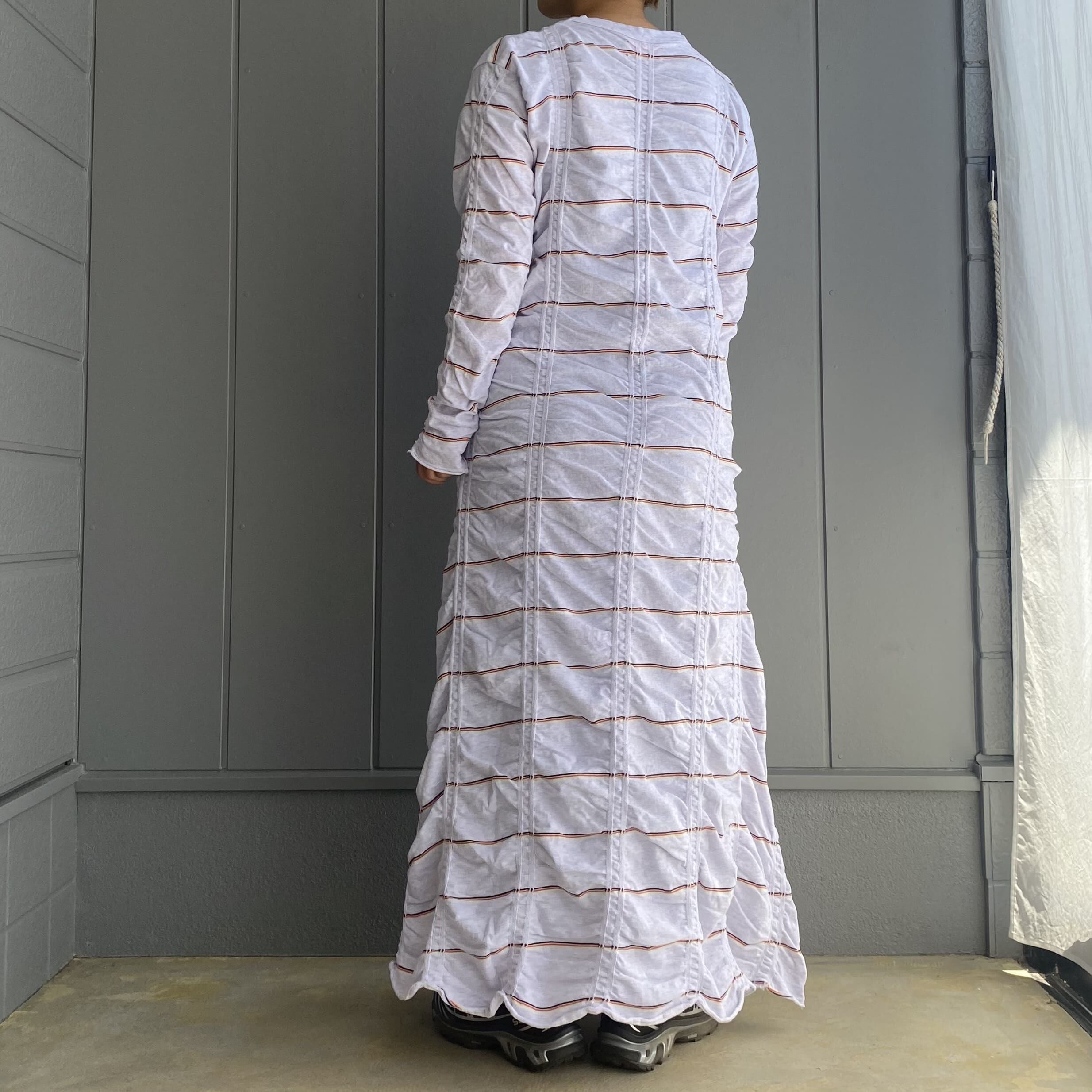 ボーダーが斜めになるように斜行させ、縦に入ったジャガード部分とそれ以外の部分の対比で独特のシワが出るのがポイント。1枚で着ても動きのあるデザインです。ゆるやかなAラインのシルエットでゆらゆらと揺れる裾がとても綺麗です。程よく伸縮性があり、着心地も快適◎素材の持つ柔らかさを活かすために、裾と袖口を自然な流れでクルッとロールアップさせています。自宅で洗濯可能。