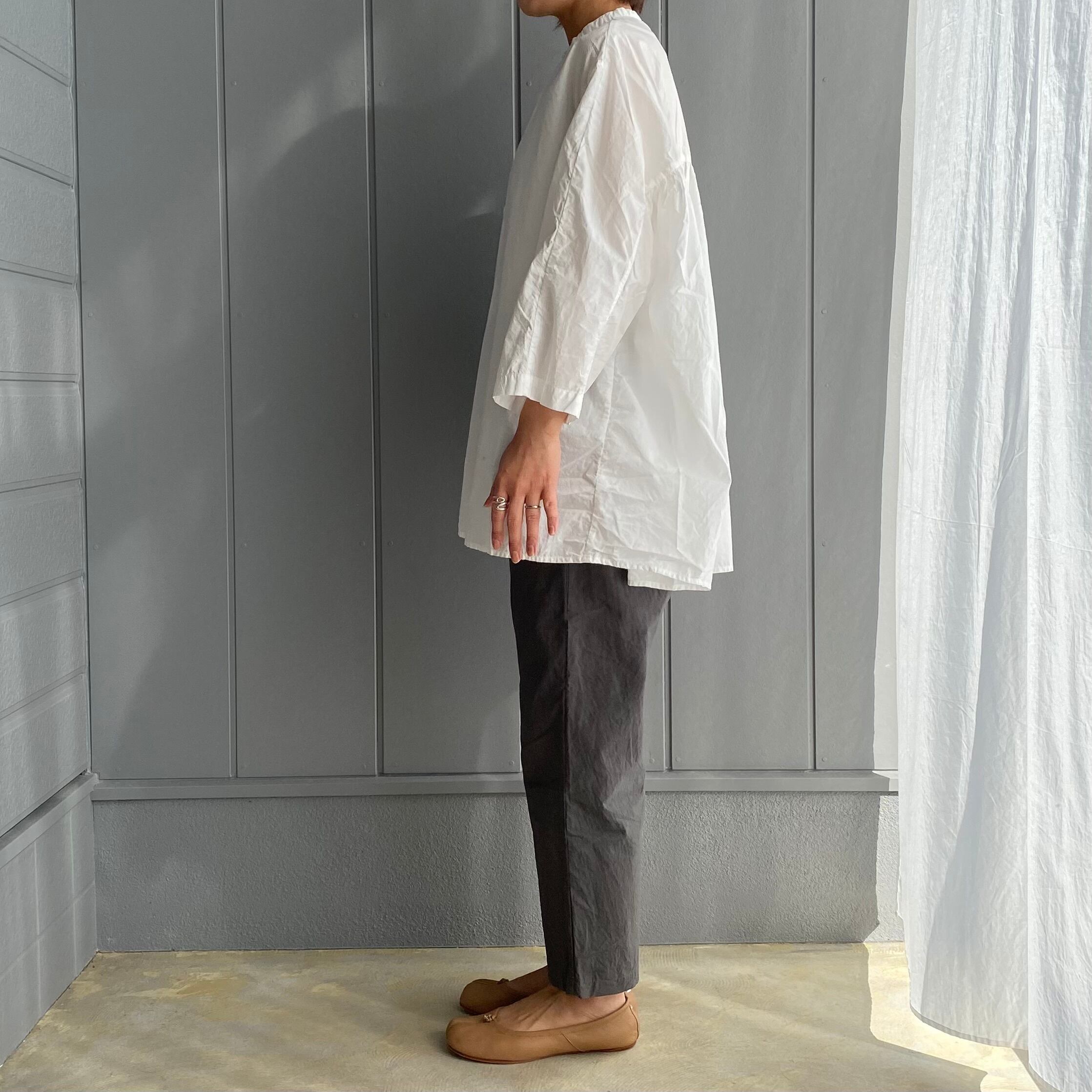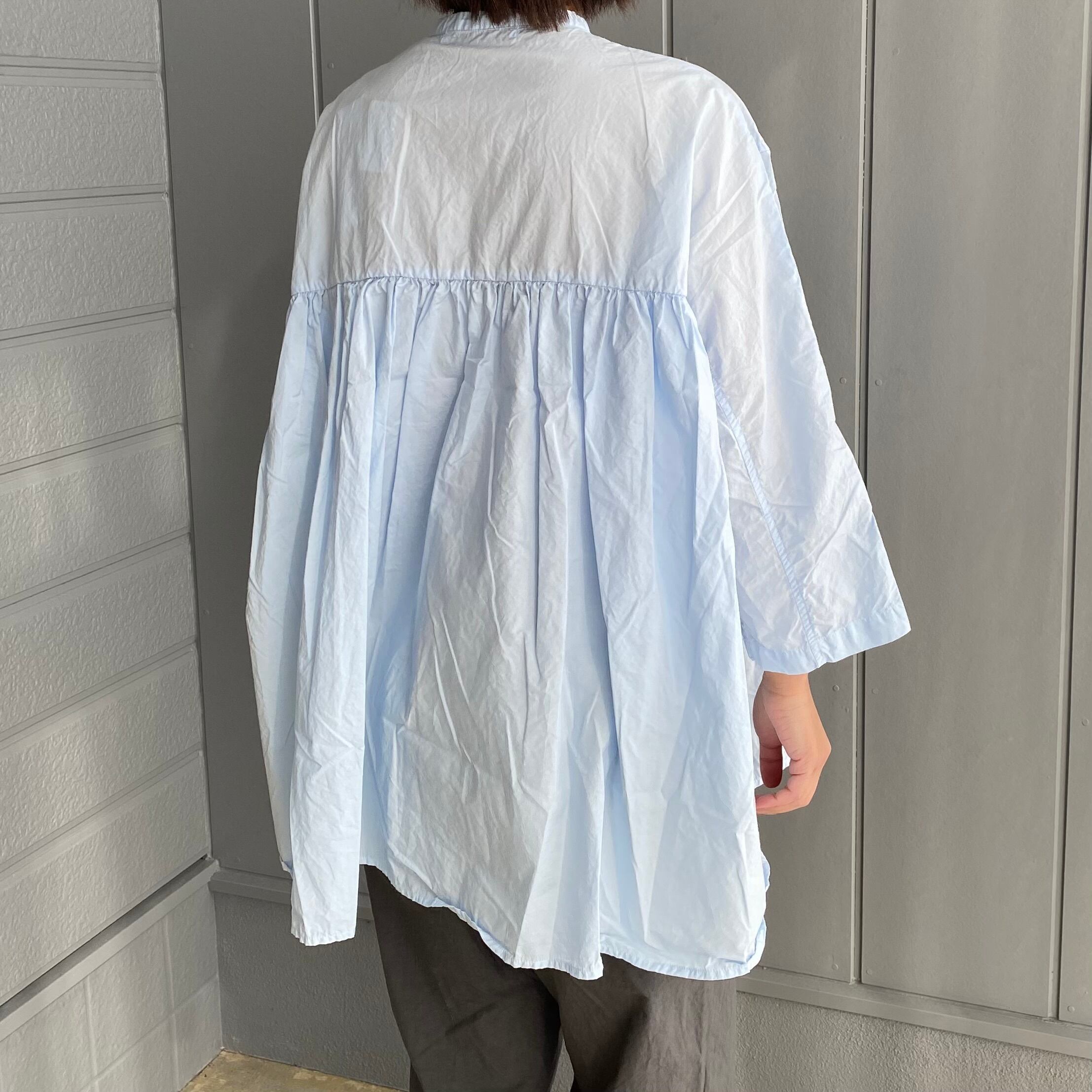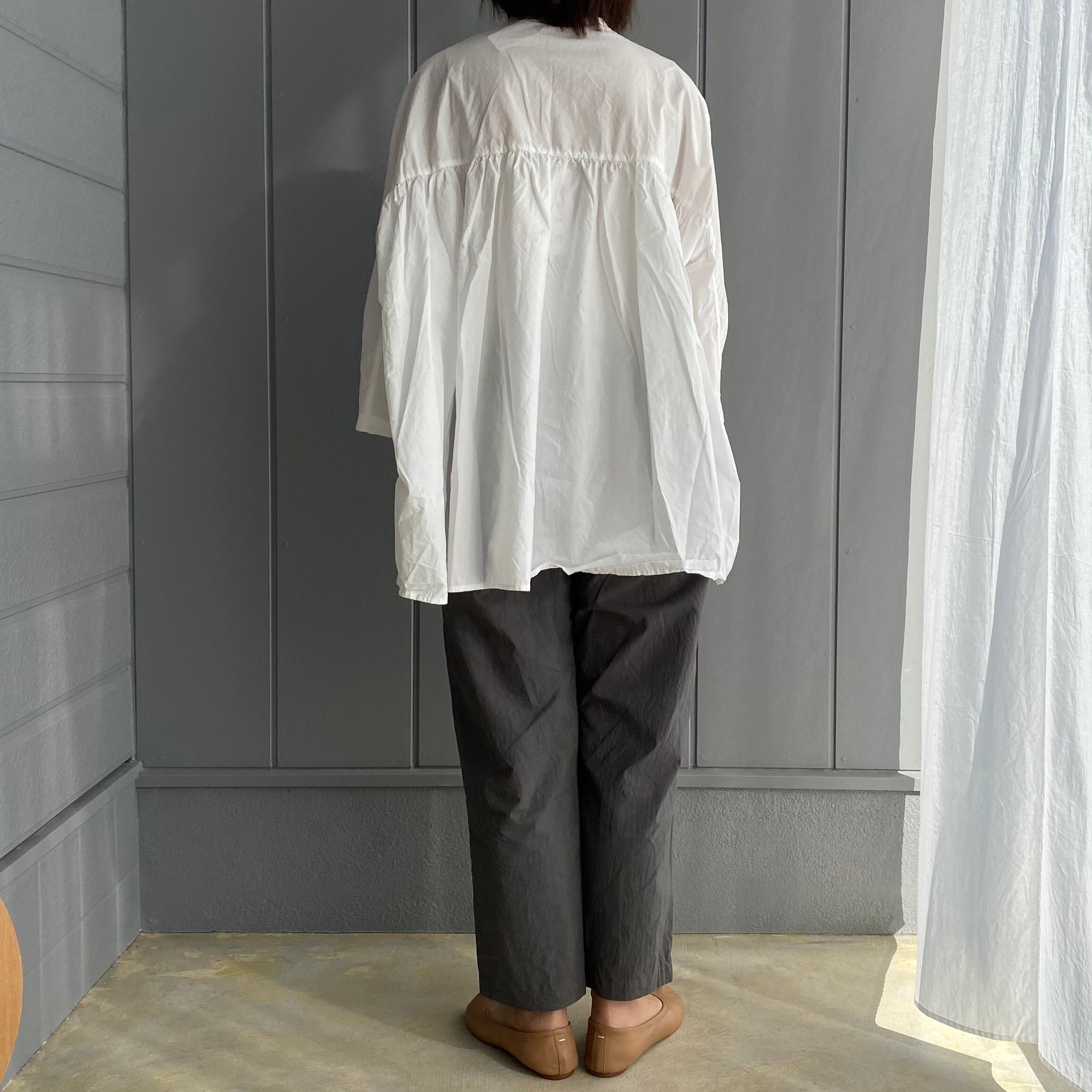 前身頃はシャツスリーブ、後身頃はギャザーの入ったヨークスリーブ。前から見るとシャツ、後ろから見るとチュニックのようなデザインです。袖は七分袖でスッキリとした印象に。前ボタンですので、軽めの羽織り物としても着用頂けます。製品染めをし、風合いの良いブラウスです。(写真モデル身長:160cm)