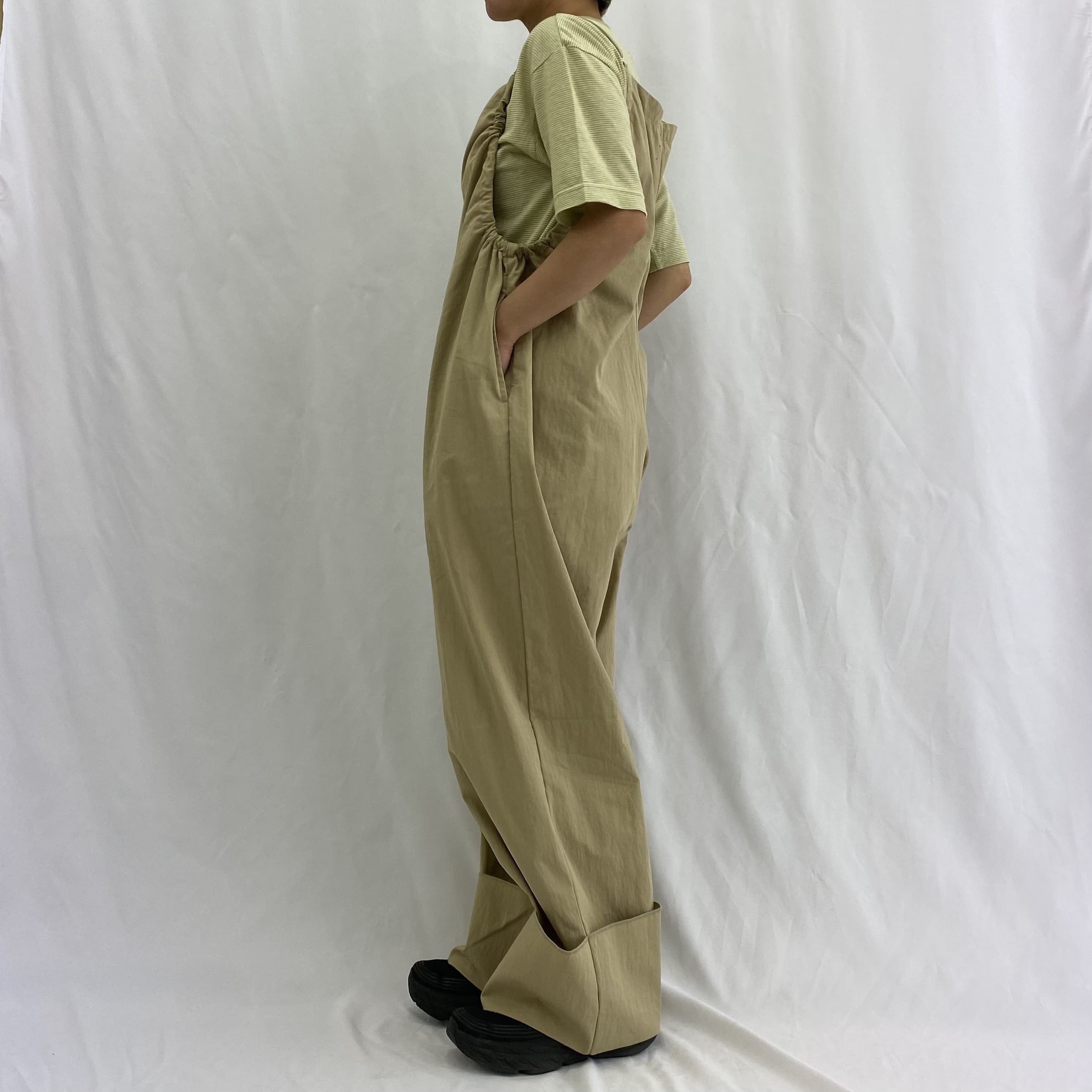 カジュアルさと上品さを兼ね備えたオールインワンができました。ギャザーを寄せたややコンパクトなトップス部分と、ワイドなパンツ部分が自然に繋がった美しいシルエット。サイドから見たとき、ギャザーのカーブがとても綺麗です。深く折り返した裾が全体を引き締めてバランスを取りやすくしています。肩紐についたアジャスターで丈を調節できるので裾直しも必要ありません。肌触りの良い生地は、コットンの柔らかな風合いとナイロンのハリとコシを合わせ持ち、シワも気になりません。表面に微起毛の加工を施し、無地の中にも豊かな表情があります。(画像モデル身長150cm)
