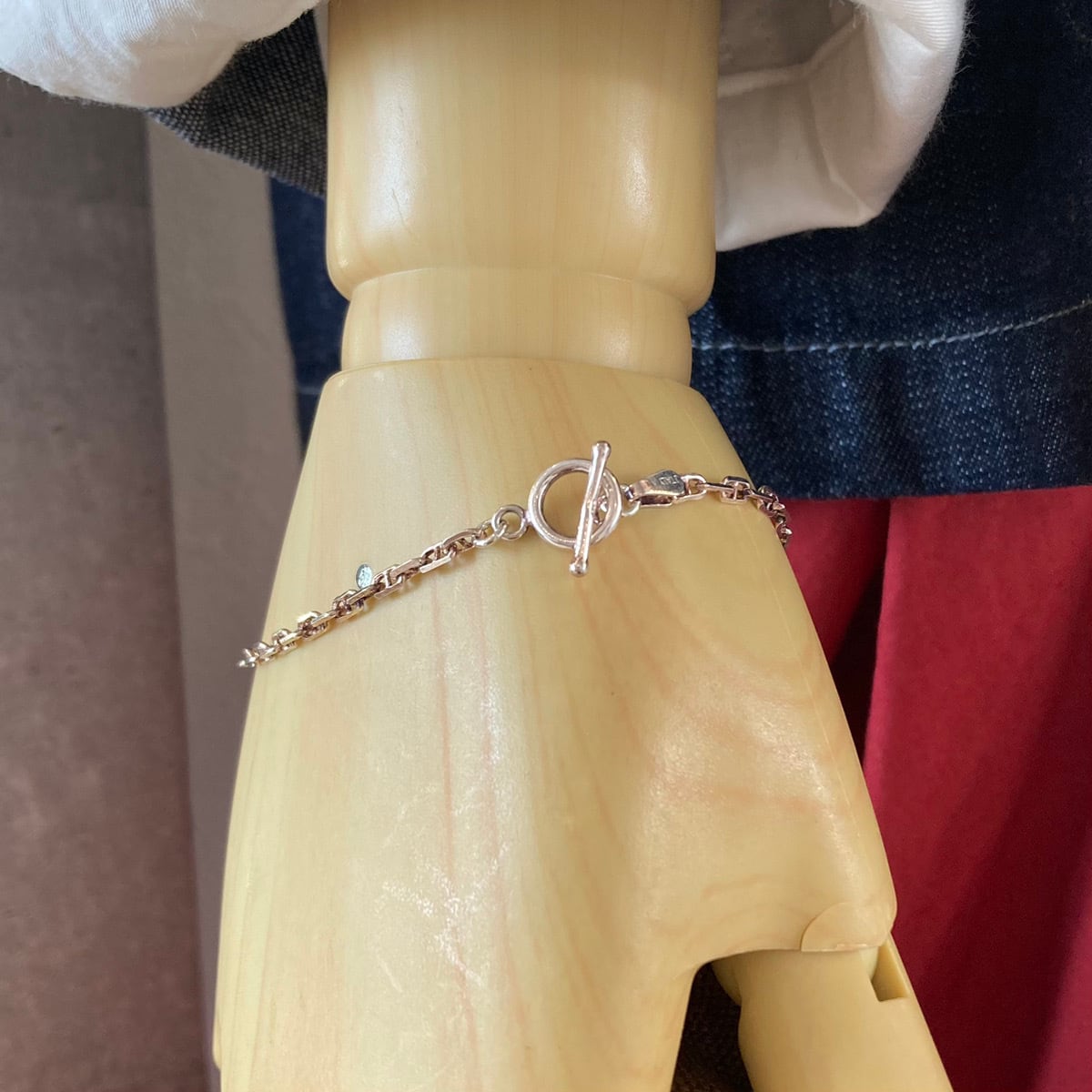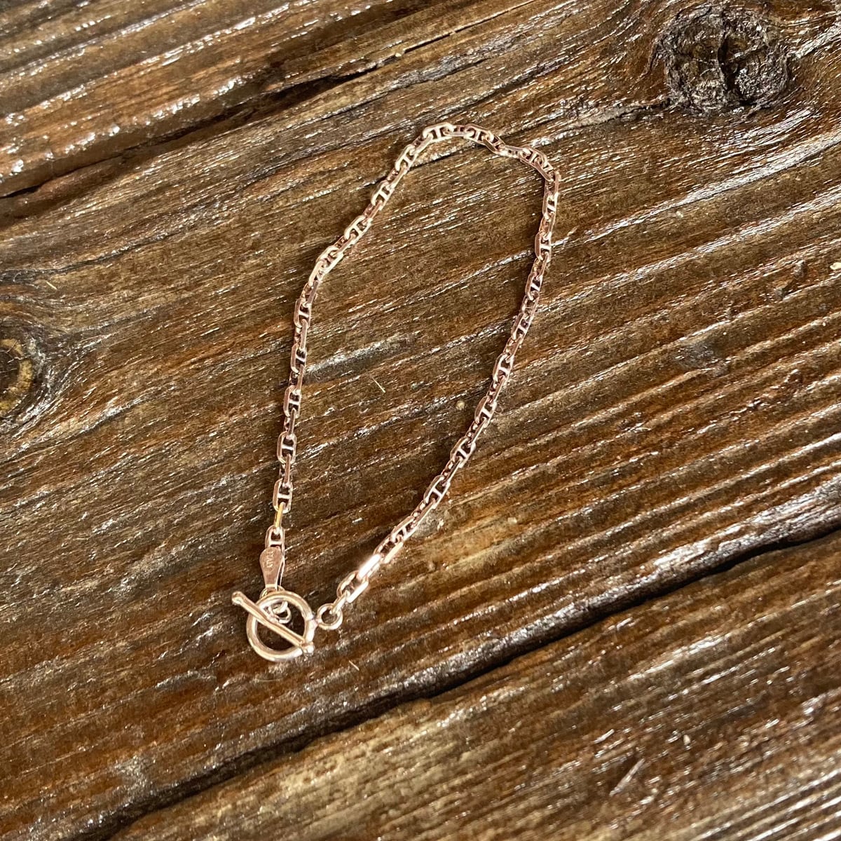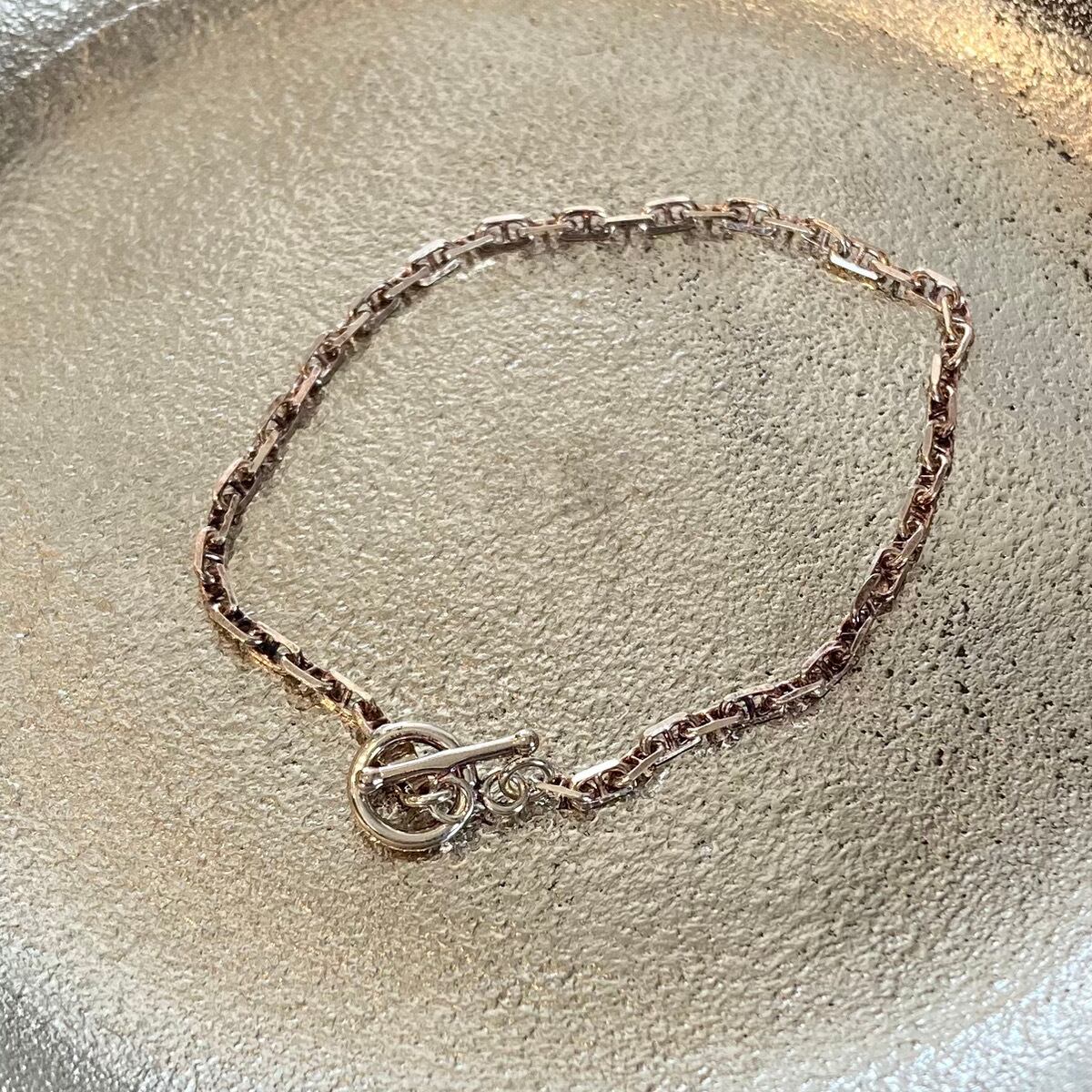 イタリアで製造されたシルバー925素材のチェーンは、目移りしてしまうほど多様なデザインと凝ったディテールが特徴で、一つひとつがとっても魅力的。シルバー925はご使用状況や保管の仕方により変色や黒ずみが起こるケースもありますがお手入れをすることで状態を保ち、長くお使いいただけます。『ロロマリーナ』という種類のチェーンを用いたブレスレット。金具にはマンテル金具を用いました。「ロロマリーナチェーン」とは、チェーンのコマの真ん中に仕切りのような棒が入った形状のチェーンで港にあるアンカーが由来。デザイン性が高いので、1本使いでも十分に存在感が楽しめます。マンテル金具もシンプルなデザインのアクセントになります。