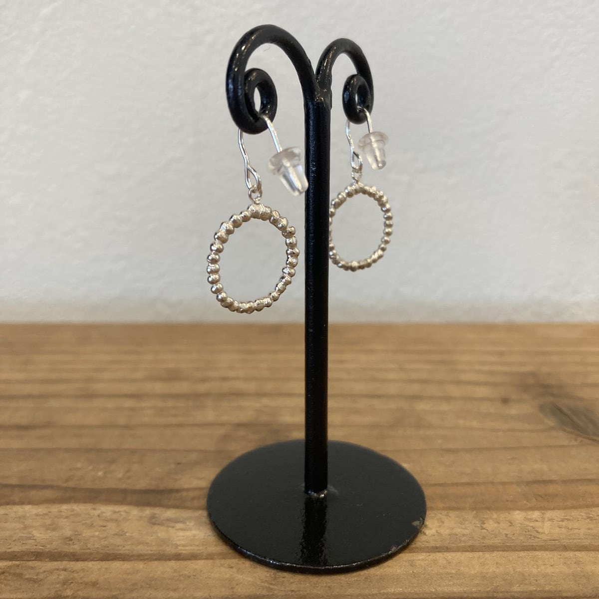 シンプルながら存在感が光る、定番のサークル型をモチーフにしたピアスです。一つ一つ形が異なる粒を並べたデザインが、優しい表情を演出します。シルバーにツヤ消し加工を施し、さりげなく輝くさまが上品な雰囲気に◎とても軽いパーツを使用しているので、痛くなりにくくストレスフリーな着け心地です。落ちにくいようにシリコンキャップも付属。カジュアルにデイリー使いはもちろん、お出掛けの際などシーンを問わず幅広く着用いただけるアクセサリーです。