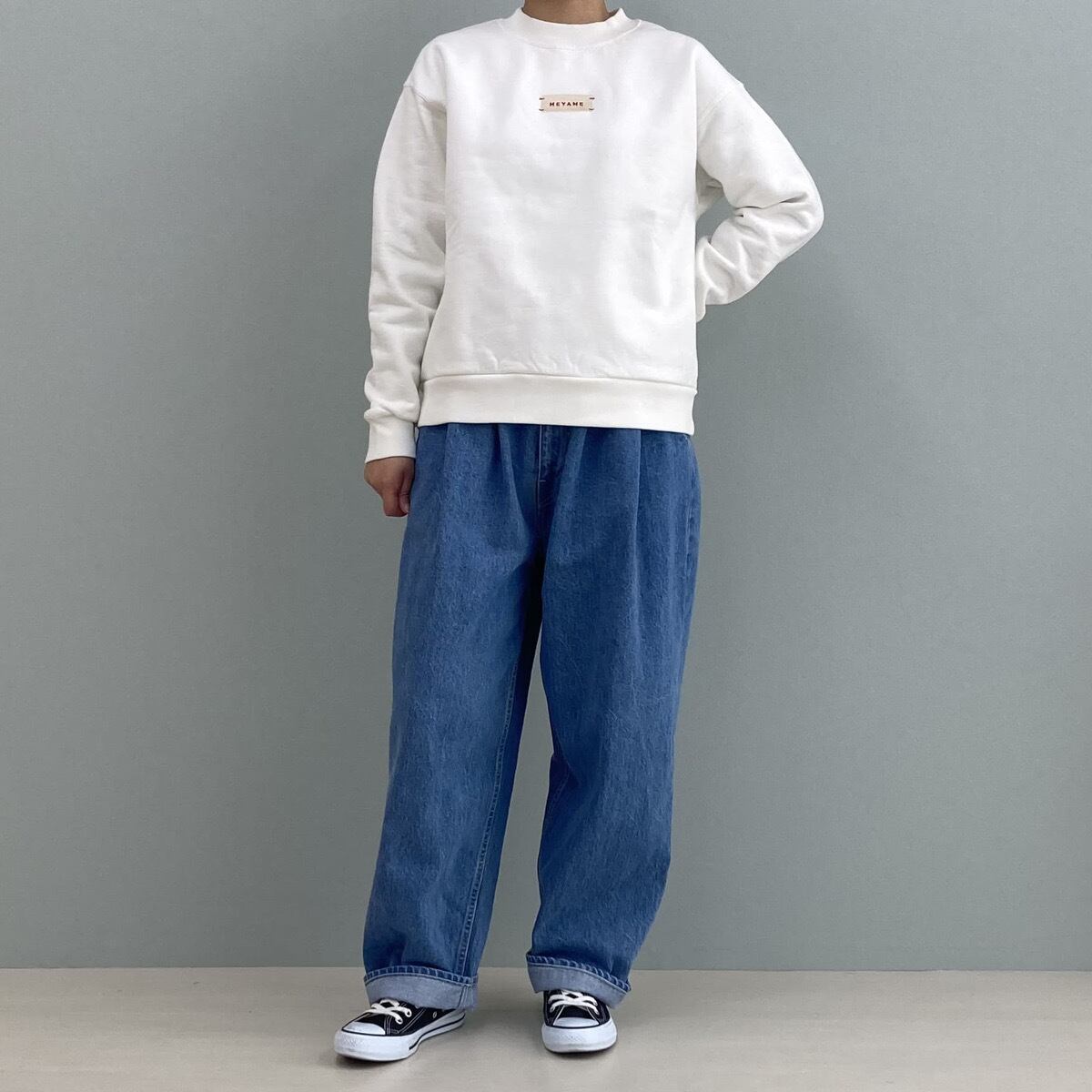 東京世田谷区梅ヶ丘にある 「シシュウブギウギ 」 とコラボレーションして MEYAME のロゴをモチーフにしたスエットを作りました。ポップ且つとても真摯に刺繍と向き合われている河瀬さんご夫妻が営む刺繍屋さんです。MEYAME のネームを刺繍で表現してもらったのですが、「赤いステッチの部分を縦で表現するか横で表現するか」といったことから始まり、全ての工程をとても丁寧に進めてくれました。スエットのボディには MEYAME らしいこだわりが詰まっています。まずはシルエット。少し肩が落ちるゆったりした身幅に、やや短めの着丈。どんなボトムスとも合わせやすいシルエットです。ワイドパンツでもフレアスカートでもいいバランスに。次に素材。着たときに守られているような安心感を覚える、やや厚手の裏起毛の生地を使用。洗いをかけることで柔らかな着心地にしています。保温性も高く、秋から春のワードローブの強い味方になってくれます。(画像モデル身長157cm)