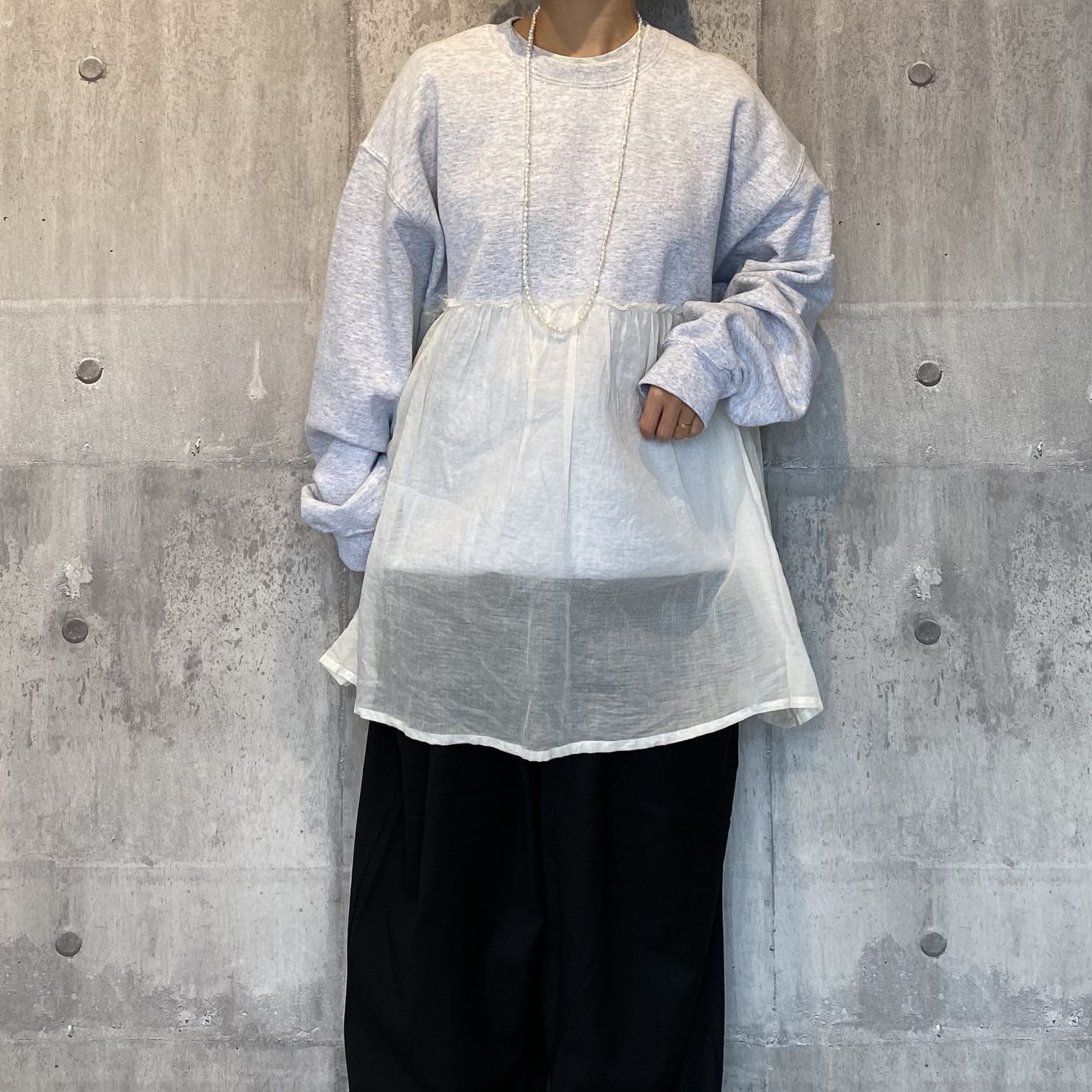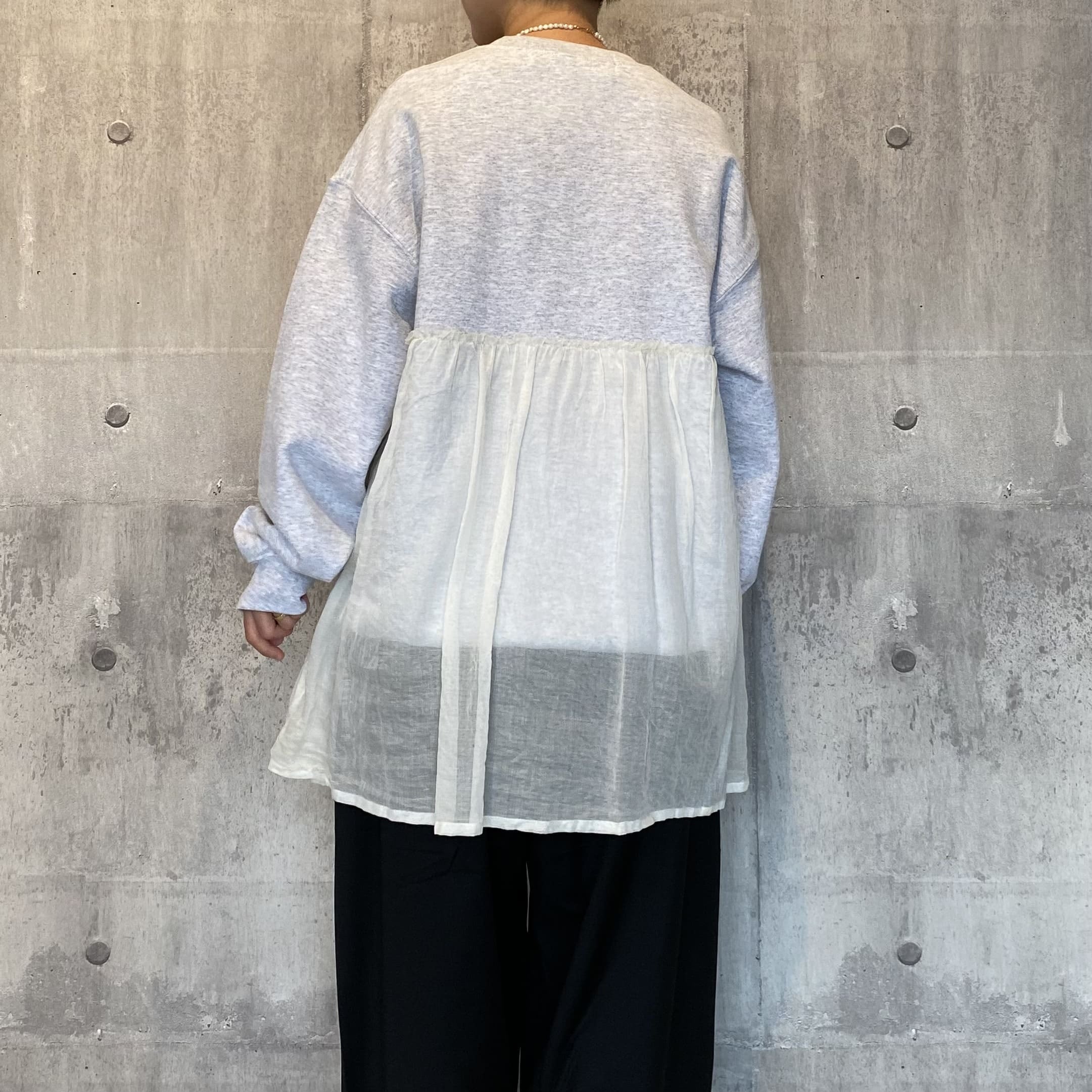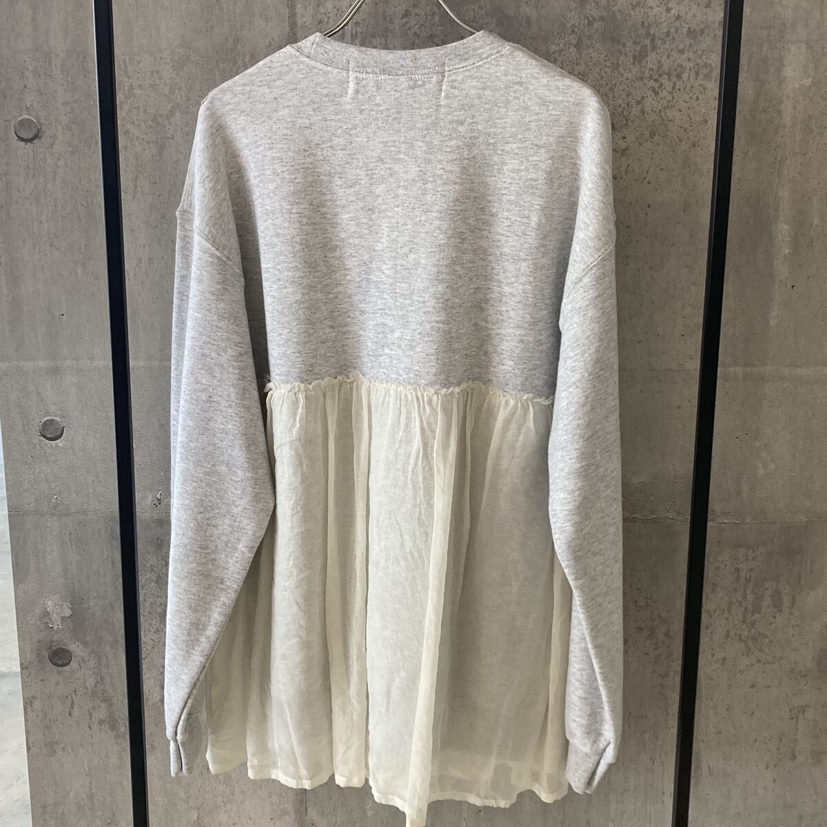 コットン、ポリエステルを混紡させた上質なスウェット生地の裏起毛を採用し、ソフトな肌触りで暖かく、着心地もとても良いです。ブラックはスウェットと同色のチュール、アッシュグレーには白系のチュールが切り替えで付いております。