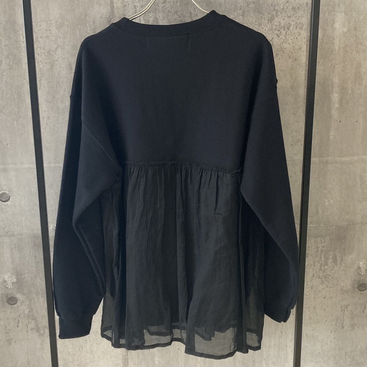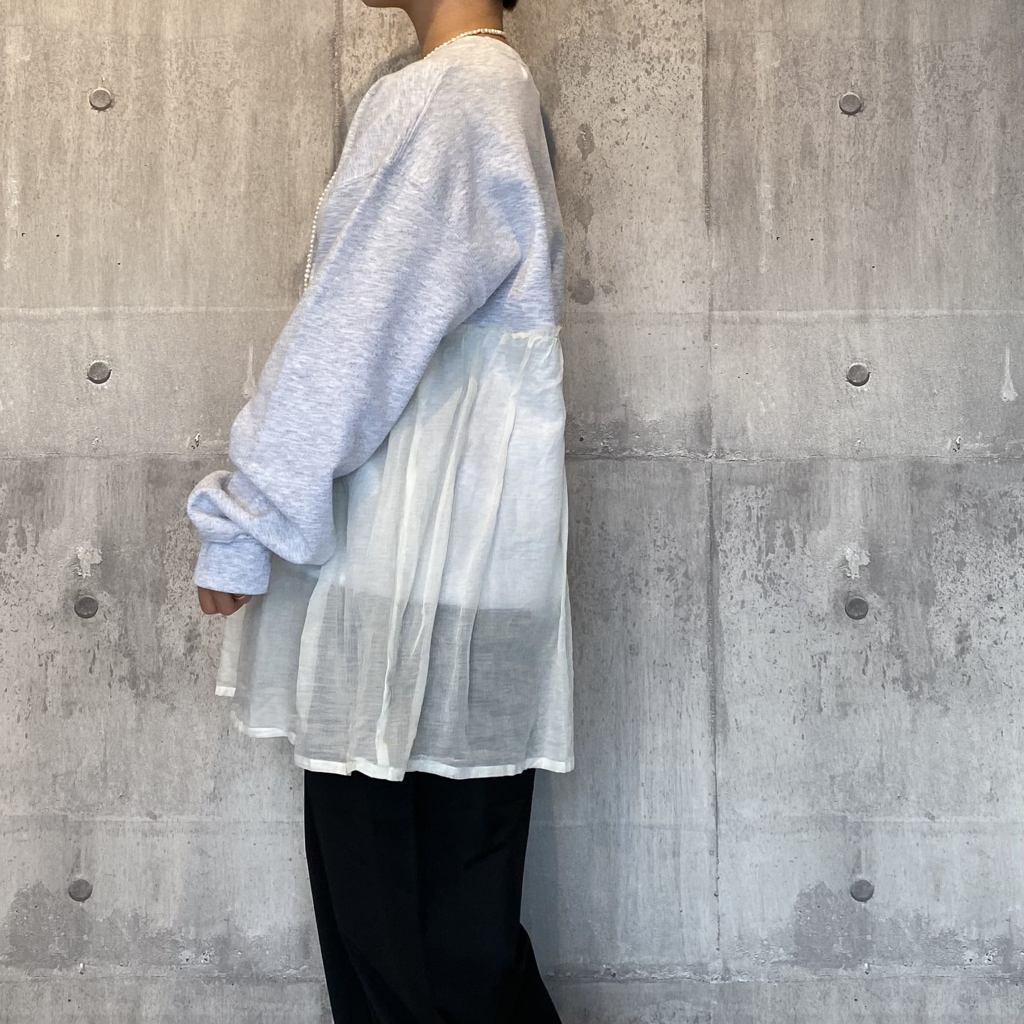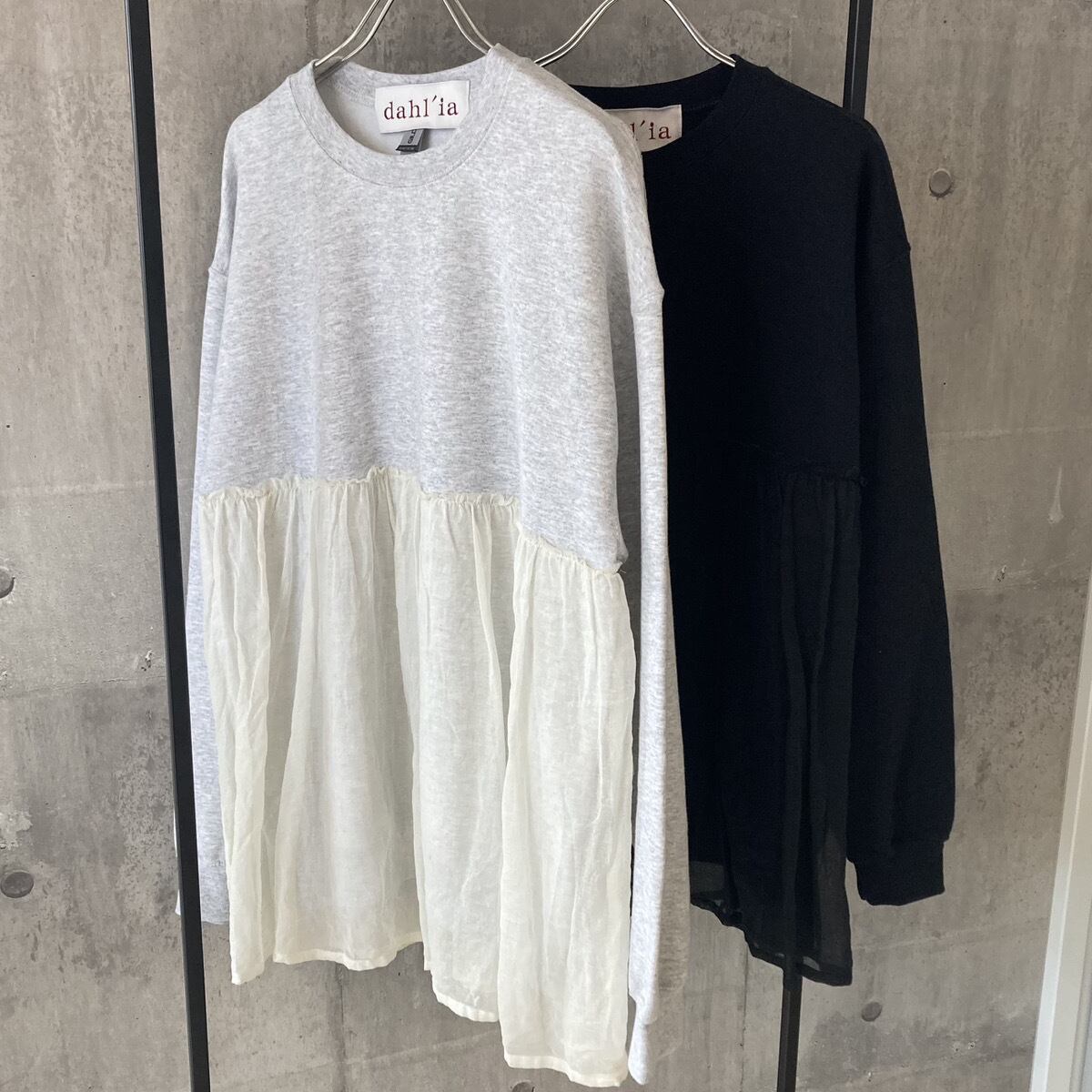 コットン、ポリエステルを混紡させた上質なスウェット生地の裏起毛を採用し、ソフトな肌触りで暖かく、着心地もとても良いです。ブラックはスウェットと同色のチュール、アッシュグレーには白系のチュールが切り替えで付いております。