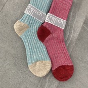 綿スラブ糸とシルクリネンのMIX糸を合わせてざっくりと厚手に編み立てたソックスです。つま先とかかとの配色がポイントでサンダルに合わせても素敵です。カジュアルスタイルの差し色におすすめの1足です。