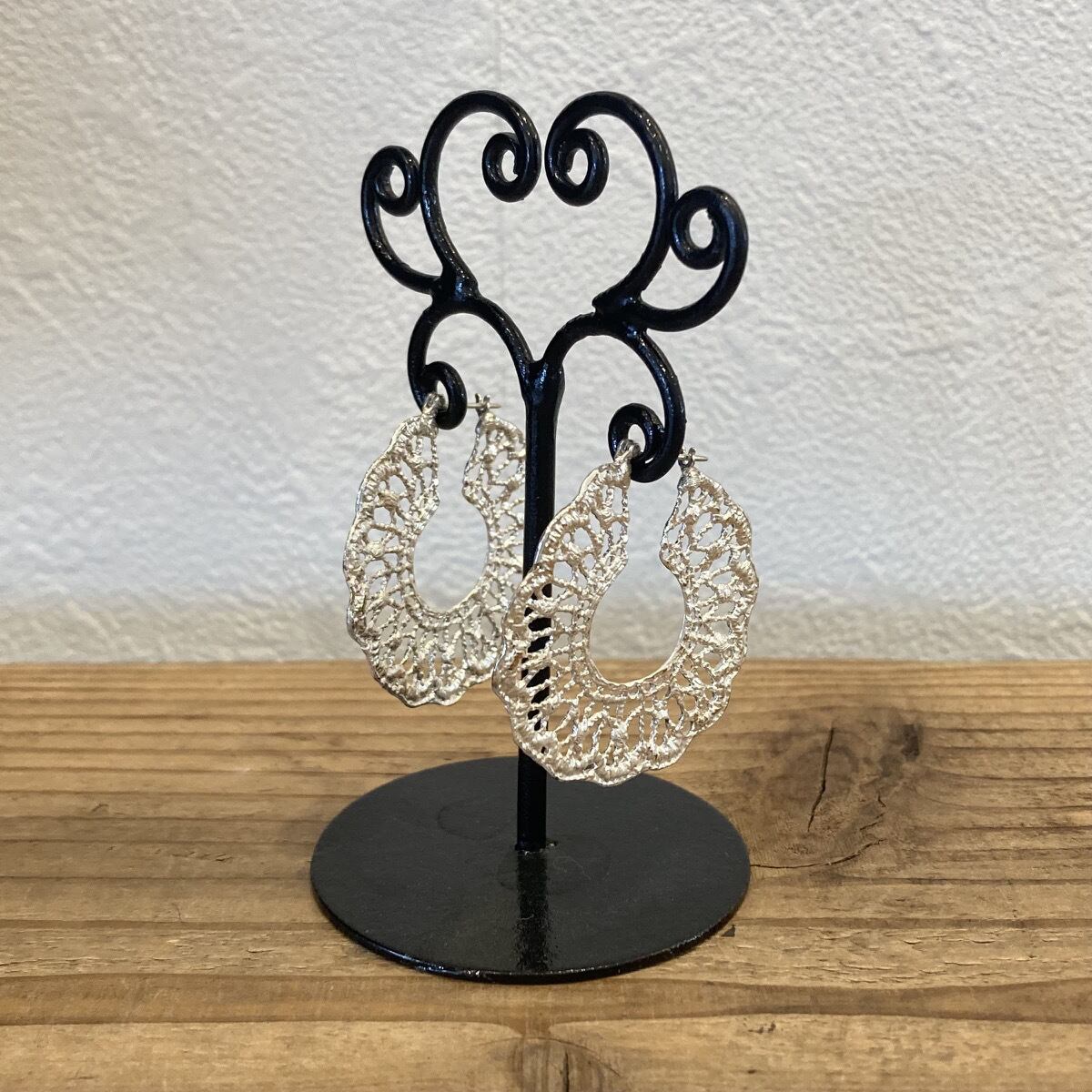ヴィンテージフリルがモチーフのハンドメイドのシルバーピアスです。本物のレースのような華やかで繊細なモチーフが目を惹きます。ボリュームがあるサイズですが、透かし模様のため見た目より軽く着けやすいです。きれいめな服装やカジュアルな普段の服装にも幅広く合わせられるピアスです。